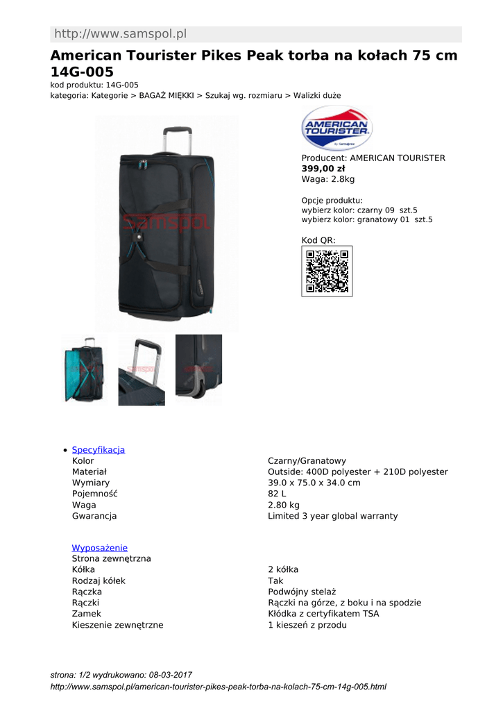 http://www.samspol.pl American Tourister Pikes Peak torba na kołach 75 cm 14G-005 kod produktu: 14G-005 kategoria: Kategorie > BAGAŻ MIĘKKI > Szukaj wg. rozmiaru > Walizki duże Producent: AMERICAN TOURISTER 399,00 zł Waga: 2.8kg Opcje produktu: wybierz kolor: czarny 09 szt.5 wybierz kolor: granatowy 01 szt.5 Kod QR: Specyfikacja Kolor Materiał Wymiary Pojemność Waga Gwarancja Czarny/Granatowy Outside: 400D polyester + 210D polyester 39.0 x 75.0 x 34.0 cm 82 L 2.80 kg Limited 3 year global warranty Wyposażenie Strona zewnętrzna Kółka Rodzaj kółek Rączka Rączki Zamek Kieszenie zewnętrzne 2 kółka Tak Podwójny stelaż Rączki na górze, z boku i na spodzie Kłódka z certyfikatem TSA 1 kieszeń z przodu strona: 1/2 wydrukowano: 08-03-2017 http://www.samspol.pl/american-tourister-pikes-peak-torba-na-kolach-75-cm-14g-005.html