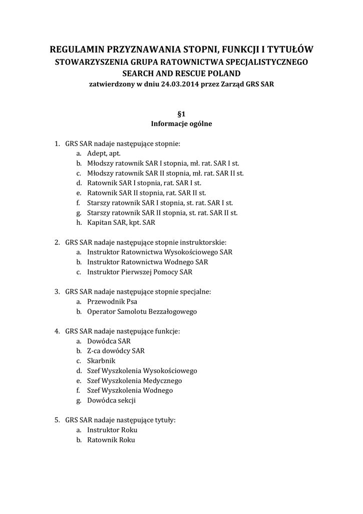 REGULAMIN PRZYZNAWANIA STOPNI, FUNKCJI I TYTUŁÓW STOWARZYSZENIA GRUPA RATOWNICTWA SPECJALISTYCZNEGO SEARCH AND RESCUE POLAND zatwierdzony w dniu 24.03.2014 przez Zarząd GRS SAR §1 Informacje ogólne 1. GRS SAR nadaje następujące stopnie: a. Adept, apt. b. Młodszy ratownik SAR I stopnia, mł. rat. SAR I st. c. Młodszy ratownik SAR II stopnia, mł. rat. SAR II st. d. Ratownik SAR I stopnia, rat. SAR I st. e. Ratownik SAR II stopnia, rat. SAR II st. f. Starszy ratownik SAR I stopnia, st. rat. SAR I st. g. Starszy ratownik SAR II stopnia, st. rat. SAR II st. h. Kapitan SAR, kpt. SAR 2. GRS SAR nadaje następujące stopnie instruktorskie: a. Instruktor Ratownictwa Wysokościowego SAR b. Instruktor Ratownictwa Wodnego SAR c. Instruktor Pierwszej Pomocy SAR 3. GRS SAR nadaje następujące stopnie specjalne: a. Przewodnik Psa b. Operator Samolotu Bezzałogowego 4. GRS SAR nadaje następujące funkcje: a. Dowódca SAR b. Z-‐ca dowódcy SAR c. Skarbnik d. Szef Wyszkolenia Wysokościowego e. Szef Wyszkolenia Medycznego f. Szef Wyszkolenia Wodnego g. Dowódca sekcji 5. GRS SAR nadaje następujące tytuły: a. Instruktor Roku b. Ratownik Roku 1. 2. 3. 4. 5. 6. 7. 8. 9. §2 Nadawanie stopni Stopnie, z wyjątkiem stopnia adepta, nadawane są przez Zarząd GRS SAR na wniosek dowódcy SAR, z-‐cy dowódcy SAR lub dowódcy sekcji. Stopień adepta automatycznie otrzymuje osoba dopuszczona do egzaminów końcowych podczas rekrutacji do GRS SAR. Stopnie można nadać jedynie w przypadku, kiedy kandydat do stopnia posiada rozpoczęty rok służby, liczony od dnia zdania egzaminów: a. W przypadku rat. SAR I i II st. – rozpoczęty drugi rok służby; b. W przypadku st. rat. SAR I i II st. – rozpoczęty trzeci rok służby; c. W przypadku kpt. SAR – rozpoczęty czwarty rok służby. Stopnie nadawane są w oparciu o ocenę zaangażowania, wiedzy i umiejętności kandydata. Otrzymanie stopnia rat. SAR I st. lub wyższego wymaga od kandydata okazania Karty Taternika Jaskiniowego oraz potwierdzenia ukończenia kursu Kwalifikowanej Pierwszej Pomocy. Otrzymanie stopnia st. rat. SAR I st. lub wyższego wymaga od kandydata posiadania dowolnych uprawnień instruktorskich uznanych przez Zarząd GRS SAR za przydatne w działalności grupy. Otrzymanie stopnia kpt. SAR może nastąpić jedynie poprzez jednogłośną decyzję Zarządu GRS SAR. Stopnie oznacza się na mundurach GRS SAR poprzez noszenie czarnych pagonów ze złotym obszyciem, zgodnie z zestawieniem: STOPIEŃ OZNACZENIE APT. Czarny pagon MŁ RAT. SAR I ST. I MŁ RAT. SAR II ST. II RAT. SAR I ST. > RAT. SAR II ST. >> ST. RAT. SAR I ST. * ST. RAT. SAR II ST. ** KPT. SAR **** Pozbawienie stopnia następuje po decyzji Zarządu GRS SAR, na wniosek dowódcy SAR lub z-‐cy dowódcy SAR. §3 Nadawanie stopni instruktorskich 1. 2. 3. 4. Stopnie instruktorskie nadawane są przez Zarząd GRS SAR na wniosek dowódcy SAR. Stopnie instruktorskie nadawane są w oparciu o ocenę wiedzy, doświadczenia oraz kwalifikacji i umiejętności pozwalających na samodzielne prowadzenie szkoleń z zakresu technik linowych, ratownictwa wysokościowego, ratownictwa wodnego lub pierwszej pomocy. Stopnie instruktorskie oznaczane są poprzez wszycie naszywki „INSTRUKTOR RATOWNICTWA SPECJALISTYCZNEGO” na lewym ramieniu munduru. Pozbawienie stopnia instruktorskiego następuje po decyzji Zarządu GRS SAR, na wniosek dowódcy SAR, z-‐cy dowódcy SAR lub Szefa Wyszkolenia odpowiadającego za danego instruktora. 1. 2. 3. 4. 5. §4 Nadawanie stopni specjalnych Stopnie specjalne nadawane są przez Zarząd GRS SAR na wniosek dowódcy SAR lub z-‐cy dowódcy SAR. Stopień przewodnika psa może uzyskać osoba posiadająca co najmniej stopień mł. rat. SAR I st. oraz wykazująca odpowiednie umiejętności do prowadzenia działań poszukiwawczych z wykorzystaniem psów. Stopień operatora samolotu bezzałogowego może uzyskać osoba posiadająca co najmniej stopień mł. rat. SAR I st. oraz wykazująca odpowiednie umiejętności do prowadzenia działań poszukiwawczych z wykorzystaniem samolotów bezzałogowych. Stopnie specjalne oznaczane są poprzez wszycie naszywki „PRZEWODNIK PSA” lub „OPERATOR SAMOLOTU BEZZAŁOGOWEGO” na lewym ramieniu munduru. Pozbawienie stopnia specjalnego następuje po decyzji Zarządu GRS SAR, na wniosek dowódcy SAR lub z-‐cy dowódcy SAR. 1. 2. 3. 4. 5. §4 Nadawanie funkcji Funkcję dowódcy SAR obejmuje automatycznie prezes stowarzyszenia GRS SAR. Funkcję z-‐cy dowódcy SAR obejmuje automatycznie v-‐ce prezes stowarzyszenia GRS SAR. Funkcję skarbnika SAR obejmuje automatycznie skarbnik stowarzyszenia GRS SAR. Funkcje Szefa Wyszkolenia nadawane są przez Zarząd GRS SAR na wniosek dowódcy SAR. Funkcje oznacza się na mundurach GRS SAR zgodnie z zestawieniem: 6. 1. 2. 3. 1. 2. 3. FUNKCJA OZNACZENIE DOWÓDCA SAR Czarna taśma wszyta na prawym ramieniu munduru Z-‐CA DOWÓDCY SAR Niebieska taśma wszyta na prawym ramieniu munduru DOWÓDCA SEKCJI Czerwona taśma wszyta na prawym ramieniu munduru SKARBNIK Brak SZEF WYSZKOLENIA Żółta taśma wszyta na lewym ramieniu munduru Odwołanie z funkcji dowódcy sekcji lub Szefa Wyszkolenia następuje po decyzji Zarządu GRS SAR, na wniosek dowódcy SAR lub z-‐cy dowódcy SAR. §5 Nadawanie tytułów Tytuły nadawane są przez Zarząd GRS SAR co roku. Tytuły nadawane są w wyniku głosowania tajnego przeprowadzanego przed świętem grupy. Tytuły wręcza dowódca SAR lub z-‐ca dowódcy SAR podczas święta grupy. §6 Postanowienia końcowe Wszystkich stopni i tytułów może zrzec się osoba je posiadająca. Osoba posiadająca stopień lub tytuł nadany przez Zarząd GRS SAR może go używać poza grupą. Wzory naszywek przedstawia załącznik do niniejszego regulaminu. fi= 8cm fi= 8cm