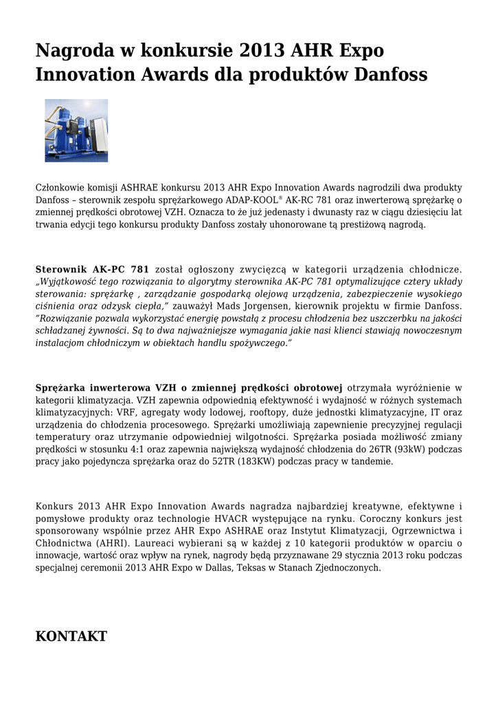 Nagroda w konkursie 2013 AHR Expo Innovation Awards dla produktów Danfoss Członkowie komisji ASHRAE konkursu 2013 AHR Expo Innovation Awards nagrodzili dwa produkty Danfoss – sterownik zespołu sprężarkowego ADAP-KOOL® AK-RC 781 oraz inwerterową sprężarkę o zmiennej prędkości obrotowej VZH. Oznacza to że już jedenasty i dwunasty raz w ciągu dziesięciu lat trwania edycji tego konkursu produkty Danfoss zostały uhonorowane tą prestiżową nagrodą. Sterownik AK-PC 781 został ogłoszony zwycięzcą w kategorii urządzenia chłodnicze. „Wyjątkowość tego rozwiązania to algorytmy sterownika AK-PC 781 optymalizujące cztery układy sterowania: sprężarkę , zarządzanie gospodarką olejową urządzenia, zabezpieczenie wysokiego ciśnienia oraz odzysk ciepła,” zauważył Mads Jorgensen, kierownik projektu w firmie Danfoss. ”Rozwiązanie pozwala wykorzystać energię powstałą z procesu chłodzenia bez uszczerbku na jakości schładzanej żywności. Są to dwa najważniejsze wymagania jakie nasi klienci stawiają nowoczesnym instalacjom chłodniczym w obiektach handlu spożywczego.” Sprężarka inwerterowa VZH o zmiennej prędkości obrotowej otrzymała wyróżnienie w kategorii klimatyzacja. VZH zapewnia odpowiednią efektywność i wydajność w różnych systemach klimatyzacyjnych: VRF, agregaty wody lodowej, rooftopy, duże jednostki klimatyzacyjne, IT oraz urządzenia do chłodzenia procesowego. Sprężarki umożliwiają zapewnienie precyzyjnej regulacji temperatury oraz utrzymanie odpowiedniej wilgotności. Sprężarka posiada możliwość zmiany prędkości w stosunku 4:1 oraz zapewnia największą wydajność chłodzenia do 26TR (93kW) podczas pracy jako pojedyncza sprężarka oraz do 52TR (183KW) podczas pracy w tandemie. Konkurs 2013 AHR Expo Innovation Awards nagradza najbardziej kreatywne, efektywne i pomysłowe produkty oraz technologie HVACR występujące na rynku. Coroczny konkurs jest sponsorowany wspólnie przez AHR Expo ASHRAE oraz Instytut Klimatyzacji, Ogrzewnictwa i Chłodnictwa (AHRI). Laureaci wybierani są w każdej z 10 kategorii produktów w oparciu o innowacje, wartość oraz wpływ na rynek, nagrody będą przyznawane 29 stycznia 2013 roku podczas specjalnej ceremonii 2013 AHR Expo w Dallas, Teksas w Stanach Zjednoczonych. KONTAKT Danfoss Poland Sp. z o.o