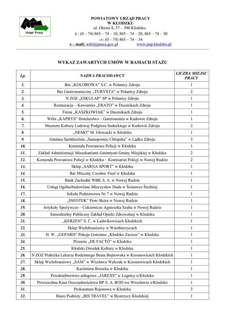 Urząd Pracy POWIATOWY URZĄD PRACY W KŁODZKU ul. Okrzei 8, 57 – 300 Kłodzko, : (0 – 74) 865 – 74 – 10, 865 – 74 – 20, 865 – 74 – 30 : (0 – 74) 865 – 74 – 34 e – mail: [email protected] www.pup.klodzko.pl WYKAZ ZAWARTYCH UMÓW W RAMACH STAŻU Lp. NAZWA PRACODAWCY LICZBA MIEJSC PRACY 1. Bar „KOLOROWA” S.C. w Polanicy Zdroju 1 2. Bar Gastronomiczny „TURYSTA” w Polanicy Zdroju 2 3. N ZOZ „ESKULAP” SP w Polanicy Zdroju 1 4. Restauracja – Kawiarnia „ERATO” w Dusznikach Zdroju 1 5. Firma „KASZKOWIAK” w Dusznikach Zdroju 1 6. Willa „KAPRYS” Hotelarstwo – Gastronomia w Kudowie Zdroju 1 7. Muzeum Kultury Ludowej Podgórza Sudeckiego w Kudowie Zdroju 2 8. „NEMO” M. Głowacki w Kłodzku 1 9. Gminna Spółdzielnia „Samopomoc Chłopska” w Lądku Zdroju 3 10. Komenda Powiatowa Policji w Kłodzku 1 11. Zakład Administracji Mieszkaniami Gminnymi Gminy Miejskiej w Kłodzku 2 12. Komenda Powiatowa Policji w Kłodzku – Komisariat Policji w Nowej Rudzie 2 13. Sklep „SARNA SPORT” w Kłodzku 1 14. Bar Mleczny Czesław Fisel w Kłodzku 1 15. Bank Zachodni WBK S. A. w Nowej Rudzie 1 16. Usługi Ogólnobudowlane Mieczysław Duda w Ścinawce Średniej 1 17. Szkoła Podstawowa Nr 7 w Nowej Rudzie 1 18. „INFOTEK” Piotr Skóra w Nowej Rudzie 1 19. Artykuły Spożywczo – Cukiernicze Agnieszka Szuba w Nowej Rudzie 1 20. Samodzielny Publiczny Zakład Opieki Zdrowotnej w Kłodzku 1 21. „KERZEN” S. C. w Ludwikowicach Kłodzkich 1 22. Sklep Wielobranżowy w Wambierzycach 1 23. H. W. „GEPARD” Pokoje Gościnne „Kłodzko Zacisze” w Kłodzku 1 24. Pizzeria „DE FACTO” w Kłodzku 1 25. Kłodzki Ośrodek Kultury w Kłodzku 1 26. N ZOZ Praktyka Lekarza Rodzinnego Beata Bujnowska w Krosnowicach Kłodzkich 1 27. Sklep Wielobranżowy „SAM” w Wiesława Walczak w Krosnowicach Kłodzkich 1 28. Kazimiera Borecka w Kłodzku 1 29. Przedsiębiorstwo usługowe „JAREXS” w Legnicy o/Kłodzko 1 30. Powszechna Kasa Oszczędnościowa BP S. A. ROD we Wrocławiu o/Kłodzko 1 31. Prokuratura Rejonowa w Kłodzku 3 32. Biuro Podróży „BIS TRAVEL” w Bystrzycy Kłodzkiej 1 33. Komenda Powiatowa Policji w Kłodzku 2 34. U. S. K. „SPEC – KAN” w Kłodzku 1 35. Sąd Rejonowy w Kłodzku 6 36. Studio Solarium Drogeria Tipsy Julita Korbas w Nowej Rudzie 1 37. Gabinet Kosmetyczny Marek Dobrzyniecki w Nowej Rudzie 1 38. „KWM” Odzież Dziecięca Małgorzata Szczutka w Nowej Rudzie 1 39. Firma „E – PROGRESS” Urszula Grygorcewicz w Nowej Rudzie 1 40. Sklep Wielobranżowy Ryszard Bugajski w Nowej Rudzi 1 41. Piekarnictwo Krzysztof Fiszer w Bożkowie 1 42. Działalność Handlowa Art. Spożywczymi Marek Kraszkiewicz w Nowej Rudzie 1 43. Firma Handlowo – Usługowa Antoni Wacyk w Wambierzycach 1 44. P. P. H. U. Piotr Polak w Ludwikowicach Kłodzkich 1 45. Dom Pomocy Społecznej w Ludwikowicach Kłodzkich 1 46. Gminna Spółdzielnia „Samopomoc Chłopska” w Lądku Zdroju 1 47. Urząd Miejski i Gminy w Bystrzycy Kłodzkiej 2 48. Centrum Usług Turystycznych „PODRÓŻE MARZEŃ” w Bystrzycy Kłodzkiej 1 49. Europejskie Forum Młodzieży w Bystrzycy Kłodzkiej 2 50. „MOTOR JAR” Burek Jarosław w Stroniu Śląskim 1 51. Gminna Spółdzielnia „Samopomoc Chłopska” w Lądku Zdroju 1 52. Zespół Szkolnych Schronisk Młodzieżowych w Kletnie 1 53. Przedsiębiorstwo Handlowo Usługowe Lucyna Burzyńska w Domaszkowie 1 54. P. P. H. U. „STOLAR” w Międzylesiu 1 55. „ALKA” Alicja Bogdańska w Bystrzycy Kłodzkiej 1 56. Usługi Transportowe Dariusz Świerczewski w Długopolu Zdrój 1 57. Urząd Gminy w Kłodzku 1 58. Usługi Ogólnobudowlane Sławomir Mazurek w Dusznikach Zdroju 2 59. „EXPERT” Edyta Winiarska – Strzelecka w Kłodzku 2 60. Usługi budowlane Instalacje Budowlane 1 61. Poczta Polska Centrum Sieci Pocztowej Oddz. Rej. w Wałbrzychu U. P. Kłodzko 1 62. „SZECHEREZADA” Świat Biżuterii M. Brambor w Kudowie Zdroju 1 63. „OMEGA” S. C. Monika, Mariusz Pachuta w Kłodzku 1 64. „MODNY PAN” Kajdanowicz B. M. w Bystrzycy Kłodzkiej 1 65. Sklep Odzieżowy „NICOL” w Długopolu Dolnym 1 66. Zakład Budowlany „AVO” Andrzej Wołoszyn w Bystrzycy Kłodzkiej 1 67. Przecieranie Drewna Edward Szarota w Międzylesiu 1 68. Zarząd Budynków Komunalnych w Bystrzycy Kłodzkiej 1 69. P. P. H. U. „er – But” w Bystrzycy Kłodzkiej 1 70. Firma Handlowo – Usługowa A. A. Kaczorowscy w Bystrzycy Kłodzkiej 1 71. Zakład Instalacyjno – Budowlanych Bałuszek S. w Bystrzycy Kłodzkiej 1 72. Zakład Gospodarki Komunalnej i Mieszkaniowej w Międzylesiu 1 73. Sprzedaż Detaliczna Żywności R. Dzianach w Bystrzycy Kłodzkiej 1 74. Zakład Gospodarki Komunalnej i Mieszkaniowej w Międzylesiu 1 75. Zakład Kosmetyczno – Fryzjerski Bogdan Głąba w Bystrzycy Kłodzkiej 1 76. Firma „HTM” Usługi Ogólnobudowlane i Projektowe w Kłodzku 1 77. „TERMIX” Krystian Cul w Polanicy Zdroju 1 78. Zasadnicza Szkoła Zawodowa Specjalna w Kłodzku 1 79. Urząd Gminy w Kłodzku 1 80. Urząd Miasta i Gminy w Szczytnej 2 81. Specjalistyczne Centrum Medyczne w Polanicy Zdroju 3 82. Restauracja – Kawiarnia „ZDROJOWA” Usługi Gastronomiczne w Polanicy Zdroju 2 83. P. H. U. „ABIS” S. C. w Nowej Rudzie 1 84. Urząd Miasta i Gminy w Radkowie 4 85. P. H. U. Radków Noclegi „CZARODZIEJSKI MŁYN” we Wrocławiu o/Radków 1 86. Urząd Miasta w Kudowie Zdroju 1 87. P. H. U. „EXPANSJA” w Bystrzycy Kłodzkiej 1 88. Firma Handlowo – Usługowa Czerniawski w Lądku Zdroju 1 89. Dom Pomocy Społecznej w Bystrzycy Kłodzkiej 1 90. Specjalistyczne Centrum Medyczne w Polanicy Zdroju 1 91. „L – B” S. C. w Międzylesiu 1 92. Zarząd Budynków Komunalnych w Lądku Zdroju 1 93. Urząd Miasta i Gminy w Bystrzycy Kłodzkiej 3 94. „MD” Daniel Mikunda w Idzikowie 1 95. Samorządowe Przedszkole w Międzylesiu 1 96. Restauracja „BOGUSZYN” w Kłodzku 1 97. Szkoła Podstawowa Nr 3 w Kłodzku 1 98. Sklep „SCHICK” w Kłodzku 2 99.