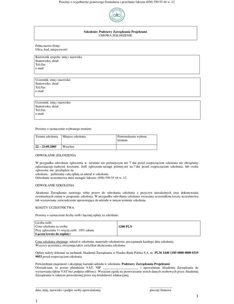 Prosimy o wypełnienie poni szego formularza i przesłanie faksem (058) 550 55 44 w. 12 Szkolenie: Podstawy Zarz dzania Projektami UMOWA ZGŁOSZENIE Pełna nazwa firmy: Ulica, kod, miejscowo : Kierownik zespołu: imi i nazwisko Stanowisko, dział Tel./fax e-mail Uczestnik: imi i nazwisko Stanowisko, dział Tel./fax e-mail Uczestnik: imi i nazwisko Stanowisko, dział Tel./fax e-mail Prosimy o zaznaczenie wybranego terminu: Termin szkolenia Miejsce szkolenia 22 – 23.09.2005 Wrocław Potwierdzenie wyboru terminu ODWOŁANIE ZGŁOSZENIA W przypadku odwołania zgłoszenia w terminie nie pó niejszym ni 7 dni przed rozpocz ciem szkolenia nie obci amy zgłaszaj cego adnymi kosztami. Je li zgłoszenie nast pi pó niej ni na 7 dni przed rozpocz ciem szkolenia, lub osoba zgłoszona nie przyb dzie na szkolenie, pobieramy cał opłat za udział w szkoleniu. Odwołanie uczestnictwa musi nast pi faksem: (058) 550 55 44 w. 12. ODWOŁANIE SZKOLENIA Akademia Zarz dzania zastrzega sobie prawo do odwołania szkolenia z przyczyn niezale nych oraz dokonywania ewentualnych zmian w programie szkolenia. W przypadku odwołania szkolenia zwracamy uczestnikom koszty uczestnictwa lub wystawiamy za wiadczenie uprawniaj ce do udziału w innym terminie szkolenia. KOSZTY UCZESTNICTWA Prosimy o zaznaczenie liczby osób i ł cznej opłaty za szkolenie: Liczba osób: Cena szkolenia za osob : Przy zgłoszeniu 3 i wi cej osób: -10% rabatu Ł czna kwota do zapłaty: 1200 PLN Cena szkolenia obejmuje: udział w szkoleniu, materiały szkoleniowe, pocz stunek ka dego dnia szkolenia. Wszyscy uczestnicy otrzymuj tak e certyfikat uko czenia szkolenia. Opłaty nale y dokona na rachunek Akademii Zarz dzania w Nordea Bank Polska S.A. nr PL36 1440 1185 0000 0000 0319 9053 przed rozpocz ciem szkolenia. Potwierdzam znajomo i akceptuj warunki udziału w szkoleniu: Podstawy Zarz dzania Projektami O wiadczam, e jestem płatnikiem VAT, NIP ______________________ i upowa niam Akademi Zarz dzania do wystawiania faktur VAT bez podpisu odbiorcy. Wyra am zgod na przetwarzanie moich danych osobowych przez Akademi Zarz dzania w zakresie prowadzonej przez ni działalno ci edukacyjnej. _________________________________________ data, imi , nazwisko i podpis osoby upowa nionej 1 ______________ piecz firmowa 1