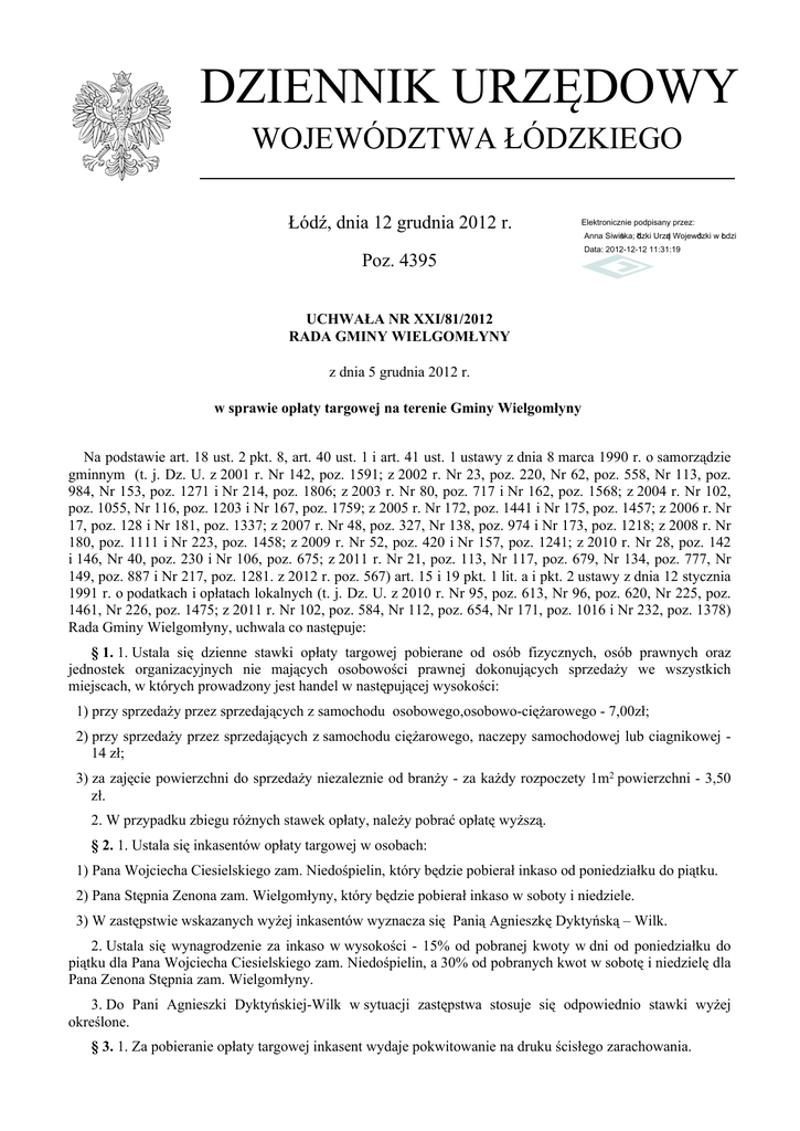 DZIENNIK URZĘDOWY WOJEWÓDZTWA ŁÓDZKIEGO Łódź, dnia 12 grudnia 2012 r. Elektronicznie podpisany przez: Anna Siwińska; Łódzki Urząd Wojewódzki w Łodzi Poz. 4395 Data: 2012-12-12 11:31:19 UCHWAŁA NR XXI/81/2012 RADA GMINY WIELGOMŁYNY z dnia 5 grudnia 2012 r. w sprawie opłaty targowej na terenie Gminy Wielgomłyny Na podstawie art. 18 ust. 2 pkt. 8, art. 40 ust. 1 i art. 41 ust. 1 ustawy z dnia 8 marca 1990 r. o samorządzie gminnym (t. j. Dz. U. z 2001 r. Nr 142, poz. 1591; z 2002 r. Nr 23, poz. 220, Nr 62, poz. 558, Nr 113, poz. 984, Nr 153, poz. 1271 i Nr 214, poz. 1806; z 2003 r. Nr 80, poz. 717 i Nr 162, poz. 1568; z 2004 r. Nr 102, poz. 1055, Nr 116, poz. 1203 i Nr 167, poz. 1759; z 2005 r. Nr 172, poz. 1441 i Nr 175, poz. 1457; z 2006 r. Nr 17, poz. 128 i Nr 181, poz. 1337; z 2007 r. Nr 48, poz. 327, Nr 138, poz. 974 i Nr 173, poz. 1218; z 2008 r. Nr 180, poz. 1111 i Nr 223, poz. 1458; z 2009 r. Nr 52, poz. 420 i Nr 157, poz. 1241; z 2010 r. Nr 28, poz. 142 i 146, Nr 40, poz. 230 i Nr 106, poz. 675; z 2011 r. Nr 21, poz. 113, Nr 117, poz. 679, Nr 134, poz. 777, Nr 149, poz. 887 i Nr 217, poz. 1281. z 2012 r. poz. 567) art. 15 i 19 pkt. 1 lit. a i pkt. 2 ustawy z dnia 12 stycznia 1991 r. o podatkach i opłatach lokalnych (t. j. Dz. U. z 2010 r. Nr 95, poz. 613, Nr 96, poz. 620, Nr 225, poz. 1461, Nr 226, poz. 1475; z 2011 r. Nr 102, poz. 584, Nr 112, poz. 654, Nr 171, poz. 1016 i Nr 232, poz. 1378) Rada Gminy Wielgomłyny, uchwala co następuje: § 1. 1. Ustala się dzienne stawki opłaty targowej pobierane od osób fizycznych, osób prawnych oraz jednostek organizacyjnych nie mających osobowości prawnej dokonujących sprzedaży we wszystkich miejscach, w których prowadzony jest handel w następującej wysokości: 1) przy sprzedaży przez sprzedających z samochodu osobowego,osobowo-ciężarowego - 7,00zł; 2) przy sprzedaży przez sprzedających z samochodu ciężarowego, naczepy samochodowej lub ciagnikowej 14 zł; 3) za zajęcie powierzchni do sprzedaży niezaleznie od branży - za każdy rozpoczety 1m2 powierzchni - 3,50 zł. 2. W przypadku zbiegu różnych stawek opłaty, należy pobrać opłatę wyższą. § 2. 1. Ustala się inkasentów opłaty targowej w osobach: 1) Pana Wojciecha Ciesielskiego zam. Niedośpielin, który będzie pobierał inkaso od poniedziałku do piątku. 2) Pana Stępnia Zenona zam. Wielgomłyny, który będzie pobierał inkaso w soboty i niedziele. 3) W zastępstwie wskazanych wyżej inkasentów wyznacza się Panią Agnieszkę Dyktyńską – Wilk. 2. Ustala się wynagrodzenie za inkaso w wysokości - 15% od pobranej kwoty w dni od poniedziałku do piątku dla Pana Wojciecha Ciesielskiego zam. Niedośpielin, a 30% od pobranych kwot w sobotę i niedzielę dla Pana Zenona Stępnia zam. Wielgomłyny. 3. Do Pani Agnieszki Dyktyńskiej-Wilk w sytuacji zastępstwa stosuje się odpowiednio stawki wyżej określone. § 3. 1. Za pobieranie opłaty targowej inkasent wydaje pokwitowanie na druku ścisłego zarachowania. Dziennik Urzędowy Województwa Łódzkiego –2– Poz. 4395 2. Opłata targowa pobierana jest w dniach, w których prowadzona jest sprzedaż. 3. Inkasent pobrane należności zobowiązany jest wpłacić do kasy Gminy Wielgomłyny, najpóźniej w następnym dniu roboczym po dniu, w którym dokonał pobrania opłaty targowej. § 4. Wykonanie uchwały powierza się Wójtowi Gminy Wielgomłyny. § 5. Traci moc uchwała Nr XXXII/62/09 Rady Gminy Wielgomłyny z dnia 12 listopada 2009 roku w sprawie opłaty targowej na terenie Gminy Wielgomłyny (Dz. Urz. Woj. Łódzkiego z 2009 r. Nr 378 , poz. 3240) oraz Uchwała Nr XX/76/2012 Rady Gminy Wielgomłyny z dnia 14 listopada 2012 r. w sprawie opłaty targowej na terenie gminy Wielgomłyny. § 6. Uchwała podlega ogłoszeniu w Dzienniku Urzędowym Województwa Łódzkiego i wchodzi w życie po upływie 14 dni od dnia ogłoszenia. Przewodniczący Rady Gminy Stanisław Łoś