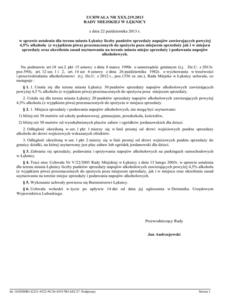 UCHWAŁA NR XXX.219.2013 RADY MIEJSKIEJ W ŁĘKNICY z dnia 22 października 2013 r. w sprawie ustalenia dla terenu miasta Łęknicy liczby punktów sprzedaży napojów zawierających powyżej 4,5% alkoholu (z wyjątkiem piwa) przeznaczonych do spożycia poza miejscem sprzedaży jak i w miejscu sprzedaży oraz określenia zasad usytuowania na terenie miasta miejsc sprzedaży i podawania napojów alkoholowych. Na podstawie art.18 ust.2 pkt 15 ustawy z dnia 8 marca 1990r. o samorządzie gminnym (t.j. Dz.U. z 2013r. poz.594), art. 12 ust. 1 i 2, art. 14 ust 6 ustawy z dnia 26 października 1982r. o wychowaniu w trzeźwości i przeciwdziałaniu alkoholizmowi (t.j. Dz.U. z 2012 r., poz.1356 ze zm.), Rada Miejska w Łęknicy uchwala, co następuje : § 1. 1. Ustala się dla terenu miasta Łęknicy 30 punktów sprzedaży napojów alkoholowych zawierających powyżej 4,5 % alkoholu (z wyjątkiem piwa) przeznaczonych do spożycia poza miejscem sprzedaży. 2. Ustala się dla terenu miasta Łęknicy 20 punktów sprzedaży napojów alkoholowych zawierających powyżej 4,5% alkoholu (z wyjątkiem piwa) przeznaczonych do spożycia w miejscu sprzedaży. § 2. 1. Miejsca sprzedaży i podawania napojów alkoholowych, nie mogą być usytuowane: 1) bliżej niż 50 metrów od szkoły podstawowej, gimnazjum, przedszkola, kościołów, 2) bliżej niż 50 metrów od wyodrębnionych placów zabaw i ogródków jordanowskich dla dzieci. 2. Odległość określoną w ust. 1 pkt 1 mierzy się w linii prostej od drzwi wejściowych punktu sprzedaży alkoholu do drzwi wejściowych wskazanych obiektów. 3. Odległość określoną w ust. 1 pkt 2 mierzy się w linii prostej od drzwi wejściowych punktu sprzedaży do granicy działki, na której usytuowany jest plac zabaw lub ogródek jordanowski dla dzieci. § 3. Zabrania się sprzedaży, podawania i spożywania napojów alkoholowych na parkingach samochodowych w Łęknicy. § 4. Traci moc Uchwała Nr V/22/2003 Rady Miejskiej w Łęknicy z dnia 13 lutego 2003r. w sprawie ustalenia dla terenu miasta Łęknicy liczby punktów sprzedaży napojów alkoholowych zawierających powyżej 4,5% alkoholu (z wyjątkiem piwa) przeznaczonych do spożycia poza miejscem sprzedaży, jak i w miejscu oraz określenia zasad usytuowania na terenie miejsc sprzedaży i podawania napojów alkoholowych. § 5. Wykonanie uchwały powierza się Burmistrzowi Łęknicy. § 6. Uchwała wchodzi w życie po upływie 14 dni od dnia jej ogłoszenia w Dzienniku Urzędowym Województwa Lubuskiego. Przewodniczący Rady Jan Andrzejewski Id: 165ED0B1-E221-4522-9C36-45417B1AEC27. Podpisany Strona 1 UZASADNIENIE do uchwały w sprawie ustalenia dla terenu miasta Łęknicy liczbę punktów sprzedaży napojów zawierających powyżej 4,5% alkoholu (z wyjątkiem piwa) przeznaczonych do spożycia poza miejscem sprzedaży jak i w miejscu sprzedaży oraz określenia zasad usytuowania na terenie miasta miejsc sprzedaży i podawania napojów alkoholowych. Na podstawie art. 12 ust 1 i 2 ustawy z dnia 26.10.1982r. o wychowaniu w trzeźwości i przeciwdziałaniu alkoholizmowi rada gminy ustala liczbę punktów sprzedaży napojów zawierających powyżej 4,5 % alkoholu – z wyjątkiem piwa przeznaczonych do spożycia poza miejscem sprzedaży jak i w miejscu sprzedaży. Rada gminy ustala także zasady usytuowania na terenie gminy miejsc sprzedaży i podawania napojów alkoholowych. W niniejszej uchwale pozostawia się bez zamian liczbę punktów sprzedaży napojów alkoholowych przeznaczonych do spożycia tj 20 punktów w miejscu sprzedaży, a zwiększa się liczbę punktów do 30 przeznaczonych do spożycia poza miejscem sprzedaży. W § 2 wprowadza się zasady usytuowania miejsc sprzedaży i sposób mierzenia odległości. Zgodnie z art. 14 w/w ustawy zabrania się sprzedaży, podawania i spożywania napojów alkoholowych: na terenie szkół oraz innych zakładów i placówek oświatowo-wychowawczych, opiekuńczych i domów studenckich, na terenie zakładów pracy oraz miejsc zbiorowego żywienia pracowników, w miejscach i czasie masowych zgromadzeń, w środkach i obiektach komunikacji publicznej, z wyjątkiem wagonów restauracyjnych i bufetów w pociągach, w których dopuszcza się sprzedaż, podawanie i spożywanie napojów alkoholowych do 4,5% zawartości alkoholu oraz piwa, w obiektach zajmowanych przez organy wojskowe i spraw wewnętrznych, jak również w rejonie obiektów koszarowych i zakwaterowania przejściowego jednostek wojskowych; zabrania się spożywania napojów alkoholowych na ulicach, placach i w parkach, z wyjątkiem miejsc przeznaczonych do ich spożycia na miejscu, w punktach sprzedaży tych napojów, zabrania się sprzedaży, podawania i spożywania napojów zawierających więcej niż 18% alkoholu w ośrodkach szkoleniowych, zabrania się sprzedaży i podawania napojów zawierających więcej niż 18% alkoholu w domach wypoczynkowych. Zgodnie z art. 16 zabrania się wnoszenia napojów alkoholowych na teren zakładów pracy, obiektów wymienionych w art. 14 ust. 1 pkt 6 (obiekty wojskowe, koszarowe), jak również stadionów i innych obiektów, w których odbywają się masowe imprezy sportowe i rozrywkowe, a także obiektów lub miejsc objętych zakazem wnoszenia napojów alkoholowych. Zgodnie z uchwałą miejscami sprzedaży i podawania napojów alkoholowych nie mogą być parkingi. Id: 165ED0B1-E221-4522-9C36-45417B1AEC27. Podpisany Strona 1