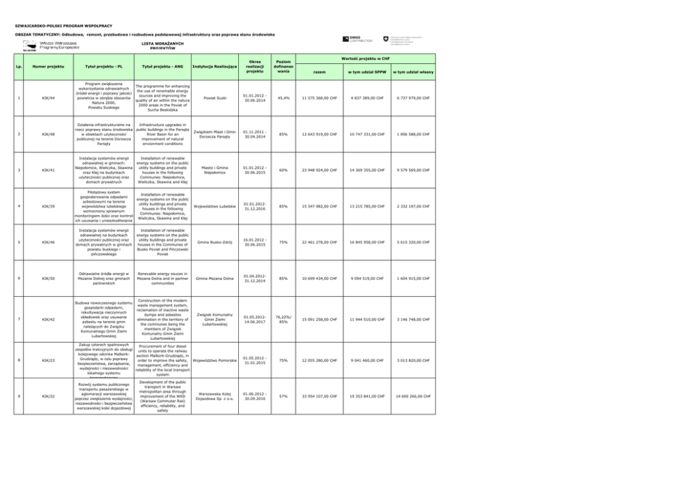 SZWAJCARSKO-POLSKI PROGRAM WSPÓŁPRACY OBSZAR TEMATYCZNY: Odbudowa, remont, przebudowa i rozbudowa podstawowej infrastruktury oraz poprawa stanu środowiska LISTA WDRAŻANYCH PROJEKTÓW Lp. Numer projektu Tytuł projektu - PL Program zwiększenia wykorzystania odnawialnych źródeł energii i poprawy jakości powietrza w obrębie obszarów Natura 2000, Powiatu Suskiego Tytuł projektu - ANG The programme for enhancing the use of renemable energy sources and improving the quality of air within the natura 2000 areas in the Poviat of Sucha Beskidzka 1 KIK/44 2 KIK/48 Działania infrastrukturalne na Infrastructure upgrades in rzecz poprawy stanu środowiska public buildings in the Parsęta w obiektach użyteczności River Basin for an publicznej na terenie Dorzecza improvement of natural Parsęty envionment conditions KIK/41 Instalacja systemów energii odnawialnej w gminach: Niepołomice, Wieliczka, Skawina oraz Kłaj na budynkach użyteczności publicznej oraz domach prywatnych KIK/39 Pilotażowy system Installation of renewable gospodarowania odpadami energy systems on the public azbestowymi na terenie utility buildings and private województwa lubelskiego houses in the following wzmocniony sprawnym Communes: Niepołomice, monitoringiem ilości oraz kontroli Wieliczka, Skawina and Kłaj ich usuwania i unieszkodliwiania 3 4 Installation of renewable energy systems on the public utility buildings and private houses in the following Communes: Niepołomice, Wieliczka, Skawina and Kłaj Wartość projektu w CHF Okres realizacji projektu Poziom dofinanso wania razem w tym udział SPPW w tym udział własny Powiat Suski 01.01.2012 30.06.2014 45,4% 11 575 368,00 CHF 4 837 389,00 CHF 6 737 979,00 CHF Związkiem Miast i Gmin Dorzecza Parsęty 01.11.2011 30.04.2014 85% 12 643 919,00 CHF 10 747 331,00 CHF 1 896 588,00 CHF Miasto i Gmina Niepołomice 01.01.2012 30.06.2015 60% 23 948 924,00 CHF 14 369 355,00 CHF 9 579 569,00 CHF Województwo Lubelskie 01.01.201231.12.2016 85% 15 547 982,00 CHF 13 215 785,00 CHF 2 332 197,00 CHF Instytucja Realizująca 5 KIK/46 Instalacja systemów energii odnawialnej na budynkach użyteczności publicznej oraz domach prywatnych w gminach powiatu buskiego i pińczowskiego 6 KIK/50 Odnawialne źródła energii w Mszanie Dolnej oraz gminach partnerskich Renevable energy souces in Mszana Dolna and in partner communities Gmina Mszana Dolna 01.04.201231.12.2014 85% 10 699 434,00 CHF 9 094 519,00 CHF 1 604 915,00 CHF KIK/42 Budowa nowoczesnego systemu gospodarki odpadami, rekultywacja nieczynnych składowisk oraz usuwanie azbestu na terenie gmin należących do Związku Komunalnego Gmin Ziemi Lubartowskiej Construction of the modern waste management system, reclamation of inactive waste dumps and asbestos elimination in the territory of the communes being the members of Związek Komunalny Gmin Ziemi Lubartowskiej Związek Komunalny Gmin Ziemi Lubartowskiej 01.05.201214.06.2017 76,22%/ 85% 15 091 258,00 CHF 11 944 510,00 CHF 3 146 748,00 CHF 01.05.2012 31.01.2015 75% 12 055 280,00 CHF 9 041 460,00 CHF 3 013 820,00 CHF 01.06.2012 30.09.2016 57% 33 954 107,00 CHF 19 353 841,00 CHF 14 600 266,00 CHF 7 8 KIK/23 9 KIK/22 Installation of renewable energy systems on the public utility buildings and private houses in the Communes of Busko Poviat and Pinczowski Poviat Gmina Busko-Zdrój 16.01.2012 30.06.2015 75% 22 461 278,00 CHF 16 845 958,00 CHF 5 615 320,00 CHF Zakup czterech spalinowych Procurement of four diesel zespołów trakcyjnych do obsługi units to operate the railway kolejowego odcinka Malborksection Malbork-Grudziądz, in Grudziądz, w celu poprawy order to improve the safety, Województwo Pomorskie bezpieczeństwa, zarządzania, management, efficiency and wydajności i niezawodności reliability of the local transport lokalnego systemu system transportowego Development of the public Rozwój systemu publicznego transport in Warsaw transportu pasażerskiego w metropolitan area through aglomeracji warszawskiej Warszawska Kolej improvement of the WKD poprzez zwiększenie wydajności, Dojazdowa Sp. z o.o. (Warsaw Commuter Rail) niezawodności i bezpieczeństwa efficiency, reliability, and warszawskiej kolei dojazdowej safety Installation of renewable energy systems on the public utility buildings and private houses in the communes which are members of the Wisłoka River Basin Communes/Związek Gmin Dorzecza Wisłoki Związek Gmin Dorzecza Wisłoki 01.06.2012 30.09.2016 75% 24 400 191,00 CHF 18 300 143,00 CHF 6 100 048,00 CHF 10 KIK/66 Instalacja systemów energii odnawialnej na budynkach użyteczności publicznej oraz domach prywatnych na terenie gmin należących do Związku Gmin Dorzecza Wisłoki 11 KIK/73 Budowa elektrociepłowni opalanej biomasą jako podstawowego źródła ciepła w systemie ciepłowniczym miasta Lębork Biomass cogeneration plant as base load facility in the district heating system of Lębork Miasto Lębork 01.06.2012 31.12.2015 85% 11 638 194,00 CHF 9 892 465,00 CHF 1 745 729,00 CHF 12 KIK/61 Wymiana wymiennikowych węzłów grupowych na indywidualne węzły cieplne wraz z modernizacją komunalnej sieci ciepłowniczej, w rejonach zwartej zabudowy wielorodzinnej miasta stołecznego Warszawy, na obszarach o przekroczonych dopuszczalnych poziomach zanieczyszczeń powietrza Replacement of group, exchange-based heating substations with individual heating substations and modernization of heat distribution network in Warsaw capital city's highdensity multifamily housing areas where permissible air pollution levels are exceed Stołeczne Przedsiębiorstwo Energetyki Cieplnej S.A. 01.06.2012 30.06.2017 30% 35 429 153,00 CHF 10 628 746,00 CHF 24 800 407,00 CHF 13 KIK/63 Budowa systemu energii odnawialnej - kolektory słoneczne w zakładach opieki zdrowotnej Building a nenewable energy system - solar collectors in health care facilities Województwo Mazowieckie 01.04.201414.06.2017 85% 10 829 792,00 CHF 9 205 323,00 CHF 1 624 469,00 CHF Województwo Małopolskie 