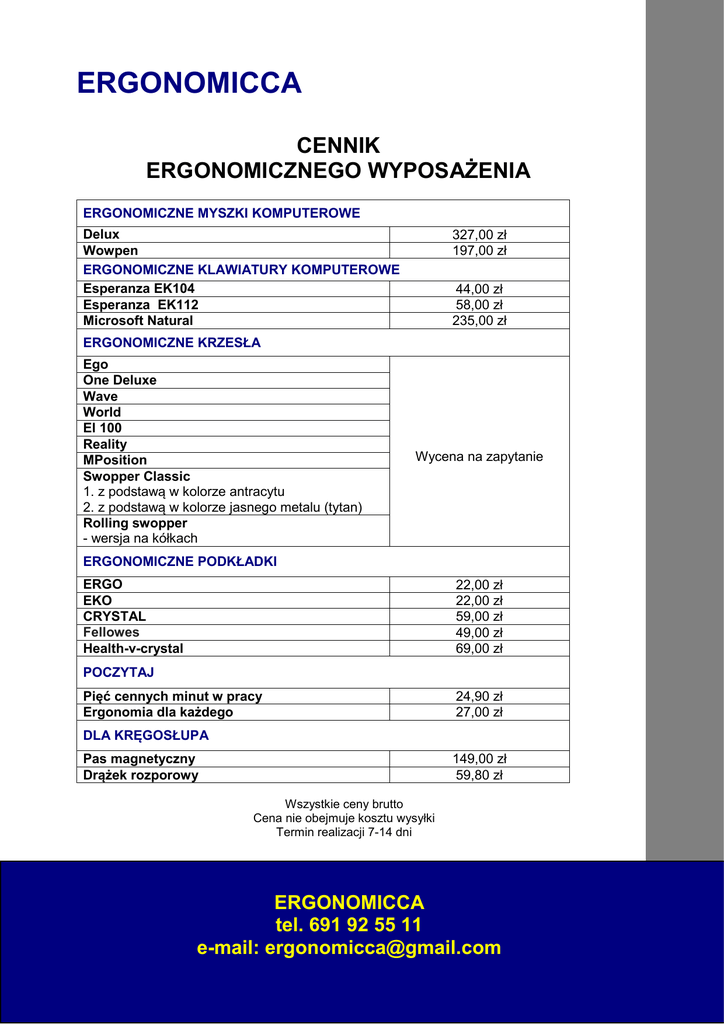 ERGONOMICCA CENNIK ERGONOMICZNEGO WYPOSAŻENIA ERGONOMICZNE MYSZKI KOMPUTEROWE Delux Wowpen ERGONOMICZNE KLAWIATURY KOMPUTEROWE Esperanza EK104 Esperanza EK112 Microsoft Natural 327,00 zł 197,00 zł 44,00 zł 58,00 zł 235,00 zł ERGONOMICZNE KRZESŁA Ego One Deluxe Wave World El 100 Reality MPosition Swopper Classic 1. z podstawą w kolorze antracytu 2. z podstawą w kolorze jasnego metalu (tytan) Rolling swopper - wersja na kółkach Wycena na zapytanie ERGONOMICZNE PODKŁADKI ERGO EKO CRYSTAL Fellowes Health-v-crystal 22,00 zł 22,00 zł 59,00 zł 49,00 zł 69,00 zł POCZYTAJ Pięć cennych minut w pracy Ergonomia dla każdego 24,90 zł 27,00 zł DLA KRĘGOSŁUPA Pas magnetyczny Drążek rozporowy 149,00 zł 59,80 zł Wszystkie ceny brutto Cena nie obejmuje kosztu wysyłki Termin realizacji 7-14 dni ERGONOMICCA tel. 691 92 55 11 e-mail: [email protected]