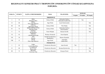 REGIONALNY KONKURS PRACY TROPOWCÓW I POSOKOWCÓW UŚNIAKI K/GARWOLINA 19.09.2015r. LOKATA PUNKTY NAZWA Z PRZYDOMKIEM RASA WŁAŚCICIEL DYPLOM I stopnia II stopnia III stopnia TROPOWCE I 79 II 80 III 80 IV 76 V 72 VI 62 VII 28 VIII 12 INKA Kłusująca Sfora FIONA Pola i Gaje Ołtarzew STRUNA Śpiewająca Zgraja BERGAMOTKA ETVE Odszukać Wiatr CENTKA Tak Dla Hecy PORTOS z Kraśnieńskich Łąk FUK Wiercik FELIX Pola i Gaje Ołtarzew Gończy Polski Aleksandra Garbacz Aleksandra Szydłowska - Tak - Ogar Polski Jacek Niedźwiedzki - - Tak Gończy Polski Piotr Madej - - Tak Gończy Polski Aleksandra Garbacz Paweł Garbacz - - Tak Terier Walijski Damian Gawlik - - Tak Płochacz Niemiecki Paweł Opolski - - - Jamnik Szorstkowłosy Standardowy Mariusz Kamiński - - - Ogar Polski Anna Król Łukasz Król - - - Posokowiec Bawarski Anna Szostek Tak - - Posokowiec Bawarski Romana Ryszkowska - - Tak Posokowiec Bawarski Grzegorz Pucek - - Tak POSOKOWCE I 82 II 80 III 72 TARA Lesznowska Sfora I’m NEPTUN Russet Tails BRANDY Czerwony Trop