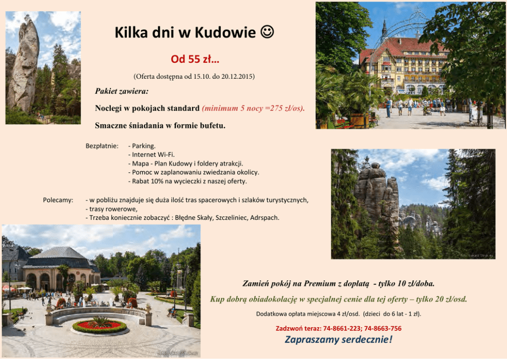 Kilka dni w Kudowie Od 55 zł… (Oferta dostępna od 15.10. do 20.12.2015) Pakiet zawiera: Noclegi w pokojach standard (minimum 5 nocy =275 zł/os). Smaczne śniadania w formie bufetu. Bezpłatnie: Polecamy: - Parking. - Internet Wi-Fi. - Mapa - Plan Kudowy i foldery atrakcji. - Pomoc w zaplanowaniu zwiedzania okolicy. - Rabat 10% na wycieczki z naszej oferty. - w pobliżu znajduje się duża ilość tras spacerowych i szlaków turystycznych, - trasy rowerowe, - Trzeba koniecznie zobaczyć : Błędne Skały, Szczeliniec, Adrspach. Zamień pokój na Premium z dopłatą - tylko 10 zł/doba. Kup dobrą obiadokolację w specjalnej cenie dla tej oferty – tylko 20 zł/osd. Dodatkowa opłata miejscowa 4 zł/osd. (dzieci do 6 lat - 1 zł). Zadzwoń teraz: 74-8661-223; 74-8663-756 Zapraszamy serdecznie!