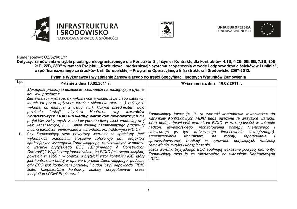 Numer sprawy: OZ/321/05/11 Dotyczy: zamówienia w trybie przetargu nieograniczonego dla Kontraktu 2 „InŜynier Kontraktu dla kontraktów 4.1B, 4.2B, 5B, 6B, 7.2B, 20B, 21B, 22B, 23B” w ramach Projektu „Rozbudowa i modernizacja systemu zaopatrzenia w wodę i odprowadzania ścieków w Lublinie”, współfinansowanego ze środków Unii Europejskiej – Programu Operacyjnego Infrastruktura i Środowisko 2007-2013. Pytanie Wykonawcy i wyjaśnienie Zamawiającego do treści Specyfikacji Istotnych Warunków Zamówienia Lp. 1. Pytanie z dnia 10.02.2011 r. „Uprzejmie prosimy o udzielenie odpowiedzi na następujące pytanie dot. ww. przetargu: Zamawiający wymaga, by wykonawca wykazał, iŜ „w ciągu ostatnich trzech lat przed upływem terminu składania ofert (…) naleŜycie wykonał co najmniej 2 usługi (…), których przedmiotem było pełnienie funkcji InŜyniera Kontraktu wg warunków Kontraktowych FIDIC lub według warunków równowaŜnych dla projektów związanych z budową/przebudową sieci wodociągowej i/lub kanalizacyjnej (…).” Jakie według Zamawiającego procedury moŜna uznać za równowaŜne z warunkami kontraktowymi FIDIC? Czy Zamawiający uzna powyŜszy warunek za spełniony, jeśli wykonawca przedstawi stosowne referencje dot. projektów spełniających wymagania Zamawiającego, realizowanych w oparciu o warunki brytyjskiego ECC („Engineering & Construction Contract”)? Wyjaśniamy jednocześnie, Ŝe FIDIC (czerwona ksiąŜka) powstała w 1956 r. w oparciu o brytyjski wzór kontraktu ICE, który jest kontraktem buduj w oparciu o projekt Zamawiającego, podczas gdy ECC jest kontraktem projektuj i buduj (czyli odpowiada FIDIC Ŝółtej ksiąŜce).Oba kontrakty zostały przygotowane przez Instytution of Civil Engineers.” Wyjaśnienia z dnia 18.02.2011 r. Zamawiający informuje, iŜ za warunki kontraktowe równowaŜne do warunków Kontraktowych FIDIC będą uwaŜane te wszystkie warunki, które będą odpowiadać warunkom FIDIC, w szczególności w zakresie nadzoru inwestorskiego, monitorowania postępu finansowego i rzeczowego (w tym dotyczącego finansowania zewnętrznego), administrowania kontraktami na roboty, raportowania i sprawozdawczości, mediacji w sprawach dotyczących realizacji zamówienia, ryzyka i ubezpieczenia. JeŜeli warunki brytyjskiego ECC spełniają wskazane powyŜej elementy, Zamawiający uzna je za równowaŜne do warunków Kontraktowych FIDIC. 1 Lp. Pytanie z dnia 15.02.2011 r. 1. „W punkcie 9.1.2a SIWZ – Część I-IDW, dotyczącym posiadania wiedzy i doświadczenia, Zamawiający wymaga wykonania co najmniej 2 usług, których przedmiotem było pełnienie funkcji InŜyniera Kontraktu wg warunków kontraktowych FIDIC lub według warunków równowaŜnych dla projektów związanych z budową/przebudową sieci wodociągowej i/lub kanalizacyjnej. Czy Zamawiający dopuszcza wykazaniem się przez Wykonawcę naleŜytego wykonania 2 usług, których przedmiotem było pełnienie funkcji InŜyniera Kontraktu wg warunków kontraktowych EJCDC stosowanych w Stanach Zjednoczonych jako warunków równowaŜnych dla warunków FIDIC? Warunki kontraktowe EJCDC są najwyŜszej jakości standardem stosowanym dla projektów infrastrukturalnych w Stanach Zjednoczonych. Organizacja istnieje od 1975 roku.” Wyjaśnienia z dnia 18.02.2011 r. Zamawiający informuje, iŜ za warunki kontraktowe równowaŜne do warunków Kontraktowych FIDIC będą uwaŜane te wszystkie warunki, które będą odpowiadać warunkom FIDIC, w szczególności w zakresie nadzoru inwestorskiego, monitorowania postępu finansowego i rzeczowego (w tym dotyczącego finansowania zewnętrznego), administrowania kontraktami na roboty, raportowania i sprawozdawczości, mediacji w sprawach dotyczących realizacji zamówienia, ryzyka i ubezpieczenia. JeŜeli warunki kontraktowe EJCDC spełniają wskazane powyŜej elementy, Zamawiający uzna je za równowaŜne do warunków Kontraktowych FIDIC. 2