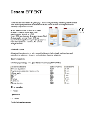 Desam EFFEKT Skoncentrowany ciekły środek dezynfekcyjny z działaniem myjącym do jednofazowej dezynfekcji oraz mycia zmywalnych powierzchni i przedmiotów w słuŜbie zdrowia na bazie kwarternych związków amonowych, biguanidu oraz amin Jedyna w swym rodzaju kombinacja substancji aktywnych zapewnia szybką skuteczność dezynfekcyjną w stęŜeniu od 0,25%. Desam Effekt jest stosowany do codziennej dezynfekcji placówek słuŜby zdrowia. Desam Effekt jest łagodnie/delikatnie perfumowany i moŜna go stosować w obecności personelu i pacientów. Nie zawiera aldehydy ani chlor. Substancje czynne: didecyldimetylamonium chloryd, poly(hexametylenbiguanid), hydrochloryd , bis (3–aminopropyl) dodecylamina , kationowe i nieionowe powierzchniowo skuteczne substancje Spektrum działania: bakteriobójczy (włączając TBC), grzybobójczy, wirusobójczy (HBV/HCV/HIV) Zastosowanie/działanie Rutynowe czyszczenie Dezynfekcja powierzchni o wysokim ryzyku Bakterie, grzyby HBV/HIV HCV Rotavirus Vaccina virus M.terrae, M.avium Okres waŜności: 24 miesiące Opakowanie: 5 kg kanister Opinie fachowe i ekspertyzy: StęŜenie roztworu 0,25% 0,5% 0,25% 0,5% 0,25% 0,5% 0,5% 0,25% Czas działania 15 min. 30 min. 15 min. 5 min. 5 min. 15 min. 5 min. 15 min. Akredytowane laboratoria Chemila, s.r.o., Hodonín i SZU Praha – skuteczność mikrobiologiczna Dr. Steinmann, Mikrolab GmbH, Bremen – wirusy Produkt jest zgodny z Dyrektywą 93/42/EEC Środek medyczny kl. IIa, CE 1023 Aktywność mikrobiologiczna: Bakterie(St.aureus, E.coli, Ps.aeruginosa, Pr.vulgaris, S.marcescens, E. hirae) - EN 13727, EN 1276, Fungi (Candida albicans, Aspergillus niger - EN 13624, EN 1650 Micobacterium avium, M. Terrae - EN 14348 Wirusy Rotavirus (human rotavirus strain Wa ), BVDV, Vaccinia