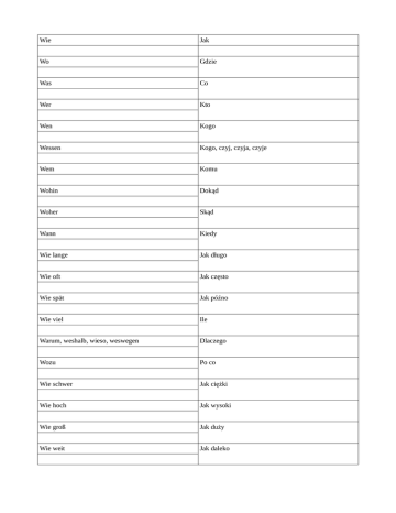 Wie Jak Wo Gdzie Was Co Wer Kto Wen Kogo Wessen Kogo, czyj, czyja, czyje Wem Komu Wohin Dokąd Woher Skąd Wann Kiedy Wie lange Jak długo Wie oft Jak często Wie spät Jak późno Wie viel Ile Warum, weshalb, wieso, weswegen Dlaczego Wozu Po co Wie schwer Jak ciężki Wie hoch Jak wysoki Wie groß Jak duży Wie weit Jak daleko