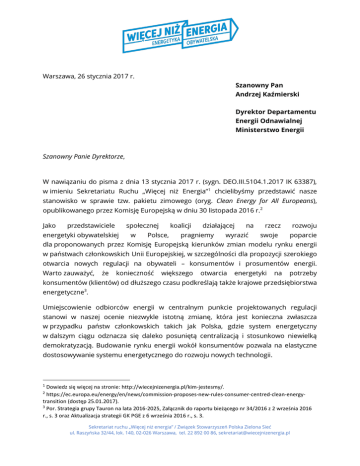 Warszawa, 26 stycznia 2017 r. Szanowny Pan Andrzej Kaźmierski Dyrektor Departamentu Energii Odnawialnej Ministerstwo Energii Szanowny Panie Dyrektorze, W nawiązaniu do pisma z dnia 13 stycznia 2017 r. (sygn. DEO.III.5104.1.2017 IK 63387), w imieniu Sekretariatu Ruchu „Więcej niż Energia”1 chcielibyśmy przedstawić nasze stanowisko w sprawie tzw. pakietu zimowego (oryg. Clean Energy for All Europeans), opublikowanego przez Komisję Europejską w dniu 30 listopada 2016 r.2 Jako przedstawiciele społecznej energetyki obywatelskiej w koalicji Polsce, działającej pragniemy na wyrazić rzecz swoje rozwoju poparcie dla proponowanych przez Komisję Europejską kierunków zmian modelu rynku energii w państwach członkowskich Unii Europejskiej, w szczególności dla propozycji szerokiego otwarcia nowych regulacji na obywateli – konsumentów i prosumentów energii. Warto zauważyć, że konieczność większego otwarcia energetyki na potrzeby konsumentów (klientów) od dłuższego czasu podkreślają także krajowe przedsiębiorstwa energetyczne3. Umiejscowienie odbiorców energii w centralnym punkcie projektowanych regulacji stanowi w naszej ocenie niezwykle istotną zmianę, która jest konieczna zwłaszcza w przypadku państw członkowskich takich jak Polska, gdzie system energetyczny w dalszym ciągu odznacza się daleko posuniętą centralizacją i stosunkowo niewielką demokratyzacją. Budowanie rynku energii wokół konsumentów pozwala na elastyczne dostosowywanie systemu energetycznego do rozwoju nowych technologii. 1 Dowiedz się więcej na stronie: http://wiecejnizenergia.pl/kim-jestesmy/. https://ec.europa.eu/energy/en/news/commission-proposes-new-rules-consumer-centred-clean-energytransition (dostęp 25.01.2017). 3 Por. Strategia grupy Tauron na lata 2016-2025, Załącznik do raportu bieżącego nr 34/2016 z 2 września 2016 r., s. 3 oraz Aktualizacja strategii GK PGE z 6 września 2016 r., s. 3. 2 Sekretariat ruchu „Więcej niż energia” / Związek Stowarzyszeń Polska Zielona Sieć ul. Raszyńska 32/44, lok. 140, 02-026 Warszawa, tel. 22 892 00 86, [email protected] Dotychczas konsumenci energii, czyli podmioty stanowiące najliczniejszą kategorię uczestników rynku energetycznego4, byli definiowani w prawie Unii Europejskiej jedynie jako pasywni „odbiorcy”, dokonujący zakupu energii z sieci. Propozycje legislacyjne składające się na pakiet zimowy stanowią szansę na odwrócenie dotychczasowego stanu prawnego, a co za tym idzie – także na zmianę relacji pomiędzy poszczególnymi uczestnikami rynku. Inicjatywa Komisji ma na celu nie tylko wzmocnienie obecnych praw konsumentów na rynku energii (takich jak np. prawo do swobodnego wyboru sprzedawcy), ale przede wszystkim ustanawia szereg nowych, niezbędnych instytucji, które – w naszej ocenie – dostosowują unijne regulacje do dynamicznie zmieniającej się rzeczywistości rynkowej i technologicznej. W szczególności należy zaaprobować propozycję wprowadzenia do prawa Unii Europejskiej instytucji aktywnego odbiorcy energii5, tj. każdego obywatela lub grupy obywateli zaangażowanych w aktywne współtworzenie systemu energetycznego. Podobnie pozytywnie należy ocenić propozycję harmonizacji podstawowych praw prosumentów na gruncie zmienianej dyrektywy w sprawie promowania stosowania energii ze źródeł odnawialnych. Należy podkreślić, że pojęcie aktywnego odbiorcy, do którego odwołuje się również definicja auto-konsumenta energii odnawialnej, o którym mowa w projekcie noweli dyrektywy OZE6 – jest znacznie szersze aniżeli obecnie obowiązująca definicja prosumenta z polskiej ustawy o odnawialnych źródłach energii7. Pojęcie aktywnego odbiorcy energii z pakietu zimowego obejmuje także przedsiębiorców oraz zawiera w sobie wszelkie możliwe formy aktywnej partycypacji odbiorców w energetyce, tj. nie tylko wytwarzanie, ale także magazynowanie lub sprzedaż energii, udział w zarządzaniu popytem na energię oraz realizację przedsięwzięć zmierzających do poprawy efektywności energetycznej. Wskazane działania mogą być wykonywane zarówno samodzielnie, jak i za pośrednictwem tzw. agregatorów/koncentratorów8. W naszej ocenie takie kompleksowe podejście do szeroko rozumianego prosumeryzmu 4 W Polsce jest już ponad 17 detalicznych odbiorców energii elektrycznej. Zob. Sprawozdanie z działalności Prezesa Urzędu Regulacji Energetyki w 2015 r., Warszawa 2016, s. 49. 5 Zob. art. 2 pkt 6 projektu nowelizacji dyrektywy dotyczącej wspólnych zasad rynku wewnętrznego energii elektrycznej. 6 Por. art. 2 lit. aa projektu zmiany dyrektywy OZE. 7 Dz. U. z 2015 r., poz. 478, z późn. zm. Zob. art. 2 pkt 27a tej ustawy. 8 Co istotne, bez konieczności uzyskania odpowiedniej zgody od samego dostawcy energii. Sekretariat ruchu „Więcej niż energia” / Związek Stowarzyszeń Polska Zielona Sieć ul. Raszyńska 32/44, lok. 140, 02-026 Warszawa, tel. 22 892 00 86, [email protected] jest słusznym podejściem i powinno ono znaleźć możliwie najszybsze odzwierciedlenie w prawodawstwie krajowym. Jako korzystną należy ocenić także propozycję ustanowienia na poziomie prawa Unii Europejskiej podstawowych praw lokalnych wspólnot (spółdzielni) energetycznych oraz wyraźnie przyznanie takim wspólnotom szeregu praw, w tym w szczególności prawa do ustanawiania, posiadania i szeroko rozumianego zarządzania lokalną siecią energetyczną9. Należy zauważyć, że postanowienia te są – na poziomie ideowym – zbieżne z opracowywaną obecnie przez Ministerstwo Energii koncepcją klastrów energii. Za celową należy uznać także propozycję harmonizacji na poziomie prawa Unii Europejskiej podstawowych uprawnień lokalnych wspólnot energii odnawialnej na potrzeby zmienianej dyrektywy OZE. W naszej ocenie zaproponowane przez Komisję limity dotyczące zakresu działalności i możliwości partycypacji w lokalnych wspólnotach energii odnawialnej (18 MW mocy zainstalowan