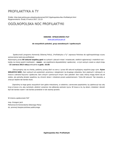 PROFILAKTYKA A TY Źródło: http://pat.policja.gov.pl/pat/wydarzenia/2347,Ogolnopolska-Noc-Profilaktyki.html Wygenerowano: Środa, 8 marca 2017, 22:23 OGÓLNOPOLSKA NOC PROFILAKTYKI ODEZWA SPOŁECZNOŚCI PaT www.pat.policja.gov.pl do wszystkich pokoleń, grup zawodowych i społecznych Społeczność programu Komendy Głównej Policji „Profilaktyka a Ty” zaprasza Państwa do ogólnopolskiego zrywu wzmocnienia twórczej profilaktyki. Wykonajmy przez 60 sekund wspólny gest na rynkach i placach miast i miasteczek, wielkich aglomeracji i maleńkich wsi – każdy na miarę swoich możliwości – razem – we wspólnocie obywatelskiej i społecznej – w tym samym czasie w całym kraju – 22 czerwca 2013 rokupunktualnie o godz. 16.00. Zatrzymajmy się na chwilę, połóżmy prawą dłoń na sercu i przez 60 sekund wybijajmy wspólnie jego rytm. Rytm WOLNYCH SERC. Serc wolnych od uzależnień, przemocy i obojętności na drugiego człowieka. Serc pięknych i zdrowych, w trosce o zdrowie fizyczne i społeczne. Serc silnych i pomocnych innym. Serc pokoleń. Serc ludzi, którzy mogą różnić się od siebie, ale potrafią działać wspólnie, by chronić dzieci i młodzież przed uzależnieniami. Tylko 60 sekund. Tak niewiele, a znaczyć będzie tak bardzo dużo. Zaprośmy to tego gestu wszystkich tam gdzie mieszkamy, w sobotnie, czerwcowe popołudnie, by zjednoczył się cały kraj w trosce o to, aby narkotyki, alkohol i przemoc nie odbierały wolności życia. W trosce o to, by dzieci, młodzież i dorośli byli tak bardzo razem i tak bardzo prawdziwi w tak ważnej sprawie. W imieniu społeczności PaT insp. Grzegorz Jach Pełnomocnik Komendanta Głównego Policji ds. promocji bezpieczeństwa publicznego Ogólnopolska Noc Profilaktyki 22 czerwca 2013 roku www.pat.policja.gov.pl P R O G R A M (dla mediów) 15.30 – 15.55 – happening „Przestańmy biec!” Zawołania promujące modę na życie wolne od uzależnień. Podczas happeningu młodzież rozdaje naklejki „Ogólnopolska Noc Profilaktyki – moda na życie bez uzależnień”. Szczegółowe opisy i rozwiązania metodyczno-logistyczne publikowane są na stronie internetowej programu PaT. 15.55 – odczytanie odezwy społeczności PaT Odezwa została wysłana z Impresariatu PaT pocztą elektroniczną do każdego prezydenta i burmistrza miasta, starosty powiatu oraz wójta gminy na terenie całego kraju. Listy intencyjne zapraszające do włączenia się w ideę Ogólnopolskiej Nocy Profilaktyki skierowali do kierowników jednostek organizacyjnych Minister Spraw Wewnętrznych, Minister Edukacji Narodowej oraz Komendant Główny Policji. 16.00 – społeczny zryw WOLNE SERCA Ogólnopolski happening trwający 60 sekund w całym kraju, 22 czerwca punktualnie o godz. 16.00, który polega na wspólnym wybijaniu prawą dłonią rytmu serca. 16.01 – 18.00 – lokalne programy profilaktyczno-artystyczne Happeningi, sztuka ulicy, koncerty, pokazy w terenie otwartym. 19.00 – 21.00 – twórcza profilaktyka To czas przeznaczony na prezentacje spektakli teatralnych, musicali, filmów i wystaw edukacyjno-profilaktycznych zrealizowanych przez młodzież, które odbędą się w teatrach, kinach, domach kultury, świetlicach lub szkołach. 21.00 – 24.00 – nocne rozmowy o profilaktyce „Głos profilaktyki” Ten czas kończący Ogólnopolską Noc Profilaktyki przeznaczony jest na otwartą rozmowę pokoleniową na temat profilaktyki, jej słabych i mocnych stron, planów i oczekiwań społecznych. Do rozmowy koniecznie powinna być zaproszona młodzież, policjant, psycholog, pedagog oraz prowadzący rozmowę moderator. Spotkanie może odbyć się w sali konferencyjnej urzędów miasta, powiatu lub gminy w kinie, domu kultury lub innym dogodnym miejscu. Organizatorzy powinni zapewnić swobodę wypowiedzi uczestników spotkania unikając odczytywania referatów. Bardzo istotnym partnerem tej inicjatywy są Gminne Komisje Rozwiązywania Problemów Alkoholowych. Ogólnopolska Noc Profilaktyki 22 czerwca 2013 roku www.pat.policja.gov.pl P R O G R A M ( z opisem ) 15.30 – 15.55 – happening „Przestańmy biec!” (opis poniżej) Młodzież w formie happeningowej w ciągłym ruchu przemieszcza się na otwartym terenie (np. rynek miejski) trzymając ponad głowami (napisane/namalowane dwustronnie na kartonach) zawołania zgodne z ideą programu PaT. (Propozycje haseł są podane poniżej) Podczas happeningu młodzież rozdaje naklejki „Ogólnopolska Noc Profilaktyki – moda na życie bez uzależnień”, które organizatorzy będą mogli otrzymać bez ponoszenia kosztów ich druku w każdej komendzie miejskiej, rejonowej i powiatowej Policji. Ponadto liderzy PaT, będą mogli odebrać w macierzystych komendach Policji wydrukowane plakaty Ogólnopolskiej Nocy Profilaktyki z wolnym miejscem na dopisanie własnych informacji (plakaty w miejscowościach, w których nie działają grupy PaT będzie można pozyskać wyłącznie w formie elektronicznej). 15.55 – odczytanie odezwy społeczności PaT Odezwa zostanie wysłana z Impresariatu PaT do połowy maja br. drogą internetową do każdego prezydenta i burmistrza miasta, starosty powiatu oraz wójta gminy na terenie całego kraju. 16.00 – społeczny zryw „Wolne serca” Zatrzymajmy się na chwilę, połóżmy prawą dłoń na sercu i przez 60 sekund wybijajmy wspólnie jego rytm. Rytm „Wolnych serc”. Serc wolnych od uzależnień, przemocy i obojętności na drugiego człowieka. Serc pięknych i zdrowych, w trosce o zdrowie fizyczne i społeczne. Serc silnych i pomocnych innym. Serc ludzi, którzy mogą różnić się od siebie, ale potrafią działać wspólnie, by chronić dzieci i młodzież przed uzależnieniami. Tylko 60 sekund. Tak niewiele, a znaczyć będzie tak bardzo dużo. 16.01 – 16.05 – podziękowanie organizatorów i gospodarzy Nocy Profilaktyki za wspólny zryw „Wolnych serc” i zaproszenie do udziału w przygotowanym programie 16.05 – 18.00 – działania lok