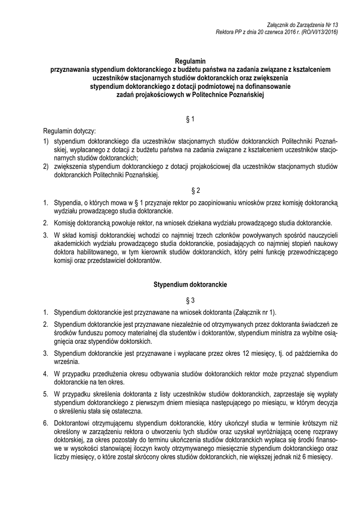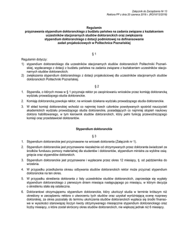 Załącznik do Zarządzenia Nr 13 Rektora PP z dnia 20 czerwca 2016 r. (RO/VI/13/2016) Regulamin przyznawania stypendium doktoranckiego z budżetu państwa na zadania związane z kształceniem uczestników stacjonarnych studiów doktoranckich oraz zwiększenia stypendium doktoranckiego z dotacji podmiotowej na dofinansowanie zadań projakościowych w Politechnice Poznańskiej §1 Regulamin dotyczy: 1) stypendium doktoranckiego dla uczestników stacjonarnych studiów doktoranckich Politechniki Poznańskiej, wypłacanego z dotacji z budżetu państwa na zadania związane z kształceniem uczestników stacjonarnych studiów doktoranckich; 2) zwiększenia stypendium doktoranckiego z dotacji projakościowej dla uczestników stacjonarnych studiów doktoranckich Politechniki Poznańskiej. §2 1. Stypendia, o których mowa w § 1 przyznaje rektor po zaopiniowaniu wniosków przez komisję doktorancką wydziału prowadzącego studia doktoranckie. 2. Komisję doktorancką powołuje rektor, na wniosek dziekana wydziału prowadzącego studia doktoranckie. 3. W skład komisji doktoranckiej wchodzi co najmniej trzech członków powoływanych spośród nauczycieli akademickich wydziału prowadzącego studia doktoranckie, posiadających co najmniej stopień naukowy doktora habilitowanego, w tym kierownik studiów doktoranckich, który pełni funkcję przewodniczącego komisji oraz przedstawiciel doktorantów. Stypendium doktoranckie §3 1. Stypendium doktoranckie jest przyznawane na wniosek doktoranta (Załącznik nr 1). 2. Stypendium doktoranckie jest przyznawane niezależnie od otrzymywanych przez doktoranta świadczeń ze środków funduszu pomocy materialnej dla studentów i doktorantów, stypendium ministra za wybitne osiągnięcia oraz stypendiów doktorskich. 3. Stypendium doktoranckie jest przyznawane i wypłacane przez okres 12 miesięcy, tj. od października do września. 4. W przypadku przedłużenia okresu odbywania studiów doktoranckich rektor może przyznać stypendium doktoranckie na ten okres. 5. W przypadku skreślenia doktoranta z listy uczestników studiów doktoranckich, zaprzestaje się wypłaty stypendium doktoranckiego z pierwszym dniem miesiąca następującego po miesiącu, w którym decyzja o skreśleniu stała się ostateczna. 6. Doktorantowi otrzymującemu stypendium doktoranckie, który ukończył studia w terminie krótszym niż określony w zarządzeniu rektora o utworzeniu tych studiów oraz uzyskał wyróżniającą ocenę rozprawy doktorskiej, za okres pozostały do terminu ukończenia studiów doktoranckich wypłaca się środki finansowe w wysokości stanowiącej iloczyn kwoty otrzymywanego miesięcznie stypendium doktoranckiego oraz liczby miesięcy, o które został skrócony okres studiów doktoranckich, nie większej jednak niż 6 miesięcy. 2 §4 1. Doktorant składa wniosek o przyznanie stypendium doktoranckiego do kierownika studiów doktoranckich, w terminie do dnia 12 października. Wniosek ten zawiera: 1) dane osobowe doktoranta oraz opis jego postępów w pracy naukowej; 2) opinię opiekuna naukowego albo promotora; 3) informacje potwierdzające spełnienie kryteriów, o których mowa w § 5; 4) zgodę doktoranta na przetwarzanie jego danych osobowych; 5) numer konta bankowego doktoranta. 2. Komisja doktorancka, po zaopiniowaniu wniosków, w terminie do 5 dni roboczych począwszy od dnia 12 października, przekazuje rektorowi listę wszystkich doktorantów, którzy złożyli wniosek o stypendium doktoranckie. Na liście komisja doktorancka umieszcza nazwiska zarówno doktorantów rekomendowanych do przyznania stypendium doktoranckiego w liczbie nie większej niż ustalona przez dziekana jak i nierekomendowanych, przy których należy uzasadnić brak rekomendacji. 3. Rektor wydaje decyzję w sprawie przyznania doktorantowi stypendium doktoranckiego w terminie do 10 dni roboczych począwszy od dnia na który przypada obowiązek przekazania rektorowi przez wydziałową komisję doktorancką listy doktorantów ubiegających się o stypendium. 4. Doktorant ma prawo do odwołania od decyzji rektora, złożonego w terminie 14 dni od otrzymania decyzji, w trybie ponownego rozpatrzenia wniosku. §5 1. Stypendium doktoranckie na pierwszym roku studiów doktoranckich może być przyznane doktorantowi, który osiągnął bardzo dobre wyniki w postępowaniu rekrutacyjnym. 2. Stypendium doktoranckie na drugim roku i kolejnych latach studiów doktoranckich może być przyznane doktorantowi, który w roku akademickim poprzedzającym złożenie wniosku o przyznanie stypendium doktoranckiego: 1) terminowo realizował program studiów doktoranckich oraz wykazywał się zaangażowaniem w prowadzeniu zajęć dydaktycznych w ramach praktyk zawodowych, albo realizacji badań naukowych prowadzonych przez wydział; 2) uzyskał bardzo dobre albo dobre wyniki (średnia ważona) z ocen z zajęć objętych programem studiów doktoranckich; 3) wykazał się postępami w pracy naukowej i w przygotowywaniu rozprawy doktorskiej. 3. Wyniki, o których mowa w ust. 1 i ust. 2 pkt 2 określa się zgodnie ze skalą ocen zawartą w Regulaminie Studiów Doktoranckich. §6 1. Minimalne stypendium doktoranckie nie może być niższe niż 60% minimalnego wynagrodzenia zasadniczego asystenta ustalonego w przepisach o wynagradzaniu nauczycieli akademickich. 2. Stypendia doktoranckie na dany rok akademicki przyznawane są w trzech kategoriach kwotowych, oznaczonych A, B, C. Wysokość stypendium w poszczególnych kategoriach ustala rektor. 3. Stypendia doktoranckie w poszczególnych kategoriach kwotowych mogą być przyznane: 1) kategoria A – doktorantom przyjętym na pierwszy rok studiów, zgodnie z § 5 ust. 1 oraz doktorantom kolejnych lat studiów doktoranckich, którzy nie spełniają kryteriów właściwych dla kategorii B lub C, jeżeli w poprzednim roku uzyskali średnią ze studiów nie mniejszą niż 4,2; 2) kategoria B – doktorantom drugiego i kolejnych lat studiów, jeżeli w poprzednim 