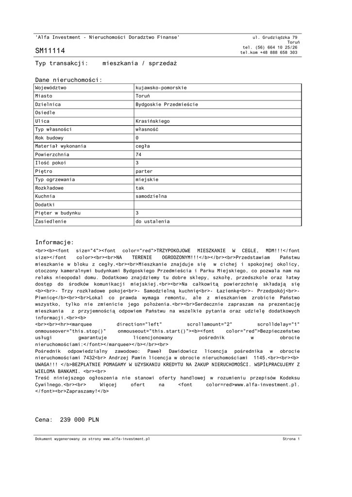 'Alfa Investment - Nieruchomości Doradztwo Finanse' SM11114 Typ transakcji: ul. Grudziądzka 79 Toruń tel. (56) 664 10 25/26 tel.kom +48 888 658 303 mieszkania / sprzedaż Dane nieruchomości: Województwo kujawsko-pomorskie Miasto Toruń Dzielnica Bydgoskie Przedmieście Osiedle Ulica Krasińskiego Typ własności własność Rok budowy 0 Materiał wykonania cegła Powierzchnia 74 Ilość pokoi 3 Piętro parter Typ ogrzewania miejskie Rozkładowe tak Kuchnia samodzielna Dodatki Pięter w budynku 3 Zasiedlenie do ustalenia Informacje: <br><b><font size="4"><font color="red">TRZYPOKOJOWE MIESZKANIE W CEGLE, MDM!!!</font size></font color><br><br>NA TERENIE OGRODZONYM!!!</b></br><br>Przedstawiam Państwu mieszkanie w bloku z cegły.<br><br>Mieszkanie znajduje się w cichej i spokojnej okolicy, otoczony kameralnymi budynkami Bydgoskiego Przedmieścia i Parku Miejskiego, co pozwala nam na relaks nieopodal domu. Dodatkowo znajdziemy tu dobre sklepy, szkołę, przedszkole oraz łatwy dostęp do środków komunikacji miejskiej.<br><br>Na całkowitą powierzchnię składają się <b><br>- Trzy rozkładowe pokoje<br>- Samodzielną kuchnię<br>- Łazienkę<br>- Przedpokój<br>Piwnicę</b><br><br>Lokal co prawda wymaga remontu, ale z mieszkaniem zrobicie Państwo wszystko, tylko nie zmienicie jego położenia.<br><br>Serdecznie zapraszam na prezentację mieszkania z przyjemnością odpowiem Państwu na wszelkie pytania oraz udzielę dodatkowych informacji.<br><b> <br><br><hr><marquee direction="left" scrollamount="2" scrolldelay="1" onmouseover="this.stop()" onmouseout="this.start()"><b><font color="red">Bezpieczeństwo usługi gwarantuje licencjonowany pośrednik w obrocie nieruchomościami:</font></marquee></b></br><br> Pośrednik odpowiedzialny zawodowo: Paweł Dawidowicz licencja pośrednika w obrocie nieruchomościami 7432<br> Andrzej Pamin licencja w obrocie nieruchomościami 1145.<br><br><b> UWAGA!!! </b>BEZPŁATNIE POMAGAMY W UZYSKANIU KREDYTU NA ZAKUP NIERUCHOMOŚCI. WSPÓŁPRACUJEMY Z WIELOMA BANKAMI. <br><br> Treść niniejszego ogłoszenia nie stanowi oferty handlowej w rozumieniu przepisów Kodeksu Cywilnego.<br><br> Więcej ofert na <font color=red>www.alfa-investment.pl. </font><br>Zapraszamy!</b> Cena: 239 000 PLN Dokument wygenerowany ze strony www.alfa-investment.pl Strona 1