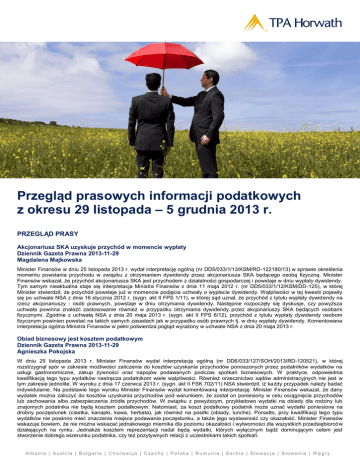 Przegląd prasowych informacji podatkowych z okresu 29 listopada – 5 grudnia 2013 r. PRZEGLĄD PRASY Akcjonariusz SKA uzyskuje przychód w momencie wypłaty Dziennik Gazeta Prawna 2013-11-29 Magdalena Majkowska Minister Finansów w dniu 25 listopada 2013 r. wydał interpretację ogólną (nr DD5/033/1/13/KSM/RD-122180/13) w sprawie określenia momentu powstania przychodu w związku z otrzymaniem dywidendy przez akcjonariusza SKA będącego osobą fizyczną. Minister Finansów wskazał, że przychód akcjonariusza SKA jest przychodem z działalności gospodarczej i powstaje w dniu wypłaty dywidendy. Tym samym nieaktualna staje się interpretacja Ministra Finansów z dnia 11 maja 2012 r. (nr DD5/033/1/12/KSM/DD-125), w której Minister stwierdził, że przychód powstaje już w momencie podjęcia uchwały o wypłacie dywidendy. Wątpliwości w tej kwestii pojawiły się po uchwale NSA z dnia 16 stycznia 2012 r. (sygn. akt II FPS 1/11), w której sąd uznał, że przychód z tytułu wypłaty dywidendy na rzecz akcjonariuszy - osób prawnych, powstaje w dniu otrzymania dywidendy. Następnie rozpoczęły się dyskusje, czy powyższa uchwała powinna znaleźć zastosowanie również w przypadku otrzymania dywidendy przez akcjonariuszy SKA będących osobami fizycznymi. Zgodnie z uchwałą NSA z dnia 20 maja 2013 r. (sygn. akt II FPS 6/12), przychód z tytułu wypłaty dywidendy osobom fizycznym powinien powstać na takich samych zasadach jak w przypadku osób prawnych tj. w dniu wypłaty dywidendy. Komentowana interpretacja ogólna Ministra Finansów w pełni potwierdza pogląd wyrażony w uchwale NSA z dnia 20 maja 2013 r. Obiad biznesowy jest kosztem podatkowym Dziennik Gazeta Prawna 2013-11-29 Agnieszka Pokojska W dniu 25 listopada 2013 r. Minister Finansów wydał interpretację ogólną (nr DD6/033/127/SOH/2013/RD-120521), w której rozstrzygnął spór w zakresie możliwości zaliczenia do kosztów uzyskania przychodów ponoszonych przez podatników wydatków na usługi gastronomiczne, zakup żywności oraz napojów podawanych podczas spotkań biznesowych. W praktyce, odpowiednia kwalifikacją tego typu wydatków nastręcza podatnikom wiele wątpliwości. Również orzecznictwo sądów administracyjnych nie jest w tym zakresie jednolite. W wyroku z dnia 17 czerwca 2013 r. (sygn. akt II FSK 702/11) NSA stwierdził, iż każdy przypadek należy badać indywidulanie. Na podstawie tego wyroku Minister Finansów wydał komentowaną interpretację. Minister Finansów wskazał, że dany wydatek można zaliczyć do kosztów uzyskania przychodów pod warunkiem, że został on poniesiony w celu osiągnięcia przychodów lub zachowania albo zabezpieczenia źródła przychodów. W związku z powyższym, przykładowo wydatki na obiady dla rodziny lub znajomych podatnika nie będą kosztem podatkowym. Natomiast, za koszt podatkowy podatnik może uznać wydatki poniesione na drobny poczęstunek (ciastka, kanapki, kawa, herbata), jak również na posiłki (obiady, lunche). Ponadto, przy kwalifikacji tego typu wydatków nie powinno mieć znaczenia miejsce podawania poczęstunku, a także jego wystawność czy okazałość. Minister Finansów wskazuje bowiem, że nie można wskazać jednakowego miernika dla poziomu okazałości i wytworności dla wszystkich przedsiębiorców działających na rynku. Jednakże kosztem reprezentacji nadal będą wydatki, których wyłącznym bądź dominującym celem jest stworzenie dobrego wizerunku podatnika, czy też pozytywnych relacji z uczestnikami takich spotkań. Albania | Austria | Bułgaria | Chorwacja | Czechy | Polska | Rumunia | Serbia | Słowacja | Słowenia | Węgry Czynsz najmu samochodu jest kosztem uzyskania przychodów Dziennik Gazeta Prawna 2013-12-02 Łukasz Zalewski W wyroku z dnia 23 października 2013 r. (sygn. akt I SA/Ol 524/13), WSA w Olsztynie stwierdził, że czynsz najmu samochodów może stanowić koszt uzyskania przychodów i nie podlega ograniczeniom, o których mowa w art. 16 ust 1 pkt 51 UPDOP. Niniejsza sprawa dotyczyła spółki, która w związku z prowadzoną działalnością gospodarczą zawiera umowy najmu i dzierżawy samochodów osobowych. Spółka złożyła wniosek o potwierdzenie w interpretacji indywidualnej stanowiska, iż całość czynszu za wynajem samochodów osobowych może zaliczyć do kosztów uzyskania przychodów bez uwzględnienia limitu wynikającego z tzw. kilometrówki. W orzecznictwie sądów administracyjnych funkcjonują dwa rozbieżne stanowiska. Pierwsze wskazuje, że ograniczenia wynikające z kilometrówki odnoszą się do wszelkich wydatków związanych z używaniem samochodów osobowych do celów działalności gospodarczej, w tym również dotyczą one przedmiotowego czynszu za najem samochodów. Wyrokiem z dnia 23 października 2013 r. WSA w Olsztynie wpisał się w linię orzeczniczą reprezentującą drugie podejście, zgodnie z którym czynsz za wynajem samochodu nie podlega ograniczeniom wynikające z art. 16 ust. 1 pkt 51 UPDOP, albowiem nie stanowi kosztu o charakterze eksploatacyjnym. Bez zaliczki i różnych stawek Rzeczpospolita 2013-12-03 Przemysław Wojtasik Z inicjatywy Kancelarii Prezydenta RP zorganizowane zostało seminarium „System obciążeń podatkowych wobec MŚP”. Powyższe seminarium było jednym ze spotkań mających na celu publikację zielonej księgi dotyczącej ładu gospodarczego dla MŚP w połowie przyszłego roku. Podczas spotkania, doradca prezydenta stwierdził, iż podatki w Polsce są niższe od średniej unijnej, przy czym potrzebne jest uproszczenie rozliczeń. Co więcej, z ekonomicznego punktu widzenia należałoby przesunąć ciężar obciążenia z pracy na konsumpcję lub majątek. Zdaniem Wojciecha Sztuby, partnera zarządzającego w TPA Horwath, należy zrezygnować z kosztownego wyliczania miesięcznych zaliczek na PDOF i PDOP oraz amortyzację podatkową zbliżyć do bilansowej, gdyż podwójne tabele amortyzacyjne stanowią specjalność polskiej gosp