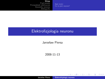 Wstęp Prąd jonowy Przewodność elektryczna Dynamika neuronu Bibliografia Spis treści Co to jest neuron? Elektrofizjologia neuronu Jarosław Piersa 2008-11-13 Jarosław Piersa Elektrofizjologia neuronu Wstęp Prąd jonowy Przewodność elektryczna Dynamika neuronu Bibliografia Spis treści Co to jest neuron? Wstęp Spis treści Co to jest neuron? Prąd jonowy Rola jonów w działaniu neronu Potencjał membranowy Stan równowagi Prąd jonowy Przewodność elektryczna Bramki jonowe Dynamika bramek jonowych Dynamika neuronu Model Hodgkina-Huxley’a Model Izhikevicha Bibliografia Jarosław Piersa Elektrofizjologia neuronu Wstęp Prąd jonowy Przewodność elektryczna Dynamika neuronu Bibliografia Spis treści Co to jest neuron? Co to jest neuron? Jarosław Piersa Elektrofizjologia neuronu Wstęp Prąd jonowy Przewodność elektryczna Dynamika neuronu Bibliografia Spis treści Co to jest neuron? Co to jest neuron? I Ilość nuronów w ludzkim mózgu szacuje się na 1011 , ilość synaps na 1014 I Tylko neurony mogą przewodzić impulsy elektryczne I Nośnikami impulsów są jony, a nie elektrony Jarosław Piersa Elektrofizjologia neuronu Wstęp Prąd jonowy Przewodność elektryczna Dynamika neuronu Bibliografia Rola jonów w działaniu neronu Potencjał membranowy Stan równowagi Prąd jonowy Główne jony odpowiedzialne za aktywność elektryczną Jarosław Piersa Elektrofizjologia neuronu Wstęp Prąd jonowy Przewodność elektryczna Dynamika neuronu Bibliografia Rola jonów w działaniu neronu Potencjał membranowy Stan równowagi Prąd jonowy Schemat komórki neuronowej Jarosław Piersa Elektrofizjologia neuronu Wstęp Prąd jonowy Przewodność elektryczna Dynamika neuronu Bibliografia Rola jonów w działaniu neronu Potencjał membranowy Stan równowagi Prąd jonowy Stężenie jonów W komórce I Na+ Poza komórką 1–15 mM I Na+ 145 mM I K + 140 mM I K + 5 mM I Cl − 4 mM I Cl − 110 mM I Ca2+ 0.1 µM I Ca2+ 2.5–5 mM I A− 147 mM I A− 25 mM Jarosław Piersa Elektrofizjologia neuronu Wstęp Prąd jonowy Przewodność elektryczna Dynamika neuronu Bibliografia Rola jonów w działaniu neronu Potencjał membranowy Stan równowagi Prąd jonowy Przepływ jonów Jony (z wyjątkiem A− ) mogą przemieszczać się przez kanały jonowe w membranie zgodnie z zasadami I zgodnie z gradientem koncentracji I zgodnie z gradientem potencjału elektrycznego Jarosław Piersa Elektrofizjologia neuronu Wstęp Prąd jonowy Przewodność elektryczna Dynamika neuronu Bibliografia Rola jonów w działaniu neronu Potencjał membranowy Stan równowagi Prąd jonowy Dlaczego stężenia jonów są różne? I Aktywne pompy jonowe w membranie stale przepychają jony poza komórkę i do wnętrza niezgodnie z ich gradientem koncentracji I Kanały jonowe mogą być zamknięte lub otwarte, zależnie od kilku czynników I Jony o tym samym znaku ładunku odpychają się, co ogranicza ich przepływ przez błonę komórkową. Jarosław Piersa Elektrofizjologia neuronu Wstęp Prąd jonowy Przewodność elektryczna Dynamika neuronu Bibliografia Rola jonów w działaniu neronu Potencjał membranowy Stan równowagi Prąd jonowy Stan równowagi W stanie równowagi (equilibrium) oba gradienty się równoważą i przepływ jonów przez membranę jest zerowy. Potencjał jonu w stanie równowagi wyraża się wzorem Nernsta: Eion = RT [Ion]out ln zF [Ion]in J R ' 8.314 K ·Mol C F ' 96480 Mol T — temperatura [Ion] — stężenie jonu z — ładunek jonu Jarosław Piersa Elektrofizjologia neuronu Wstęp Prąd jonowy Przewodność elektryczna Dynamika neuronu Bibliografia Rola jonów w działaniu neronu Potencjał membranowy Stan równowagi Prąd jonowy Wartości potencjału równowagi I ENa = 61 − 90mV I EK = −90mV I ECa = 136 − 145mV I ECl = −89mV Jarosław Piersa Elektrofizjologia neuronu Wstęp Prąd jonowy Przewodność elektryczna Dynamika neuronu Bibliografia Rola jonów w działaniu neronu Potencjał membranowy Stan równowagi Prąd jonowy Prąd jonowy Z każdym jonem stoważyszony jest prąd jonowy o natężeniu INa = gNa (V − ENa ) IK = gK (V − EK ) ICa = gCa (V − ECa ) ICl = gCl (V − ECl ) V — potęcjał na membranie gion — przewodność elektryczna (konduktancja?) Jarosław Piersa Elektrofizjologia neuronu Wstęp Prąd jonowy Przewodność elektryczna Dynamika neuronu Bibliografia Rola jonów w działaniu neronu Potencjał membranowy Stan równowagi Prąd jonowy Prąd jonowy EK < ECl < V < ENa < ECa Prądy IK i ICl płyną na zewnątrz neuronu i obniżają wartość V (hiperpolaryzacja). Prądy INa i ICa płyną do wnętrza neuronu i zwiększają wartość V (depolaryzacja). Jarosław Piersa Elektrofizjologia neuronu Wstęp Prąd jonowy Przewodność elektryczna Dynamika neuronu Bibliografia Rola jonów w działaniu neronu Potencjał membranowy Stan równowagi Prąd jonowy Prąd jonowy — dynamika C V̇ = C dV = I − INa − IK − ICa − ICl dt C V̇ = I −gNa (V −ENa )−gK (V −EK )−gCa (V −ECa )−gCl (V −ECl ) Jarosław Piersa Elektrofizjologia neuronu Wstęp Prąd jonowy Przewodność elektryczna Dynamika neuronu Bibliografia Bramki jonowe Dynamika bramek jonowych Przewodność elektryczna Przewodność elektryczna (gion ) jest zależna głównie od kanałów jonowych (mogą być zamknięte). Ta z koleji może zależeć od: I potencjału na błonie komórkowej (V ) I neuroprzekaźniki z wnętrza komórki I neuroprzekaźniki z poza komórki Zazwyczaj realizowana jest w postaci bramek (gates) otwierających i / lub zamykających dostęp do kanałów jonowych. Jarosław Piersa Elektrofizjologia neuronu Wstęp Prąd jonowy Przewodność elektryczna Dynamika neuronu Bibliografia Bramki jonowe Dynamika bramek jonowych Bramki jonowe Jarosław Piersa Elektrofizjologia neuronu Wstęp Prąd jonowy Przewodność elektryczna Dynamika neuronu Bibliografia Bramki jonowe Dynamika bramek jonowych Dynamika g = ḡ ma hb ḡ — maksymalna przewodność m = m(V ) — stopień otwarcia bra