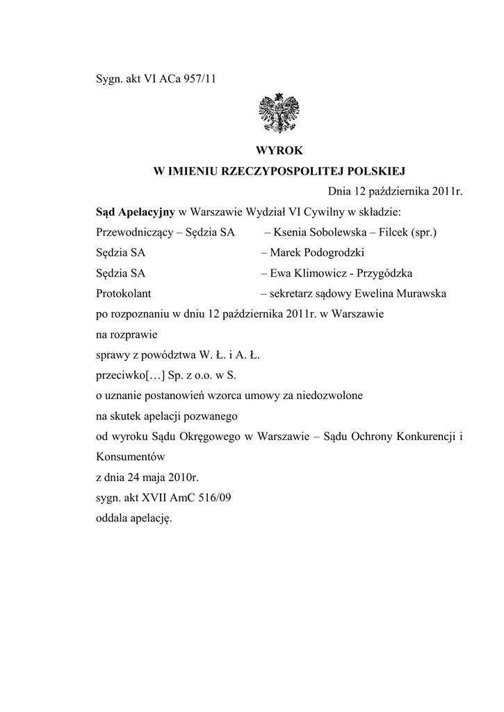 Sygn. akt VI ACa 957/11 WYROK W IMIENIU RZECZYPOSPOLITEJ POLSKIEJ Dnia 12 października 2011r. Sąd Apelacyjny w Warszawie Wydział VI Cywilny w składzie: Przewodniczący – Sędzia SA – Ksenia Sobolewska – Filcek (spr.) Sędzia SA – Marek Podogrodzki Sędzia SA – Ewa Klimowicz - Przygódzka Protokolant – sekretarz sądowy Ewelina Murawska po rozpoznaniu w dniu 12 października 2011r. w Warszawie na rozprawie sprawy z powództwa W. Ł. i A. Ł. przeciwko[…] Sp. z o.o. w S. o uznanie postanowień wzorca umowy za niedozwolone na skutek apelacji pozwanego od wyroku Sądu Okręgowego w Warszawie – Sądu Ochrony Konkurencji i Konsumentów z dnia 24 maja 2010r. sygn. akt XVII AmC 516/09 oddala apelację. 2 VI ACa 957/11 UZASADNIENIE Zaskarżonym wyrokiem Sąd Okręgowy w Warszawie – Sąd Ochrony Konkurencji i Konsumentów utrzymał w całości wyrok zaoczny z dnia 1 lipca 2009r. uwzględniający powództwo W. Ł. i A. Ł., przeciwko […] Sp. z o.o. w S. o uznanie za niedozwolone postanowień wzorca umowy – o treści: 1. „W razie zwłoki w wykonaniu obowiązków niepieniężnych wynikających z postanowień niniejszej umowy Inwestor będący w zwłoce zobowiązany będzie do zapłaty na rzecz Kupujących kary umownej w wysokości 0,03% za każdy dzień pozostawania w zwłoce, liczonej od wartości prac pozostałych do wykonania, obliczonych wg załączników nr 3 i 4 do umowy (kara umowna).” (§ 8 ust 1 wzorca). 2. „Cena określona w ust. 1 obejmuje 7% podatek od towarów i usług. W przypadku zmiany wysokości podatku VAT w okresie realizacji umowy cena określona w ust. 1 zostanie skorygowana do wysokości obowiązującego podatku.” (§ 3 ust 3 dz. 2 wzorca). oraz obciążył pozwanego kosztami procesu. W uzasadnieniu powyższego wyroku Sąd OKIK stwierdził, że stan faktyczny sprawy nie jest sporny, a pozwany przyznał, że stosował w umowach z konsumentami wzorzec umowy zawierający obydwa postanowienia objęte żądaniem pozwu. Sporna pozostawała jedynie ocena prawna tych postanowień na tle art. 3851 § 1 k.p.c. Dokonując zaś oceny tych postanowień w świetle w/w przepisu i uznając je za niedozwolone postanowienia umowne, Sąd OKIK przytoczył następujące argumenty: 3 Pierwsza z zakwestionowanych klauzul w swojej istocie ogranicza zakres odpowiedzialności pozwanego względem konsumenta za nienależyte wykonanie umowy (art. 3853 pkt 2 k.c.). Zgodnie z art. 484 § 1 k.c. zastrzeżenie kary umownej na wypadek niewykonania lub nienależytego wykonania zobowiązania wyłącza (o ile strony nie umówią się inaczej, co nie miało miejsca w tej sprawie) możliwość żądania odszkodowania przenoszącego wysokość zastrzeżonej kary. Nadto, kara, o której mowa w spornej klauzuli liczona jest od wartości prac pozostałych do wykonania, co oznacza, że w sytuacji zwłoki pozwanego w wykonaniu niewielkiej części prac konsument otrzyma kompensatę nieproporcjonalną do stopnia, w jakim przedmiot umowy odbiegał od umówionego. Takie opóźnienie, choć niewielkie co do wymiaru prac pozostałych do wykonania, może uniemożliwić korzystanie z całego przedmiotu umowy lub pozbawić go określonych cech użytkowych, bądź estetycznych. Rozwiązanie przyjęte w spornej klauzuli jest więc sprzeczne z dobrymi obyczajami i rażąco narusza interes konsumentów. Druga z kwestionowanych klauzul należy do tzw. klauzul waloryzacyjnych, które co do zasady są dozwolone w obrocie prawnym, jednak ich treść musi odpowiadać normie dobrego obyczaju i nie może rażąco naruszać interesów konsumentów, a zatem winna spełniać kryteria jednoznaczności i proporcjonalnego podziału korzyści i ciężarów. Kwestionowana klauzula nie spełnia jednak żadnego z tych kryteriów. Zezwala bowiem na podwyższenie ceny w każdym przypadku zmiany stawek podatku VAT, a więc również, gdy dotyczy ona poszczególnych materiałów budowlanych. Nadto, klauzula nie precyzuje mechanizmu waloryzacji świadczenia. Tymczasem nie ma podstaw do podwyższenia wynagrodzenia w przypadku podwyższenia podatku za roboty już wykonane 4 i materiały już kupione, a także za prace, w wykonaniu których pozwany pozostaje w zwłoce. W apelacji od powyższego wyroku, pozwany –[…] Sp. z o.o. w S. domagał się jego zmiany i oddalenia powództwa, ewentualnie – jego uchylenia i skierowania sprawy do ponownego rozpoznania przez sąd I instancji zarzucając temu sądowi naruszenie przepisów prawa materialnego w postaci: - art. 3851 § 1 k.c. poprzez uznanie, że kwestionowana klauzule rażąco naruszają interesy konsumenta, ograniczając zakres odpowiedzialności pozwanego względem powodów i wprowadzając nieusprawiedliwioną dysproporcję praw i obowiązków na niekorzyść powodów – konsumentów; - art. 3853 pkt 2 k.c. w zw. z art. 484 § 1 k.c. poprzez uznanie, że klauzula z § 8 ust 1 umowy ogranicza zakres odpowiedzialności pozwanego względem konsumentów – powodów, choć ukształtowana w niej kara umowna nie narusza ustawy, ani też nie zawiera zapisu istotnie ograniczającego odpowiedzialność pozwanego z tytułu niewykonania lub nienależytego wykonania zobowiązania. W uzasadnieniu apelacji skarżący stwierdził, że nie można go obciążać odpowiedzialnością za konstrukcję art. 484 § 1 k.c., mocą której ustawodawca dopuścił, by odpowiedzialność kontrahentów ograniczona była do kary umownej, bez względu na rzeczywistą szkodę. Nie istnieje też przepis, który byłby naruszony przyjętym we wzorcu uregulowaniem kary umownej. Zastosowane rozwiązanie jest też symetryczne do zastrzeżonego we wzorcu uprawnienia do odsetek od zaległych płatności, a zatem realizuje postulat zrównoważonych relacji kontrahentów. Uznając jednak, że może budzić zastrzeżenia brak we wzorcu zapisu o dopuszczalności dochodzenia przez kupującego odszkodowania na zasadach ogólnych, jeśli szkoda 5 wywołana zwłoką pozwanego przenosiłaby wartość kary umownej, p