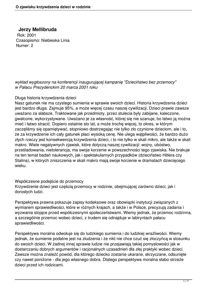 O zjawisku krzywdzenia dzieci w rodzinie Jerzy Mellibruda Rok: 2001 Czasopismo: Niebieska Linia Numer: 2 wykład wygłoszony na konferencji inaugurującej kampanię "Dzieciństwo bez przemocy" w Pałacu Prezydenckim 20 marca 2001 roku Długa historia krzywdzenia dzieci Nasz gatunek nie ma czystego sumienia w sprawie swoich dzieci. Historia krzywdzenia dzieci jest bardzo długa. Zajmuje 95%, a może więcej czasu naszej cywilizacji. Dzieci prawie zawsze uważano za słabsze. Traktowane jak przedmioty, przez stulecia były zabijane, kaleczone, gwałcone, wykorzystywane. Uważano je za własność, której się nie szanuje, bo łatwo ją można mieć i łatwo stracić. Dopiero ostatnie sto lat, a może trochę więcej, to okres, w którym zaczęliśmy się opamiętywać, stopniowo dostrzegając nie tylko zło czynione dzieciom, ale i to, że za krzywdzenie ich cały gatunek płaci wysoką cenę. Nie ulega wątpliwości, że bardzo dużo złych rzeczy jest konsekwencją krzywdzenia dzieci, i to nie tylko w skali mikro, ale także w skali makro. Wiele negatywnych zjawisk, które dotyczą naszej cywilizacji: wojny, ubóstwo, prześladowania, nietolerancja, ma swoje korzenie w powszechności tego zjawiska. Nie brakuje na ten temat badań naukowych, jak i spektakularnych przypadków (dzieciństwo Hitlera czy Stalina), w których zniszczenia w skali makro mają swoje korzenie w dramatach dziecięcego wieku. Współczesne podejście do przemocy Krzywdzenie dzieci jest częścią przemocy w rodzinie, obejmującej zarówno dzieci, jak i dorosłych ludzi. Perspektywa prawna pokazuje zapisy kodeksowe oraz obowiązki instytucji związanych z wymiarem sprawiedliwości, które w różnych krajach, a także i w Polsce, precyzują zadania i wyzwania stojące przed współczesnymi społeczeństwami. Wiemy jednak, że przemoc rodzinna, a szczególnie przemoc wobec dzieci, z trudem się odnajduje w labiryntach pałacu sprawiedliwości. Perspektywa moralna odwołuje się do ludzkiego sumienia i do ludzkiej wrażliwości. Wiemy jednak, że sumienie podatne jest na złudzenia i że nikt nie chce czuć się złoczyńcą w stosunku do swoich dzieci. W żadnej innej sprawie ludzie nie przejawiają takiej pomysłowości jak w dostarczaniu dobrych argumentów i racjonalnych uzasadnień dla złej praktyki wobec dzieci. Zawsze można znaleźć powód, dla którego dziecko zostanie ukarane, skrzyczane, odsunięte czy nawet poniżone - dla jego własnego dobra. Dlatego perspektywa moralna słabo strzeże dzieci przed ich rodzicami. 1/7 O zjawisku krzywdzenia dzieci w rodzinie Perspektywa społeczno-kulturowa pokazuje wpływ postaw społecznych i stereotypów kulturowych na sposób traktowania dzieci przez rodziców. Z tej właśnie perspektywy możemy zobaczyć, jak w pewnych okolicznościach świadomość faktów krzywdzenia dzieci uruchamia znaczące siły społeczne protestujące przeciw przemocy. Dzięki tej perspektywie mamy nadzieję, że nie tylko wymiar sprawiedliwości, ale ludzie - tworzący rodzinne, sąsiedzkie, lokalne społeczności - będą mogli użyć swojej siły, by powstrzymać przemoc. Perspektywa psychologiczna, która zwraca uwagę na cierpienie dzieci i złożoność interakcji w rodzinie, pokazuje, że jest tam nie tylko wiele tajemnic, ale także problemów, z którymi trudno się uporać. Z tej perspektywy łatwo zauważyć, że oprócz interwencji, powstrzymywania przemocy, trzeba dzieciom skrzywdzonym dostarczyć także pomocy psychologicznej, czasem psychoterapii, a czasem tylko zwyczajnego wsparcia, dzięki, któremu rany będą się zabliźniać. Musimy pamiętać, że nie zawsze wystarczy tylko przerwanie przemocy. Wymiary przemocy czy formy krzywdzenia W krzywdzeniu fizycznym można dostrzec dwie jego odmiany: dotkliwe karanie dziecka, w którym zadawanie bólu jest uzasadnione regułami, przepisami, oceną zachowania dziecka, i często jest zniekształcane przez różne uzasadnienia, racjonalizacje; krzywdzenie będące rezultatem agresji rodziców i potrzeby rozładowania agresywnych uczuć, które bardzo często nie mają nic wspólnego z dzieckiem, ale ze współżyciem w małżeństwie, z kłopotami bytowymi, zawodowymi itd. Krzywdzenie psychiczne - także ma dwie odmiany. Pierwsza związana jest z bezpośrednim atakowaniem i poniżaniem dzieci. Druga ma miejsce, gdy dziecko jest świadkiem przemocy między dorosłymi członkami rodziny - jak ojciec traktuje matkę, jak matka traktuje swoją starszą matkę. Oglądanie przez małe dziecko przemocy i wulgarności jest czasem równie niszczące, równie krzywdzące jak bezpośredni atak. Z tego powodu zapobieganie przemocy wobec dzieci musi być związane z przeciwdziałaniem wszystkim zjawiskom przemocy w rodzinie. Krzywdzenie seksualne - możemy podzielić na: bezpośrednie napastowanie, dotykanie, angażowanie w sytuacje seksualne; deprawację, to znaczy pokazywanie, udostępnianie dzieciom pornografii, pozwalanie na oglądanie aktów seksualnych, co dla małego dziecka, może być szokujące. I wreszcie sprawa zaniedbywania dzieci: zaniedbywanie materialne - jest najbardziej widoczne, często zdeterminowane czynnikami, które wykraczają poza wewnętrzne stosunki w rodzinie. Można powiedzieć, że nędza jest aktem przemocy, w szczególności wobec dzieci. Przyczyny tej przemocy mogą dotyczyć zjawisk w skali makrospołecznej. zaniedbywanie psychiczne - często jest najtrudniejsze do rozpoznania, a wielu rodziców nie orientuje się w potrzebach psychicznych dziecka. Nie wystarczy dziecka nie bić, nie poniżać. 2/7 O zjawisku krzywdzenia dzieci w rodzinie Dziecko potrzebuje ciepła, bezpieczeństwa, zainteresowania. Współcześnie za formę przemocy uważa się także sytuację, gdy nie dostaje ono pokarmu psychicznego, który jest potrzebny do prawidłowego rozwoju. Diagnozowanie przemocy Można wyróżnić trzy poziomy krzywdzenia. Pierwszy to maltretowanie, znęcanie, gwałcenie - tu interwencja prawa, służb publicznych 