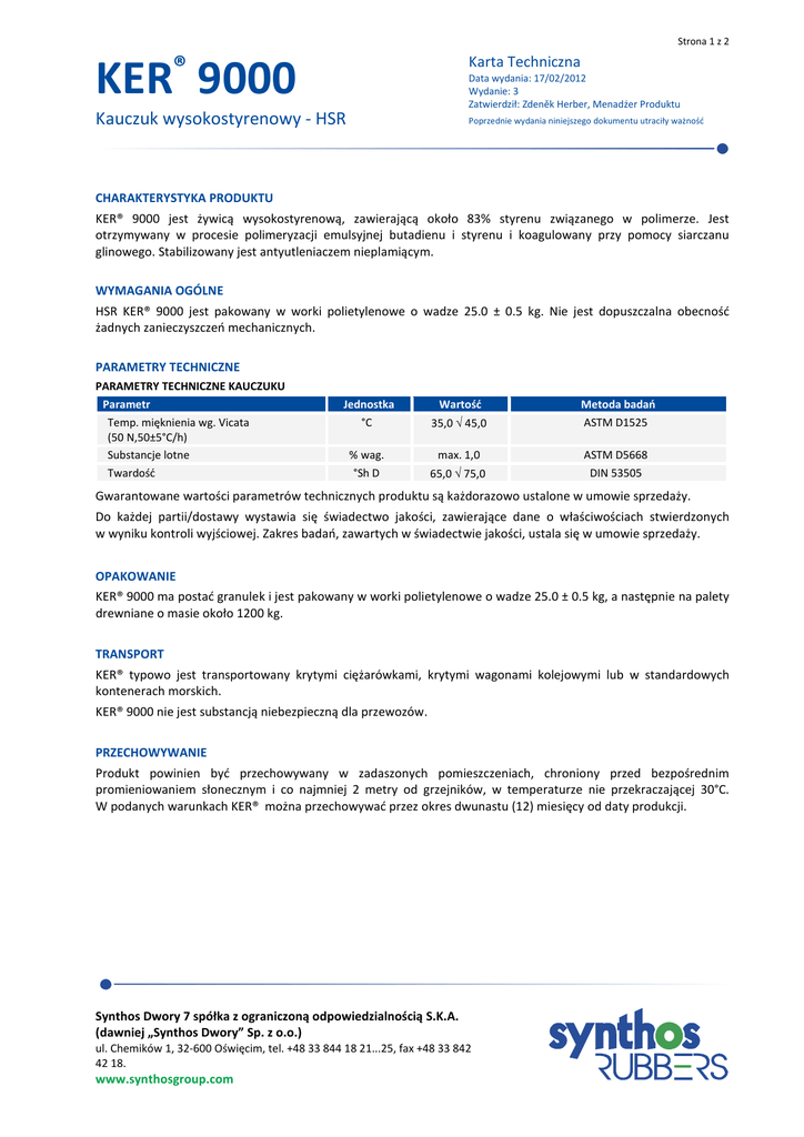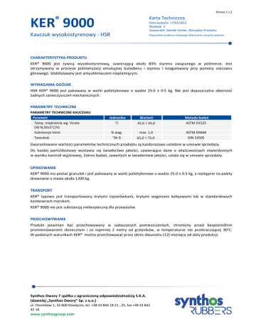 Strona 1 z 2 Karta Techniczna ® KER 9000 Data wydania: 17/02/2012 Wydanie: 3 Zatwierdził: Zdeněk Herber, Menadżer Produktu Kauczuk wysokostyrenowy - HSR Poprzednie wydania niniejszego dokumentu utraciły ważność CHARAKTERYSTYKA PRODUKTU KER® 9000 jest żywicą wysokostyrenową, zawierającą około 83% styrenu związanego w polimerze. Jest otrzymywany w procesie polimeryzacji emulsyjnej butadienu i styrenu i koagulowany przy pomocy siarczanu glinowego. Stabilizowany jest antyutleniaczem nieplamiącym. WYMAGANIA OGÓLNE HSR KER® 9000 jest pakowany w worki polietylenowe o wadze 25.0 ± 0.5 kg. Nie jest dopuszczalna obecność żadnych zanieczyszczeń mechanicznych. PARAMETRY TECHNICZNE PARAMETRY TECHNICZNE KAUCZUKU Parametr Temp. mięknienia wg. Vicata (50 N,50±5°C/h) Substancje lotne Twardość Jednostka °C Wartość 35,0 ÷ 45,0 % wag. °Sh D 65,0 ÷ 75,0 max. 1,0 Metoda badań ASTM D1525 ASTM D5668 DIN 53505 Gwarantowane wartości parametrów technicznych produktu są każdorazowo ustalone w umowie sprzedaży. Do każdej partii/dostawy wystawia się świadectwo jakości, zawierające dane o właściwościach stwierdzonych w wyniku kontroli wyjściowej. Zakres badań, zawartych w świadectwie jakości, ustala się w umowie sprzedaży. OPAKOWANIE KER® 9000 ma postać granulek i jest pakowany w worki polietylenowe o wadze 25.0 ± 0.5 kg, a następnie na palety drewniane o masie około 1200 kg. TRANSPORT KER® typowo jest transportowany krytymi ciężarówkami, krytymi wagonami kolejowymi lub w standardowych kontenerach morskich. KER® 9000 nie jest substancją niebezpieczną dla przewozów. PRZECHOWYWANIE Produkt powinien być przechowywany w zadaszonych pomieszczeniach, chroniony przed bezpośrednim promieniowaniem słonecznym i co najmniej 2 metry od grzejników, w temperaturze nie przekraczającej 30°C. W podanych warunkach KER® można przechowywać przez okres dwunastu (12) miesięcy od daty produkcji. Synthos Dwory 7 spółka z ograniczoną odpowiedzialnością S.K.A. (dawniej „Synthos Dwory” Sp. z o.o.) ul. Chemików 1, 32-600 Oświęcim, tel. +48 33 844 18 21...25, fax +48 33 842 42 18. www.synthosgroup.com Strona 2 z 2 ZASTOSOWANIE KER® 9000 jest stosowany jako dodatek do mieszanek gumowych w przemyśle obuwniczym oraz do produkcji wykładzin podłogowych i kabli. Dodatek tego produktu obniża plastyczność mieszanek gumowych i podwyższa twardość wulkanizatów. Niniejszy dokument ma charakter informacyjny. Informacje w nim podane oparte są na aktualnym stanie wiedzy i doświadczeniu. Nie stanowią one gwarancji własności produktu ani specyfikacji jakościowej i nie mogą być podstawą do reklamacji. Przedstawione informacje nie mogą mieć zastosowania dla mieszanin produktu z innymi substancjami. Produkt powinien być transportowany, magazynowany i stosowany zgodnie z obowiązującymi przepisami i odpowiednią praktyką higieny pracy. Wykorzystanie podanych informacji jak też sposób zastosowania produktu nie są kontrolowane przez producenta, i zatem określenie warunków bezpieczeństwa stosowania produktu jest obowiązkiem użytkownika. Synthos Dwory 7 spółka z ograniczoną odpowiedzialnością S.K.A. (dawniej „Synthos Dwory” Sp. z o.o.) ul. Chemików 1, 32-600 Oświęcim, tel. +48 33 844 18 21...25, fax +48 33 842 42 18. www.synthosgroup.com