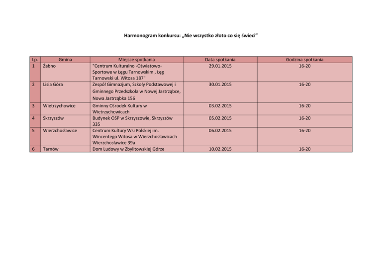 Harmonogram konkursu: „Nie wszystko złoto co się świeci” Lp. Gmina 1 Żabno 2 Lisia Góra 3 Wietrzychowice 4 Skrzyszów 5 Wierzchosławice 6 Tarnów Miejsce spotkania "Centrum Kulturalno -OświatowoSportowe w Łęgu Tarnowskim , Łęg Tarnowski ul. Witosa 187" Zespół Gimnazjum, Szkoły Podstawowej i Gminnego Przedszkola w Nowej Jastrząbce, Nowa Jastrząbka 156 Gminny Ośrodek Kultury w Wietrzychowicach Budynek OSP w Skrzyszowie, Skrzyszów 335 Centrum Kultury Wsi Polskiej im. Wincentego Witosa w Wierzchosławicach Wierzchosławice 39a Dom Ludowy w Zbylitowskiej Górze Data spotkania 29.01.2015 Godzina spotkania 16-20 30.01.2015 16-20 03.02.2015 16-20 05.02.2015 16-20 06.02.2015 16-20 10.02.2015 16-20