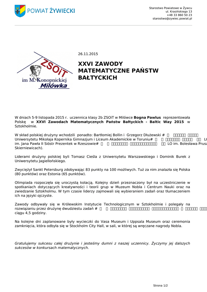 Starostwo Powiatowe w Żywcu ul. Krasińskiego 13 +48 33 860 50 23 [email protected] 26.11.2015 XXVI ZAWODY MATEMATYCZNE PAŃSTW BAŁTYCKICH W dniach 5-9 listopada 2015 r. uczennica klasy 2b ZSOiT w Milówce Bogna Pawlus reprezentowała Polskę w XXVI Zawodach Matematycznych Państw Bałtyckich - Baltic Way 2015 w Sztokholmie. W skład polskiej drużyny wchodzili ponadto: Bartłomiej Bollin i Grzegorz Dłużewski #℣佐⌡⌀娀攀猀瀀䈀 匀稀欀B Uniwersytetu Mikołaja Kopernika Gimnazjum i Liceum Akademickie w Toruniu#℣䍐⌡⌀Ⰰ 刀愀搀漀洀椁䈀 䈀愀爀愀渀 ⌡⍏倣℣ LO im. Jana Pawła II Sióstr Prezentek w Rzeszowie#℣䍐⌡⌀Ⰰ 圀漀樀挀椀攀挀栀 倀爀稀礀戀礀猀稀攀眀猀欀椀 ⌡⍏倣℣LO im. Bolesława Prusa Skierniewicach). Liderami drużyny polskiej byli Tomasz Cieśla z Uniwersytetu Warszawskiego i Dominik Burek z Uniwersytetu Jagiellońskiego. Zwyciężył Sankt Petersburg zdobywając 83 punkty na 100 możliwych. Tuż za nim znalazła się Polska (80 punktów) oraz Estonia (65 punktów). Olimpiada rozpoczęła się uroczystą kolacją. Kolejny dzień przeznaczony był na uczestniczenie w spotkaniach dotyczących kreatywności i teorii grup w Muzeum Nobla i Centrum Nauki oraz na zwiedzanie Sztokholmu. W tym czasie liderzy zajmowali się wybieraniem zadań oraz tłumaczeniem ich na języki ojczyste. Zawody odbywały się w Królewskim Instytucie Technologicznym w Sztokholmie i polegały na rozwiązaniu przez drużynę dwudziestu zadań #℣佐⌡⌀稀 愀氀最攀戀爀礀Ⰰ 最攀漀洀攀琀爀椀椀Ⰰ 欀漀洀戀椀渀愀琀漀爀礀欀椀 椀 琀攀漀爀椀椀 氀椀挀稀 ciągu 4,5 godziny. Na kolejne dni zaplanowane były wycieczki do Vasa Museum i Uppsala Museum oraz ceremonia zamknięcia, która odbyła się w Stockholm City Hall, w sali, w której są wręczane nagrody Nobla. Gratulujemy sukcesu całej drużynie i jesteśmy dumni z naszej uczennicy. Życzymy jej dalszych sukcesów w konkursach matematycznych. Strona 1/2 Starostwo Powiatowe w Żywcu ul. Krasińskiego 13 +48 33 860 50 23 [email protected] Informacja ZSOiT Milówka Strona 2/2 Powered by TCPDF (www.tcpdf.org)