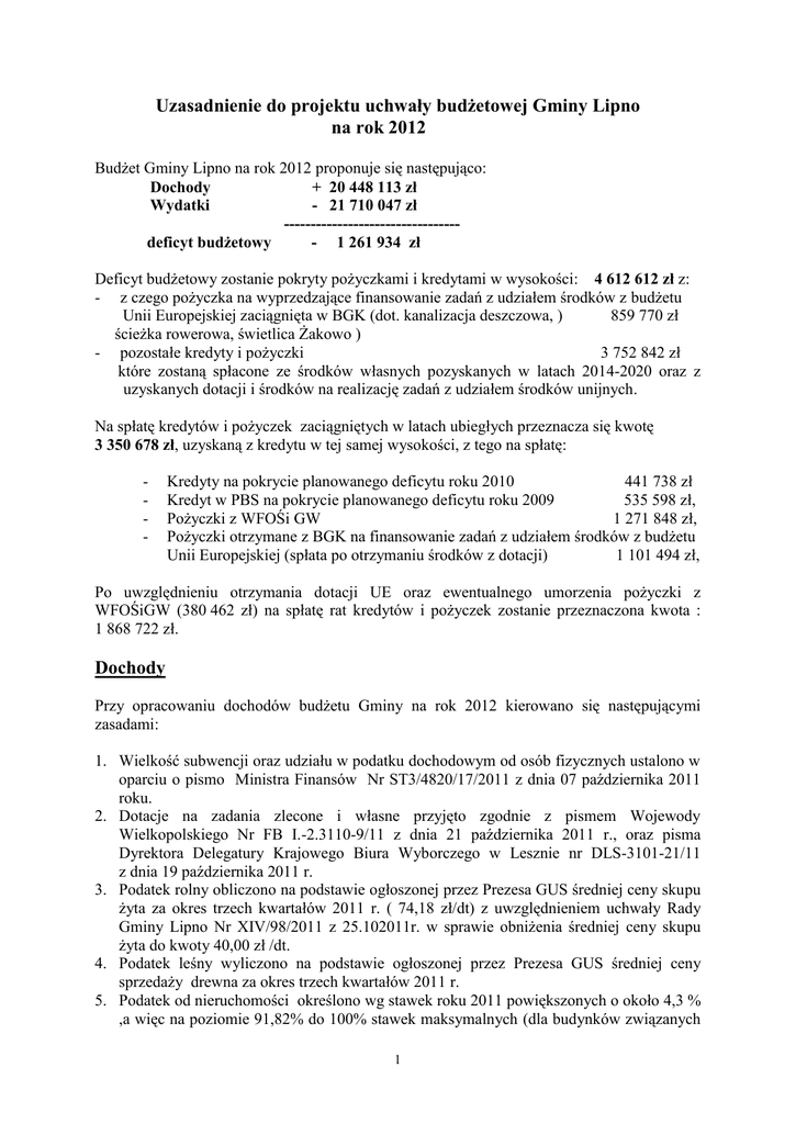 Uzasadnienie do projektu uchwały budżetowej Gminy Lipno na rok 2012 Budżet Gminy Lipno na rok 2012 proponuje się następująco: Dochody + 20 448 113 zł Wydatki - 21 710 047 zł --------------------------------deficyt budżetowy - 1 261 934 zł Deficyt budżetowy zostanie pokryty pożyczkami i kredytami w wysokości: 4 612 612 zł z: - z czego pożyczka na wyprzedzające finansowanie zadań z udziałem środków z budżetu Unii Europejskiej zaciągnięta w BGK (dot. kanalizacja deszczowa, ) 859 770 zł ścieżka rowerowa, świetlica Żakowo ) - pozostałe kredyty i pożyczki 3 752 842 zł które zostaną spłacone ze środków własnych pozyskanych w latach 2014-2020 oraz z uzyskanych dotacji i środków na realizację zadań z udziałem środków unijnych. Na spłatę kredytów i pożyczek zaciągniętych w latach ubiegłych przeznacza się kwotę 3 350 678 zł, uzyskaną z kredytu w tej samej wysokości, z tego na spłatę: - Kredyty na pokrycie planowanego deficytu roku 2010 441 738 zł Kredyt w PBS na pokrycie planowanego deficytu roku 2009 535 598 zł, Pożyczki z WFOŚi GW 1 271 848 zł, Pożyczki otrzymane z BGK na finansowanie zadań z udziałem środków z budżetu Unii Europejskiej (spłata po otrzymaniu środków z dotacji) 1 101 494 zł, Po uwzględnieniu otrzymania dotacji UE oraz ewentualnego umorzenia pożyczki z WFOŚiGW (380 462 zł) na spłatę rat kredytów i pożyczek zostanie przeznaczona kwota : 1 868 722 zł. Dochody Przy opracowaniu dochodów budżetu Gminy na rok 2012 kierowano się następującymi zasadami: 1. Wielkość subwencji oraz udziału w podatku dochodowym od osób fizycznych ustalono w oparciu o pismo Ministra Finansów Nr ST3/4820/17/2011 z dnia 07 października 2011 roku. 2. Dotacje na zadania zlecone i własne przyjęto zgodnie z pismem Wojewody Wielkopolskiego Nr FB I.-2.3110-9/11 z dnia 21 października 2011 r., oraz pisma Dyrektora Delegatury Krajowego Biura Wyborczego w Lesznie nr DLS-3101-21/11 z dnia 19 października 2011 r. 3. Podatek rolny obliczono na podstawie ogłoszonej przez Prezesa GUS średniej ceny skupu żyta za okres trzech kwartałów 2011 r. ( 74,18 zł/dt) z uwzględnieniem uchwały Rady Gminy Lipno Nr XIV/98/2011 z 25.102011r. w sprawie obniżenia średniej ceny skupu żyta do kwoty 40,00 zł /dt. 4. Podatek leśny wyliczono na podstawie ogłoszonej przez Prezesa GUS średniej ceny sprzedaży drewna za okres trzech kwartałów 2011 r. 5. Podatek od nieruchomości określono wg stawek roku 2011 powiększonych o około 4,3 % ,a więc na poziomie 91,82% do 100% stawek maksymalnych (dla budynków związanych 1 z obrotem materiałem siewnym i świadczeniem usług zdrowotnych przyjęto stawki na poziomie stawek maksymalnych). 6. Podatek od środków transportu ustalono w oparciu o stawki obowiązujące w roku 2011 r. 7. Pozostałe dochody ustalono wg przewidywanego wykonania. Na dochody składają się: Dochody bieżące w kwocie: Dochody majątkowe w kwocie: RAZEM: 17 876 419 zł 2 571 694 zł 20 448 113 zł 87,42% dochodów 12,58 % dochodów 1. Dział 010 – rolnictwo- 1 286 828 zł, w tym: Dochody bieżące: 232 000 zł: wpływy z dzierżawy sieci w kwocie 82 000 zł, wpływ z opłat za odbiór ścieków od mieszkańców z kanalizacji w Lipnie w kwocie 150 000 zł Dochody majątkowe: 1 054 828 zł wpłaty tytułem partycypacji w budowie sieci wodociągowej i kanalizacyjnej w kwocie 200 zł, dochody uzyskane ze sprzedaży mienia komunalnego - 200 000 zł – sprzedaż gruntów zaliczanych do rolnych , środki na dofinansowanie własnych inwestycji gminy z udziałem środków unijnych – dotacja do zadania inwestycyjnego „Kanalizacja Lipno etap I” – 854 628 zł 2. Dział 020 – leśnictwo – 4 550 zł - za dzierżawę obwodów łowieckich ; 3. Dział 700 – gospodarka mieszkaniowa – 1 422 500 zł, w tym: Dochody bieżące: 152 500 zł: za wieczyste użytkowanie gruntów – 2 000 zł, z tytułu dzierżaw ziemi, lokali oraz czynszów za mieszkania komunalne 150 000 zł, odsetki i opłaty– 500 zł; Dochody majątkowe: 1 270 000 zł: dochody uzyskane ze sprzedaży mienia komunalnego : sprzedaż lokali mieszkalnych w Wilkowicach ul. Dworcowa oraz w Goniembicach, działki budowlane w Wilkowicach oraz w Lipnie 5. Dział 750 – administracja publiczna – 75 850 zł : dotacja od Wojewody na realizację zadań z zakresu administracji rządowej 50 700 zł /w roku 2010 – 50 700 zł oraz w roku 2011 – 50 700 zł/, Urząd Gminy: za wpływy z usług /refaktury/- 22 000 zł, wpływy ze sprzedaży wyrobów 150 zł, wpływy z różnych dochodów min. dochody za terminowe przekazywanie podatku od wynagrodzeń pracowników do Urzędu Skarbowego – 3 000 zł; 6. Dział 751 – urzędy naczelnych organów władzy państwowej – 1 104 zł – dotacja z Krajowego Biura Wyborczego na prowadzenie i aktualizację stałego rejestru wyborców /w roku 2010 – 996 zł w roku 2011 – 1008 zł/; 2 7. Dział 756 – dochody od osób prawnych, fizycznych i od innych jednostek nie organizacyjnych z tytułu podatków i opłat - 9 334 585 zł: wpływy z podatku dochodowego od osób fizycznych – 1 510 zł - karta podatkowa wraz z odsetkami, wpływy od osób prawnych – 3 455 200 zł z tytułu podatków i opłat od: - nieruchomości - 3 184 000 zł /wzrost o 363 791 zł / - w stosunku do 2011r. - rolnego - 137 000 zł /zmniejszenie o 7 000 zł/, - leśnego 35 700 zł /wzrost o 9 700 zł/, - od środków transportu 89 000 zł /spadek o 23 000 zł/, - od czynności cywilnoprawnych 3 000 zł, / wzrost o 450 zł/ - różne opłaty i odsetki 6 500 zł /spadek o 1 100 zł/. wpływy od osób fizycznych – 2 046 500 zł z tytułu podatków i opłat od: - nieruchomości - 1 318 000 zł /wzrost o 88 240 zł/, - rolnego - 360 000 zł /wzrost o 25 604 zł/, - leśnego 2 500 zł /wzrost o 700 zł/,, - od środków transportu - 60 000 zł /wzrost o 25 000 zł/, - od spadków i darowizn - 22 000 zł , - od czynności cywilnoprawnych - 270 000 zł/spadek