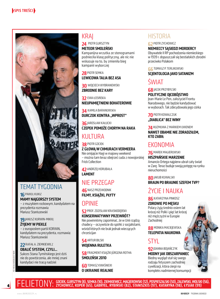 SPIS TREŚCI KRAJ HISTORIA 24 PIOTR GURSZTYN 62 PIOTR ZYCHOWICZ Kampanijna wrzutka ze stenogramami podnieciła klasę polityczną, ale nic nie wskazuje na to, by zmieniła bieg kampanii wyborczej Obywatele II RP pochodzenia niemieckiego w 1939 r. dopuszczali się bestialskich zbrodni przeciwko Polakom METEOR SMOLEŃSKI 28 PIOTR SEMKA LEWICOWA TALIA BEZ ASA 30 WOJCIECH WYBRANOWSKI ZBRODNIE BEZ KARY 32 EWA ŁOSIŃSKA NIEUPAMIĘTNIENI BOHATEROWIE 34 KAMILA BARANOWSKA DURCZOK KONTRA „WPROST” 36 JAROSŁAW KAŁUCKI CZEPEK POMOŻE CHORYM NA RAKA 19 JANUSZ KORWIN-MIKKE ŻYJEMY W PIEKLE – z europosłem partii KORWiN, kandydatem na prezydenta, rozmawia Mariusz Staniszewski FOT. MICHAŁ WARGIN/EAST NEWS 22 RAFAŁ A. ZIEMKIEWICZ 4 OBALIĆ SYSTEM, CZYLI... Sukces Stana Tymińskiego jest dziś nie do powtórzenia, ale mniej znani kandydaci nie tracą nadziei 68 JACEK PRZYBYLSKI POLITYCZNE OJCOBÓJSTWO Jean-Marie Le Pen, założyciel Frontu Narodowego, nie będzie kandydować w wyborach. Tak zdecydowała jego córka 70 PIOTR KOWALCZUK „DIABLICA” BEZ WINY 74 ROZMOWA Z MARKIEM OWENEM EKONOMIA LAMENT – z muzykiem rockowym, kandydatem na prezydenta rozmawia Mariusz Staniszewski ŚWIAT 38 PIOTR GOCIEK 42 ANDRZEJ HORUBAŁA MAMY NAJGORSZY SYSTEM SCJENTOLOGIA JAKO SATANIZM NAWET OBAMIE NIE ZDRADZIŁEM, KTO ZABIŁ Nie omijajcie Hagi w majowy weekend – można tam teraz obejrzeć cuda z nowojorskiej Frick Collection 16 PAWEŁ KUKIZ 66 TOMASZ P. TERLIKOWSKI KULTURA Z GŁOWĄ W CHMURACH VERMEERA TEMAT TYGODNIA NIEMIECCY SĄSIEDZI MORDERCY NIE PRZEGAP 46 NASZ PRZEWODNIK FILMY, KSIĄŻKI, PŁYTY OPINIE 52 PROF. ZDZISŁAW KRASNODĘBSKI KONSERWATYWNY PRZEWRÓT? Nie powinniśmy zapominać, że w Unii rządzą chadecy – oczywiście do spółki z socjalistami, wśród których nie brak jednak wierzących chrześcijan 54 ARTUR BILSKI WOJENNA RULETKA 58 FRAGMENT KSIĄŻKI JÜRGENA ROTHA SMOLEŃSK 2010 60 TOMASZ KWAŚNICKI O UKRAINIE REALNIE 76 MAREK MAGIEROWSKI HISZPAŃSKIE MARZENIE Amancio Ortega najpierw ubrał cały świat w Zarę. Teraz buduje swoją potęgę na rynku nieruchomości 80 JAKUB KOWALSKI BRAUN PO BRAUNIE SZEFEM TVP? ŻYCIE I NAUKA 86 KATARZYNA PINKOSZZ ZDROWIE PO MĘSKU Polacy żyją średnio osiem m lat krócej niż Polki i pięć lat krócej niż mężczyźni w Europiee Zachodniej 88 MONIKA MACIEJEWSKKA TELEPATIA NAUKOWAA STYL 92 JOANNA BOJAŃCZYK MODNY JAK OBSZARPPANIEC Biedny wygląd stał się sw wego rodzaju fetyszem zachodniej cywilizacji, która cierpi na kompleks nadmiernej koonsumpcji GURSZTYN (8), SEMKA (10), ZIEMKIEWICZ, MAGIEROWSKI (12), POSPIESZALSKI (50), ZALEWSKI, WOLSKI (56), ZYCHOWICZ, KOPER (65), GABRYEL, RYBIŃSKI (82), STANISZKIS (97), KATARYNA (98), ŁYSIAK (99) FELIETONY: GOCIEK, WWW.DORZECZY.PL DO RZECZY TYGODNIK LISICKIEGO
