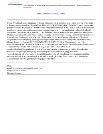 Dane pochodzą ze strony: http://www.ogloszenia.wirtualnaskandynawia.pl/. Wygenerowano dnia: 08-03-2017. stolarz okrętowy Szwecja / jachty Firma Weldtech Service będąca na rynku od kilkunastu lat, o ugruntowanej i silnej pozycji. W związku z dynamicznym rozwojem. Stanowisko: STOLARZ OKRĘTOWO/JACHTOWYCH Opis stanowiska: praca w Szwecji Wymagania: bardzo dobra umiejętność montażu mebli min. 4 lata doświadczenia na podobnym stanowisku (udokumentowane świadectwami pracy) samodzielność i odpowiedzialność Posiadanie Certyfikatu VCA bądź SCC bez nałogów proszę podać w cv datę gotowości do wyjazdu Dodatkowym atutem będzie : Gotowość do wyjazdu własnym autem /proszę o dodanie informacji w cv. Prowadzenie działalności gospodarczej Znajomość języka angielskiego Oferujemy: Oferujemy długoterminową współpracę, atrakcyjne wynagrodzenie, zwrot kosztów transportu, zakwaterowanie, Dołącz do nas i ty Kontakt [email protected] Skontaktujemy się tylko z wybranymi osobami. Weldtech Service 81-198 Rewa Kosakowo e-mail: [email protected] Telefon (+48) 507 389 194 technical manager tel. +31 611 604 293 e-mail: [email protected] F irma ta powstała z myślą o stworzeniu wysokiej jakości usług rzemiosła okrętowego. Pomysł jej stworzenia powstał na podstawie grupy doskonale wykwalifikowanych pracowników Stoczni Remontowych. Ich wieloletnie doświadczenie znajduje odzwierciedlenie w wykonywanych przez nich pracach. Jesteśmy firmą elastyczną, która sprosta oczekiwaniom nawet najbardziej wymagających klientów. Dane: email: [email protected] Miejscowość: Szwecja Region: Szwecja