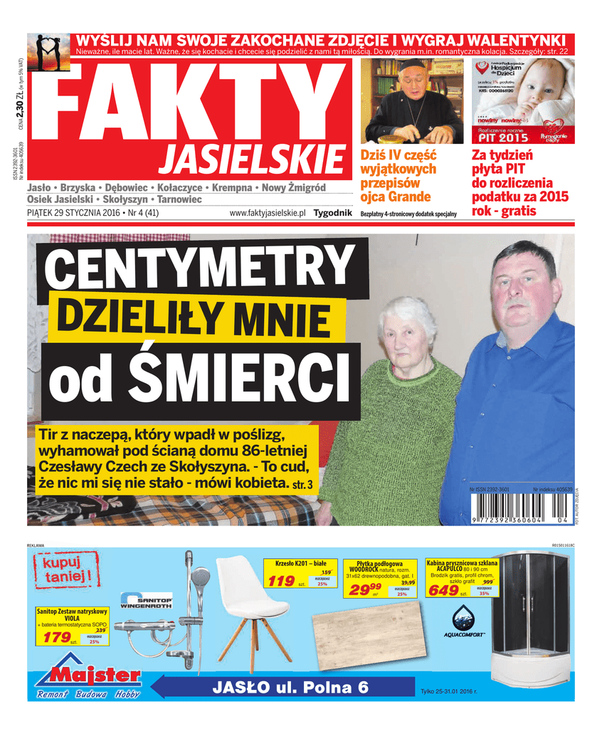 WYŚLIJ NAM SWOJE ZAKOCHANE ZDJĘCIE I WYGRAJ WALENTYNKI ISSN 2392-3601 Nr indeksu 405639 CENA 2,30 ZŁ (w tym 5% VAT) Nieważne, ile macie lat. Ważne, że się kochacie i chcecie się podzielić z nami tą miłością. Do wygrania m.in. romantyczna kolacja. Szczegóły: str. 22 Dziś IV część wyjątkowych przepisów ojca Grande Jasło • Brzyska • Dębowiec • Kołaczyce • Krempna • Nowy Żmigród Osiek Jasielski • Skołyszyn • Tarnowiec PIĄTEK 29 STYCZNIA 2016 • Nr 4 (41) www.faktyjasielskie.pl Tygodnik Za tydzień płyta PIT do rozliczenia podatku za 2015 rok - gratis Bezpłatny 4-stronicowy dodatek specjalny CENTYMETRY DZIELIŁY MNIE Tir z naczepą, który wpadł w poślizg, wyhamował pod ścianą domu 86-letniej Czesławy Czech ze Skołyszyna. - To cud, że nic mi się nie stało - mówi kobieta. str. 3 Nr ISSN 2392-3601 Nr indeksu 405639 9 772392 360604 REKLAMA 04 R015011618C Krzesło K201 – białe 159 119 OSZCZĘDZASZ szt. 25% Płytka podłogowa WOODROCK natura, rozm. 31x62 drewnopodobna, gat. I 2999 m2 39,99 OSZCZĘDZASZ 25% Kabina prysznicowa szklana ACAPULCO 80 i 90 cm Brodzik gratis, profil chrom, szkło grafit 999 649 OSZCZĘDZASZ szt. Sanitop Zestaw natryskowy VIOLA + bateria termostatyczna SOPO 179 szt. 239 OSZCZĘDZASZ 25% JASŁO ul. Polna 6 Tylko 25-31.01 2016 r. 35% FOT. AUTOR ZDJĘCIA od ŚMIERCI 2 DZIEŃ DOBRY Dyżurny reporter Jakub Hap czeka na Wasze sygnały: tel. 691 530 060, e-mail: [email protected] NIEDZIELA FAKTY JASIELSKIE PIĄTEK, 29 STYCZNIA, 2016 WTOREK ŚRODA CZWARTEK 29 30 31 1 2 3 4 PIĄTEK ŁEK PONIEDZIA SOBOTA stycznia stycznia stycznia lutego lutego lutego lutego Na imieniny idziemy do: Zdzisława, Franciszka i Józefa Na imieniny idziemy do: Bronisława, Feliksa i Marcina Na imieniny idziemy do: Emmy, Jana i Ludwika Na imieniny idziemy do: Emila, Igi i Ignacego Na imieniny idziemy do: Filipa, Franciszka i Katarzyny Na imieniny idziemy do: Błażeja, Stefana i Telimeny Na imieniny idziemy do: Andrzeja, Mariusz i Weroniki 103. urodziny staruszka Teatru Polskiego 1982 – Dzień Solidarności z Polską Międzynarodowy Dzień Przytulania Wspomnienie św. Brygidy Dzień Pozytywnego Myślenia Dzień Handlowaca Wspomnienie św. Błażeja (biskupa) Międzynarodowy Dzień Walki z Rakiem CYTAT TYGODNIA Trudno jest przywyknąć do sytuacji, kiedy z dnia na dzień stajesz się całkowicie zależny od innych”. Rafał Szumiec, niepełnosprawny sportowiec z Jasła Słowo daję [email protected] Iwona Adamek FOT. GRZEGORZ MICHALSKI kilkuesięciotonowa maszyna może złapać po lizg. Ano może. Po pierwsze - niedostosowanie prędko ci do panujących na drodze warunków lub nieuwaga kierowcy, po drugie - warunki na drodze. lisko, lisko, jeszcze raz lisko. Suma tych kilku faktów i nieszczę cie gotowe. Udało się go uniknąć. Tym razem. A tak niewiele trzeba: być ostrożnym na drodze - tu apel do kierowców, wypu cić pługi i piaskarki na drogi - tu apel do drogowców. Do tych drugich apeluję szczególnie - wiem, jak co roku jeste cie zaskoczeni niegiem i mrozem, zimą, ale to już zaczyna być nudne i coraz mniej mieszne. A już na pewno nie dla tych, którym przez czyją opieszało ć i nierozwagę mierć w oczy zajrzała. a ZABAWA RYSUJE PLUS / MINUS WYDAWCA Polska Press sp. z o.o. Oddział w Rzeszowie, ul. Unii Lubelskiej 3, 35-016 Rzeszów PREZES ODDZIAŁU Robert Glinkowski Redaktor naczelna Iwona Adamek e-mail:i.adamek @faktyjasielskie.pl Dziennikarze: Jakub Hap, Grzegorz Michalski BIURO REKLAM I OGŁOSZEŃ Jasło, ul. Kościuszki 37, telefon: 691 453 914 e-mail: [email protected] WYDAWCA Polska Press sp. z o.o. ul. Domaniewska 45, 02-672 Warszawa, tel. 22 201 41 00, faks 22 201 44 10 Prezes zarządu Dorota Stanek Wiceprezes Dariusz Świąder Projekt graficzny Tomasz Bocheński Grafika Piotr Butlewski FOT. JACEK ZABAWA REDAKCJA 38-200 Jasło, ul. Kościuszki 37, tel. 13 497 14 11 e-mail: [email protected], [email protected] Nakład: 5000 FOT. GRZEGORZ MICHALSKI P rzerażenie mieszało się z ulgą, strach - z łzami szczę cia. Taka mieszanka uczuć jeszcze dzi towarzyszy pani Czesławie Czech ze Skołyszyna, kiedy wspomina dzień, w którym tir z naczepą niemal wjechał do jej domu. Centymetry dzieliły rozpędzoną maszynę od ciany, przy której stoi łóżko pani Czesławy, a z którego kilka minut wcze niej wstała. Kobieta jest przekonana, że to cud, cud z jasnego nieba, że dom nie został staranowany, a ona żyje. Bo jak inaczej my leć, jak inaczej mówić o tym, co zdarzyło się kilka dni temu. To, że historia skończyła się szczę lwie dla pani Czesławy - to jedno. Mnie zastanawia jednak fakt, jak na prostym odcinku drogi FOTO TYGODNIA W Domu Ludowym w Brzyściu dzieciaki sprawiły nie lada prezent swoim babciom i dziadkom. Przedstawiłly dla nich jasełka, a potem wręczyły słodkości. Więcej zdjęć z tego ciekawego wydarzenia na naszej stronie www.faktyjasielskie.pl FOT. ARCHIWUM Kiedy śmierć w oczy zagląda Wywalczyli dużą kasę! Ktoś chyba zaspał? WALKA O DOTACJE SIĘ OPŁACA - 12 polskich szkół ubiegało się o finansowe wsparcie w ramach programu stypendialnego Fundacji Gene’a Haasa. W gronie tym znalazł się Zespół Szkół Technicznych im. Bohaterów Września w Jaśle. Próba nie poszła na marne. Placówka dowodzona przez Andrzeja Bosaka (fot.) wywalczyła 6,5 tys. dolarów! Pieniądze te mogą zostać przeznaczone np. na zakup podręczników, organizację wycieczek do zakładów produkcyjnych, nagrody dla uczniów. a DROGOWCY W NIEDZIELĘ ZASPALI - a śnieg sypał przez cały dzień. Służby drogowe, które powinny być na posterunku, nie pojawiały się na ulicach. Jedynie posypywane były chodniki. Pojazdy ciężkie do usuwania zalegającego śniego na terenie miasta pojawiły się dopiero późnym popołudniem. Nieparlamentarnych słów z usta kierowców padło mnóstwo. Najgorzej było przy skrzyżowaniu ul. Mickiewicza z ul. Jagiełły. Samochody z trudnością startowały. Nie śpij