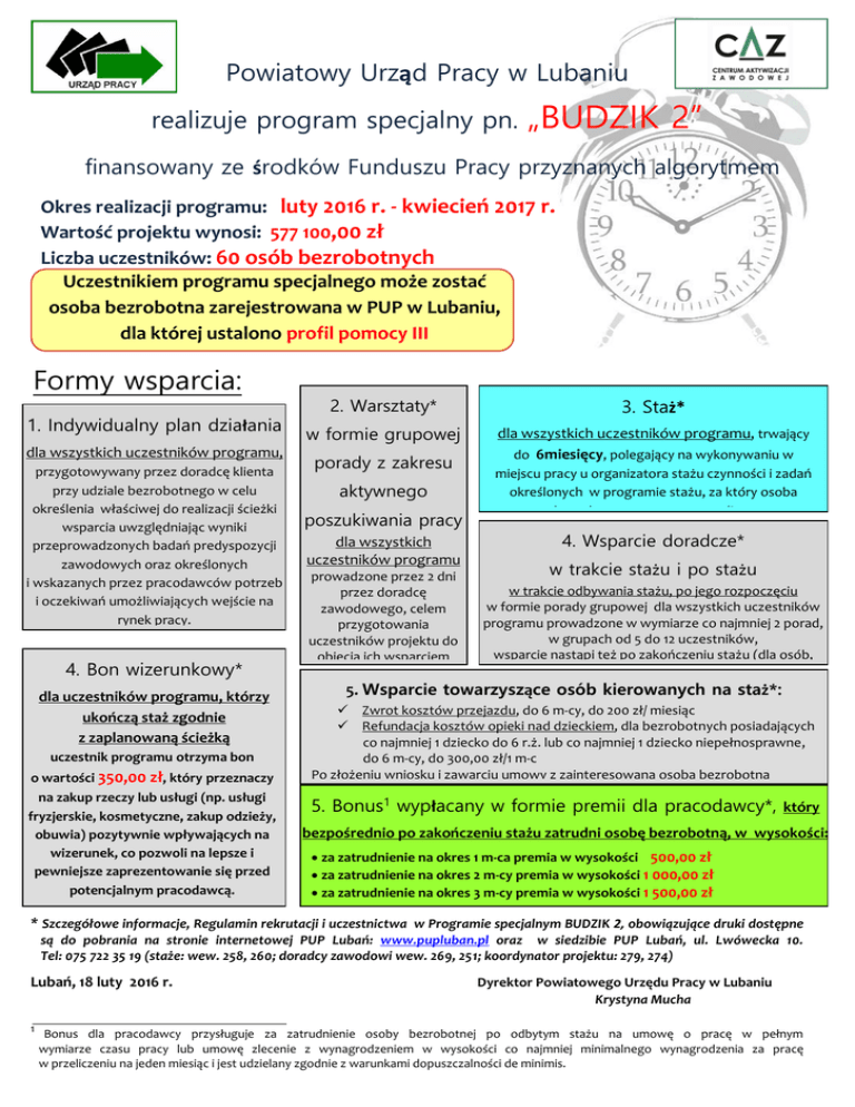 Powiatowy Urząd Pracy w Lubaniu realizuje program specjalny pn. „BUDZIK 2” finansowany ze środków Funduszu Pracy przyznanych algorytmem Okres realizacji programu: luty 2016 r. - kwiecień 2017 r. Wartość projektu wynosi: 577 100,00 zł Liczba uczestników: 60 osób bezrobotnych Uczestnikiem programu specjalnego może zostać osoba bezrobotna zarejestrowana w PUP w Lubaniu, dla której ustalono profil pomocy III Formy wsparcia: 1. Indywidualny plan działania dla wszystkich uczestników programu, przygotowywany przez doradcę klienta przy udziale bezrobotnego w celu określenia właściwej do realizacji ścieżki wsparcia uwzględniając wyniki przeprowadzonych badań predyspozycji zawodowych oraz określonych i wskazanych przez pracodawców potrzeb i oczekiwań umożliwiających wejście na rynek pracy. 4. Bon wizerunkowy* dla uczestników programu, którzy ukończą staż zgodnie z zaplanowaną ścieżką uczestnik programu otrzyma bon o wartości 350,00 zł, który przeznaczy na zakup rzeczy lub usługi (np. usługi fryzjerskie, kosmetyczne, zakup odzieży, obuwia) pozytywnie wpływających na wizerunek, co pozwoli na lepsze i pewniejsze zaprezentowanie się przed potencjalnym pracodawcą. 2. Warsztaty* 3. Staż* w formie grupowej dla wszystkich uczestników programu, trwający do 6miesięcy, polegający na wykonywaniu w porady z zakresu aktywnego poszukiwania pracy dla wszystkich uczestników programu miejscu pracy u organizatora stażu czynności i zadań określonych w programie stażu, za który osoba bezrobotna otrzyma stypendium 4. Wsparcie doradcze* w trakcie stażu i po stażu prowadzone przez 2 dni w trakcie odbywania stażu, po jego rozpoczęciu przez doradcę w formie porady grupowej dla wszystkich uczestników zawodowego, celem programu prowadzone w wymiarze co najmniej 2 porad, przygotowania w grupach od 5 do 12 uczestników, uczestników projektu do wsparcie nastąpi też po zakończeniu stażu (dla osób, objęcia ich wsparciem które nie podjęły zatrudnienia) w formie stażu i wejścia na rynek pracy. 5. Wsparcie towarzyszące osób kierowanych na staż*: Zwrot kosztów przejazdu, do 6 m-cy, do 200 zł/ miesiąc Refundacja kosztów opieki nad dzieckiem, dla bezrobotnych posiadających co najmniej 1 dziecko do 6 r.ż. lub co najmniej 1 dziecko niepełnosprawne, do 6 m-cy, do 300,00 zł/1 m-c Po złożeniu wniosku i zawarciu umowy z zainteresowaną osobą bezrobotną 5. Bonus1 wypłacany w formie premii dla pracodawcy*, który bezpośrednio po zakończeniu stażu zatrudni osobę bezrobotną, w wysokości: za zatrudnienie na okres 1 m-ca premia w wysokości 500,00 zł za zatrudnienie na okres 2 m-cy premia w wysokości 1 000,00 zł za zatrudnienie na okres 3 m-cy premia w wysokości 1 500,00 zł * Szczegółowe informacje, Regulamin rekrutacji i uczestnictwa w Programie specjalnym BUDZIK 2, obowiązujące druki dostępne są do pobrania na stronie internetowej PUP Lubań: www.pupluban.pl oraz w siedzibie PUP Lubań, ul. Lwówecka 10. Tel: 075 722 35 19 (staże: wew. 258, 260; doradcy zawodowi wew. 269, 251; koordynator projektu: 279, 274) Lubań, 18 luty 2016 r. Dyrektor Powiatowego Urzędu Pracy w Lubaniu Krystyna Mucha 1 Bonus dla pracodawcy przysługuje za zatrudnienie osoby bezrobotnej po odbytym stażu na umowę o pracę w pełnym wymiarze czasu pracy lub umowę zlecenie z wynagrodzeniem w wysokości co najmniej minimalnego wynagrodzenia za pracę w przeliczeniu na jeden miesiąc i jest udzielany zgodnie z warunkami dopuszczalności de minimis.