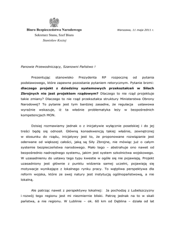 Biuro Bezpieczeństwa Narodowego Warszawa, 11 maja 2011 r. Sekretarz Stanu, Szef Biura Stanisław Koziej Panowie Przewodniczący, Szanowni Państwo ! Prezentując stanowisko Prezydenta RP rozpocznę od pytania podstawowego, które zapewne pozostanie pytaniem retorycznym. Pytanie brzmi: dlaczego projekt z dziedziny systemowych przekształceń w Siłach Zbrojnych nie jest projektem rządowym? Dlaczego to nie rząd projektuje takie zmiany? Dlaczego to nie rząd przekształca struktury Ministerstwa Obrony Narodowej? To pytanie jest tym bardziej zasadne, że regulacja wyraźnie wskazuje, iż ta właśnie problematyka leży w ustawowa bezpośrednich kompetencjach MON. Dzisiaj rozmawiamy jednak o z inicjatywie wyłącznie poselskiej i do jej treści będę się odnosił. Główną konsekwencją takiej właśnie, zewnętrznej w stosunku do rządu, inicjatywy jest to, że proponowane rozwiązanie jest oderwane od większej całości, jaką są Siły Zbrojne, nie mówiąc już o całym systemie bezpieczeństwa narodowego. Mało tego – abstrahuje ono nawet od bezpośrednio nadrzędnego systemu, jakim jest system szkolnictwa wojskowego. W uzasadnieniu do ustawy tego typu kwestie w ogóle się nie pojawiają. Projekt uzasadniony jest głównie z punktu widzenia samej uczelni, pojawiają się motywacje wynikające z lokalnego rynku pracy. To wątpliwa perspektywa dla reform wojska, które ze swej natury jest instytucją ogólnopaństwową, a nie lokalną. Ale patrząc nawet z perspektywy lokalnej: Ja pochodzę z Lubelszczyzny i rozwój tego regionu jest mi niezmiernie bliski. Patrzę jednak na to w skali państwa, a nie regionu. W Lublinie – ok. 60 km od Dęblina – działa od lat 5 uczelni akademickich (UMCS, KUL, Politechnika, Akademia Medyczna, Akademia Rolnicza). Czy ewentualna akademia w Dęblinie ma szanse skutecznie z nimi konkurować na wolnym rynku edukacyjnym? Rynku dodatkowo wysysanym przez pobliską Warszawę? To bardzo wątpliwe. Jeśli jednak na tworzenie kolejnej akademii wojskowej spojrzymy z właściwej perspektywy, tj. z perspektywy całości sił zbrojnych, to musimy stwierdzić, że zawetowana ustawa jest egzemplifikacją szerszego problemu, jakim jest reforma całego szkolnictwa wojskowego. Dla każdego, kto tylko w miarę uważnie obserwował przekształcenia Sił Zbrojnych w ostatnim 20-leciu, jest oczywiste, że szkolnictwo wojskowe jest najbardziej zapóźnioną w transformacji częścią Sił Zbrojnych. Siły Zbrojne od lat podlegają systematycznej konsolidacji. Redukuje się nie tylko ich liczebność, ale także liczbę jednostek organizacyjnych. Zgodnie z filozofią proponowaną w ustawie będzie rosła tylko jedna liczba: liczba wojskowych uczelni akademickich. Obecnie są trzy, Państwo chcecie utworzyć czwartą, w kolejce czeka piąta, a słyszałem także o szóstej. Za chwilę będzie ich więcej niż dywizji. To jest fatalne, antykonsolidacyjne zjawisko. To jest niespotykany na skalę światową proces rozproszenia potencjału edukacji wojskowej, który tą ustawą Państwo inicjujecie i przeprowadzacie. Spójrzmy, jak to wygląda w innych państwach. Kraj Liczebność Polska 100 tys. Liczba uczelni o statusie akademickim 3 (5) Niemcy 165 tys. 2 Francja 338 tys. 1 Wielka Brytania 178 tys. 1 Sił Zbrojnych Czy rzeczywiście musimy być tak negatywnie oryginalni? Uwagi Dodajmy do tego, że wśród studentów uczelni wojskowych jedynie ok. 10 proc. stanowią studenci wojskowi. Oznacza to, że na poziomie studenckim wojsko ma potencjał edukacyjny 10 razy przekraczający potrzeby Sił Zbrojnych. Biorąc nawet pod uwagę wszystkich szkolonych słuchaczy (studentów, doktorantów, kursantów) udział słuchaczy wojskowych wynosi około 25 proc. Oznacza to, że z punktu widzenia potrzeb szkoleniowych kadr oficerskich Siłom Zbrojnym potrzebna jest 1-2 uczelnie wyższe. I to jest model, do którego powinniśmy zmierzać. Pragnę zwrócić uwagę na jeszcze jeden aspekt tego problemu. Myślę, że dla każdego z nas w tej sali jest czymś zupełnie zrozumiałym, że w każdym systemie edukacyjnym szkół podstawowych jest więcej niż szkól średnich, tych zaś więcej niż uczelni wyższych, a wśród nich uniwersytetów jest mniej niż pozostałych. A jak Państwo myślicie, jak będzie wyglądał wojskowy system edukacyjny w razie pójścia w kierunku, jaki proponujecie swoją ustawą? Czy wiecie Państwo ile jest szkół podoficerskich w całych Siłach Zbrojnych? Są trzy! To liczba zdrowa. Każdy rodzaj Sił Zbrojnych ma swoją szkołę podoficerską. Otóż jeśli powstaną kolejne wojskowe uczelnie akademickie, to wojsko będzie ich miało dwa razy więcej niż szkół podoficerskich. To tak, jakby w Polsce było dwa razy więcej akademii niż szkół średnich. Chyba zgodzimy się wszyscy, że nie miałoby to żadnego sensu. Dlaczego zatem miałoby to mieć sens w wojsku? Chyba, że wyznajemy starodawną zasadę, że wojsko jest tak specyficzną instytucją, że jak mówił kapral: „W wojsku nawet logarytm może służyć do czyszczenia lufy”. Ale chyba dzisiaj jest już inaczej. Takich pytań, na które nie ma racjonalnej odpowiedzi, można zadać więcej. Przytoczę jedno: dlaczego mamy zwiększać liczbę uczelni akademickich, gdy obniżamy wymagania wobec wykształcenia oficerów do poziomu licencjata? Oficerów z wykształceniem magistra ma być dwa razy mniej, a uczelni o uprawnieniach do nadawania stopnia magistra dwa razy więcej. Gdzie tu jest logika? Dodajmy do tego, że tworzenie Akademii Lotniczej o proponowanych zadaniach (hybryda dowódczo-techniczno-medyczna) jest w istocie dublowaniem zadań w zakresie kształcenia medycznego na potrzeby Sił Zbrojnych (dzisiaj jest to zadanie Uniwersytetu Medycznego w Łodzi). Jeśli to ma być nazwane konsolidacją, to chyba konsolidacją dekonsolidacyjną. Na koniec zwrócę uwagę na jeszcze dwie sprawy. Pierwsza – to jakość profesjonalnego, zawodowego przygotowania i szkolenia kadr wojskowych. Do