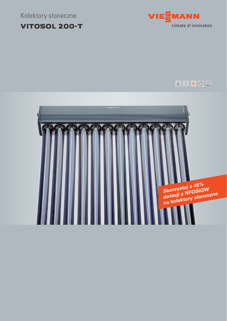 Kolektory słoneczne VITOSOL 200-T 5% taj z 4 s y z r W o Sk FOŚiG zne N z i j dotac tory słonec ek na kol Próżniowe kolektory słoneczne Vitosol 200-T Vitosol 200-T jest wysokoefektywnym kolektorem rurowym, działającym na zasadzie „rury termicznej” (heatpipe), do montażu w dowolnym położeniu Typ SPE + 45° Typ SP2A + 25° 0° Typ SP2A – 25° Typ SPE – 45° Montaż w dowolnym położeniu Kolektor rurowy Vitosol 200-T można instalować w dowolnym położeniu, co stwarza wysoką elastyczność w wyborze miejsca zamontowania. Można go równie dobrze montować na dachach, elewacjach i balkonach, jak i w wielkich instalacjach przemysłowych. Staje się on ponadto atrakcyjnym elementem architektonicznym. Łatwe instalowanie i szybkie ustawianie absorbera, dzięki podziałce kątowej na oprawach rur 5 lat gwarancji na kolektory słoneczne dofinansowane z NFOŚiGW Nowość! 5-letnia gwarancja udzielana przez firmę Viessmann na wszystkie kolektory dotowane Istotną zaletą kolektora Vitosol 200-T (typ SP2A) jest możliwość montażu na elewacji z możliwością ustawiania kątowego absorbera w zakresie plus/minus 25 stopni, celem maksymalnego wykorzystania energii słonecznej. Wariant Vitosol 200-T (typ SPE) wyposażony jest w rury większej średnicy i nadaje się idealnie do montażu na płasko w dużych instalacjach solarnych. Większy rozstaw rur pozwala ustawiać kąt absorbera w zakresie plus / minus 45 stopni. przez NFOŚiGW Vitosol 200-T, typ SPE Szybki i prosty montaż System montażu na dachu na jedynie dwóch szynach montażowych, mocowanych hakami lub kotwami krokwiowymi, znacznie ułatwia i przyspiesza montaż kolektora. Zakładanie rur nie wymaga ponadto otwierania skrzyni kolektorowej. Nowa konstrukcja kołpaków zabezpieczających na szynie dolnej uniemożliwia wypadnięcie rur. Przy pracach serwisowych, dzięki „suchemu wpięciu” można rury wymieniać łatwo i szybko, bez otwierania instalacji. Vitosol 200-T Typ SP2A średnica rur 70 mm 1 2 3 5 6 7 1 Wysokoskuteczna 2 „suche“ izolacja cieplna wpięcie, brak bezpośredniego kontaktu nośnika ciepła rury z cieczą w obiegu solarnym 3 Dwururowy wymiennik ciepła Duotec 4 Łatwa wymiana i ustawianie położenia kątowego rur 5 Absorber z wysokoselektywnym pokryciem 6 Heatpipe (rura termiczna) 7 Szyna dolna 1 5 Vitosol 200-T Typ SPE średnica rur 102 mm, idealny do dużych instalacji solarnych 2 3 4 Cechy produktu Próżniowy kolektor rurowy na zasadzie rury termicznej Heatpipe, także do montażu w pozycji leżącej Średnica rur: 70 mm (typ SP2A), 102 mm (typ SPE) Powierzchnie absorbera: 1,26 / 1,51 / 3,03 m2 (typ SP2A), 1,63 / 3,26 m2 (typ SPE) Skrzynia kolektora z aluminium Wymiennik ciepła Hydroform ze stali szlachetnej z izolacją z pianki melaminowej (typ SP2A), blokowy wymiennik ciepła (typ SPE) Wykonanie specjalne, jako moduł balkonowy (typ SP2A) 1 Blokowy 2 Rura wymiennik ciepła Al / Cu zbiorcza dla przyłączania obustronnego 3 Absorber z wysokoselektywnym pokryciem 4 Heatpipe (rura termiczna) 5 Łatwa wymiana i ustawianie położenia kątowego rur Korzyści dla Firmy Partnerskiej Uniwersalne zastosowanie, dzięki możliwości montażu w dowolnym położeniu Systemy montażowe: na dachu krytym dachówką panwiową, z mocowaniem hakami lub kotwami krokwiowymi, na dachu płaskim, na stojakach lub leżąco, na elewacji lub balkonie (poziomo) Prosta instalacja i szybkie ustawienie absorbera wg podziałki kątowej na oprawach rur Zabezpieczenie rur przed wypadnięciem kołpakami na szynie dolnej Wymiana rur przy napełnionej instalacji („suche wpięcie“) Zaprojektowane dla dużych instalacji i montażu na dachu płaskim na leżąco Korzyści dla Użytkownika Wysokie bezpieczeństwo eksploatacji dzięki technice heatpipe Stale wysoka wydajność Możliwość uniwersalnego zastosowania przez możliwość elastycznego ustawiania absorbera Atrakcyjny element architektoniczny w przypadku montażu na elewacji lub balkonie Mniejsza powierzchnia zajmowana w stosunku do kolektorów płaskich Viessmann sp. z o.o. ul. Karkonoska 65 53-015 Wrocław tel. 71/ 36 07 100 Infolinia: 801 0801 24 www.viessmann.pl Dane techniczne Vitosol 200-T Vitosol 200-T, typ SP2A Vitosol 200-T typ SP2A Typ Vitosol 200-T typ SP2A Vitosol 200-T typ SP2A Powierzchnia absorbera m2 1,26 1,51 3,03 Powierzchnia brutto m2 1,98 2,36 4,62 Powierzchnia apertury m2 1,41 1,69 3,38 szerokość mm 885 1 053 2 061 wysokość mm 2 241 2 241 2 241 głębokość mm 150 150 150 33 39 79 Wymiary Ciężar kg Vitosol 200-T, typ SPE Vitosol 200-T typ SPE Typ Powierzchnia absorbera Vitosol 200-T typ SPE m2 1,63 3,26 2 2,75 5,39 Powierzchnia brutto m Powierzchnia apertury m2 1,75 3,49 szerokość mm 1 220 1 220 wysokość mm 2 257 2 257 głębokość mm 174 174 57 113 Wymiary Ciężar kg Twój Fachowy Doradca: Zeskanuj kod i odwiedź nasz e-market! 9440 814 PL 06/2013 Treści chronione prawem autorskim. Kopiowanie i rozpowszechnianie tylko za zgodą posiadacza praw autorskich. Zmiany zastrzeżone. Opracowanie graficzne: [email protected] tu by wyszukać on-line kliknij najbliższego Partnera Handlowego lub Salon Firmowy Viessmann