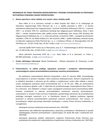 INFORMACJE NA TEMAT ŚRODKÓW BEZPIECZEŃSTWA I SPOSOBU POSTĘPOWANIA W PRZYPADKU WYSTĄPIENIA POWAŻNEJ AWARII PRZEMYSŁOWEJ 1. Nazwa operatora i adres zakładu oraz nazwa i adres siedziby spółki Baza Paliw nr 8 w Jastrowiu wchodzi w skład Zespołu Baz Paliw nr IV należącego do Operatora Logistycznego Paliw Płynnych Sp. z o. o. Spółka powstała w 1997 r. w wyniku wydzielenia paliwowych baz magazynowych z Centrali Produktów Naftowych CPN S.A. 1 stycznia 1997 r. ze struktur CPN S.A. wydzielono Dyrekcję Baz Magazynowych Naftobazy, która 1 lipca 1997 r. została zarejestrowana jako spółka prawa handlowego pod nazwą CPN Dyrekcja Baz Magazynowych Naftobazy Sp. z o. o. Dwa lata później, 12 kwietnia 1999 r. nastąpiło przeniesienie udziałów z CPN S.A. do Nafty Polskiej S.A. We wrześniu 2006 r. spółka Naftobazy zmieniła nazwę na Operator Logistyczny Paliw Płynnych Sp. z o. o. z siedzibą w Płocku. ul. Wyszogrodzka 133, 09‐ 410 Płock, tel.: 24 267 14 00, faks: 24 267 14 88, e‐mail: [email protected]. Centrala Spółki OLPP mieści się w Warszawie, przy ul. T. Chałubińskiego 8, 00‐613 Warszawa, tel.: 22 595 43 00, faks: 22 595 43 02, e‐mail: [email protected] Adres jednostki terenowej OLPP Sp. z o.o.: Baza Paliw nr 8 w Jastrowiu, ul. Polna 1, 64‐945 Jastrowie, e‐mail: [email protected] 2. Osoba udzielająca informacji: Marek Kwiatkowski – Główny Specjalista ds. Prewencji, e‐mail: [email protected] 3. Potwierdzenie, że zakład podlega regulacjom prawnym i przepisom administracyjnym ustanawiającym system przeciwdziałania poważnym awariom przemysłowym Na podstawie rozporządzenia Ministra Gospodarki z dnia 31 stycznia 2006, zmieniającego rozporządzenie w sprawie rodzajów i ilości substancji niebezpiecznych, których znajdowanie się w zakładzie decyduje o zaliczeniu go do zakładu o zwiększonym ryzyku albo zakładu o dużym ryzyku wystąpienia poważnej awarii przemysłowej (Dz. U. Nr 30, poz. 208), po zastosowaniu zasady sumowania zgodnie z pkt. 2 załącznika do przedmiotowego rozporządzenia Baza Paliw nr 8 w Jastrowiu jest zakładem o dużym ryzyku wystąpienia poważnej awarii przemysłowej (ZDR). Krajowe rozwiązania w zakresie przeciwdziałania poważnym awariom przemysłowym, ustanowione w ustawie Prawo ochrony środowiska, potwierdzają wdrożenie do prawodawstwa polskiego wymagań zawartych m.in. w Dyrektywie Seveso II, będącej podstawą regulacji prawnych w zakresie przeciwdziałania poważnym awariom przemysłowym. Tym samym, na prowadzącym zakład spoczywają obowiązki wynikające z ustawy Prawo ochrony środowiska, w szczególności: ‐ obowiązek ochrony środowiska przed awariami (art. 244 POŚ); ‐ zapewnienie, aby zakład był zaprojektowany, wykonany, prowadzony i likwidowany w sposób zapobiegający awariom przemysłowym i ograniczający ich skutki dla ludzi i środowiska (art. 249 POŚ); ‐ obowiązek zgłoszenia zakładu właściwemu organowi Państwowej Straży Pożarnej oraz przekazania do wiadomości wojewódzkiemu inspektorowi ochrony środowiska (art. 250 POŚ); ‐ obowiązek sporządzenia programu zapobiegania awariom, w którym przedstawiony zostaje system bezpieczeństwa gwarantujący ochronę ludzi i środowiska, stanowiący element ogólnego systemu zarządzania zakładem (art. 251 POŚ), ‐ obowiązek opracowania i wdrożenia systemu bezpieczeństwa gwarantującego ochronę ludzi i środowiska, stanowiącego element ogólnego systemu zarządzania zakładem (art. 252 POŚ), ‐ obowiązek opracowania raportu o bezpieczeństwie potwierdzającego, że zakład: jest przygotowany do stosowania programu zapobiegania awariom i do zwalczania awarii przemysłowych; spełnia warunki do wdrożenia systemu bezpieczeństwa; zostały przeanalizowane możliwości wystąpienia awarii przemysłowej i podjęto środki konieczne do zapobieżenia im; zostały zachowane zasady bezpieczeństwa oraz prawidłowego projektowania, wykonania i utrzymywania instalacji, w tym magazynów, urządzeń z wyłączeniem środków transportu i infrastruktury, związanej z działaniem mogącym powodować ryzyko wystąpienia awarii; opracowany został wewnętrzny plan operacyjno‐ ratowniczy oraz dostarczono informacje do opracowania zewnętrznych planów operacyjno‐ ratowniczych (art. 253 POŚ), ‐ obowiązek opracowania wewnętrznego planu operacyjno‐ratowniczego w celu zapobiegania, zwalczania i ograniczania skutków awarii przemysłowej, zawierający w szczególności: zakładane działania służące ograniczeniu skutków awarii przemysłowej dla ludzi i środowiska; propozycje metod i środków służących ochronie ludzi i środowiska przed skutkami awarii przemysłowej; informację o występujących zagrożeniach, podjętych środkach zapobiegawczych i działaniach, które będą podjęte w przypadku wystąpienia awarii przemysłowej; wskazanie sposobów usunięcia skutków awarii przemysłowej i przywrócenia środowiska do stanu poprzedniego, a w przypadku gdy nie jest to możliwe – określenie zabiegów, których celem jest rekultywacja; odniesienie do sposobów zapobiegania transgranicznym skutkom awarii przemysłowej (art. 260 POŚ), ‐ obowiązek dostarczenia komendantowi wojewódzkiemu Państwowej Straży Pożarnej oraz wojewódzkiemu inspektorowi ochrony środowiska wykazu zawierającego dane o rodzaju, kategorii i ilości substancji niebezpiecznych znajdujących się na terenie zakładu, a także do corocznego aktualizowania wykazu, według stanu na dzień 31 grudnia, w terminie do końca stycznia roku następnego (art. 263 POŚ), Zgodnie z intencją ustawodawcy wyżej wymienione obowiązki spoczywające na prowadzącym zakład zostały zrealizowane, zaś dokumentacja wynikająca z ustawy Prawo ochrony środowiska przekazana została w kwietniu 2009 r. komendantowi wojewódzkiemu Państwowej Straży Pożarnej w Poznaniu oraz wojewódzkiemu inspektorowi ochrony środowiska w Poznaniu. Potwierdzeniem dopełnienia p