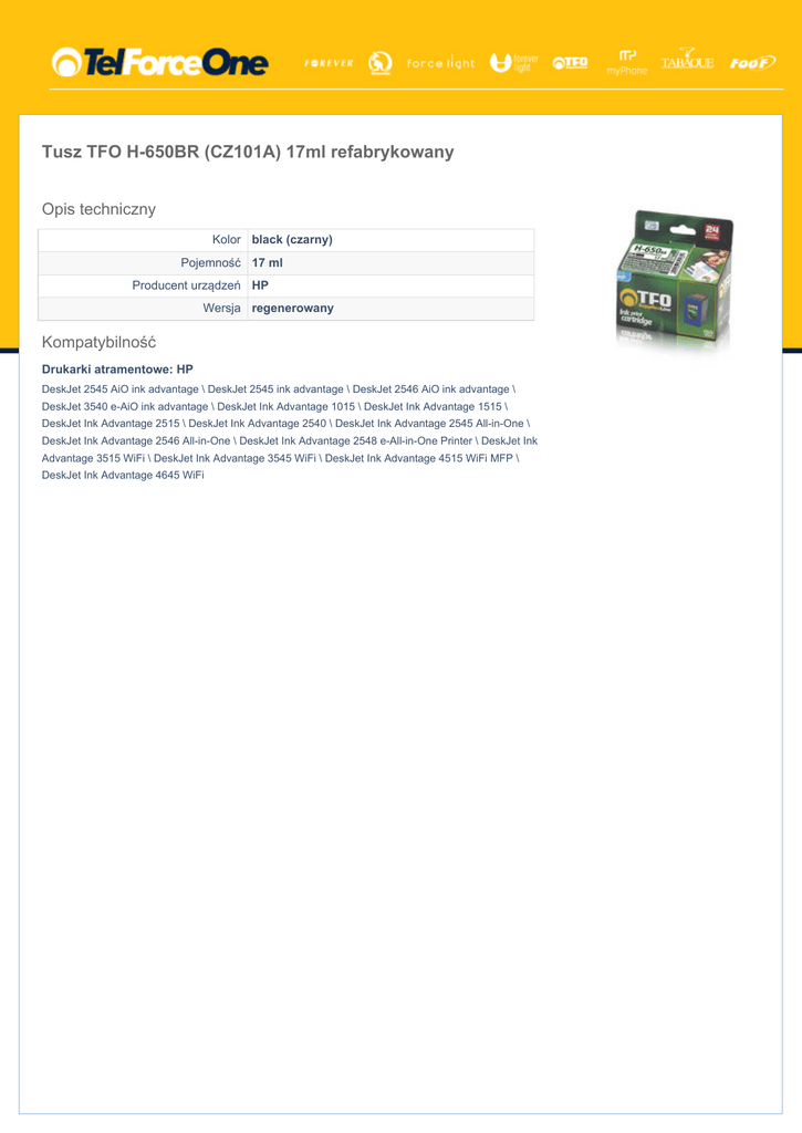 Tusz TFO H-650BR (CZ101A) 17ml refabrykowany Opis techniczny Kolor black (czarny) Pojemność 17 ml Producent urządzeń HP Wersja regenerowany Kompatybilność Drukarki atramentowe: HP DeskJet 2545 AiO ink advantage \ DeskJet 2545 ink advantage \ DeskJet 2546 AiO ink advantage \ DeskJet 3540 e-AiO ink advantage \ DeskJet Ink Advantage 1015 \ DeskJet Ink Advantage 1515 \ DeskJet Ink Advantage 2515 \ DeskJet Ink Advantage 2540 \ DeskJet Ink Advantage 2545 All-in-One \ DeskJet Ink Advantage 2546 All-in-One \ DeskJet Ink Advantage 2548 e-All-in-One Printer \ DeskJet Ink Advantage 3515 WiFi \ DeskJet Ink Advantage 3545 WiFi \ DeskJet Ink Advantage 4515 WiFi MFP \ DeskJet Ink Advantage 4645 WiFi
