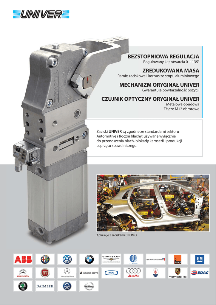 BEZSTOPNIOWA REGULACJA Regulowany kąt otwarcia 0 ÷ 135° ZREDUKOWANA MASA Ramię zaciskowe i korpus ze stopu aluminiowego MECHANIZM ORYGINAŁ UNIVER Gwarantuje powtarzalność pozycji CZUJNIK OPTYCZNY ORYGINAŁ UNIVER Metalowa obudowa Złącze M12 obrotowe Zaciski UNIVER są zgodne ze standardami sektoru Automotive i tłoczni blachy; używane wyłącznie do przenoszenia blach, blokady karoserii i produkcji osprzętu spawalniczego. Aplikacje z zaciskami CNOMO