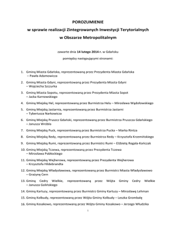 POROZUMIENIE w sprawie realizacji Zintegrowanych Inwestycji Terytorialnych w Obszarze Metropolitalnym zawarte dnia 14 lutego 2014 r. w Gdańsku pomiędzy następującymi stronami: 1. Gminą Miasta Gdańska, reprezentowaną przez Prezydenta Miasta Gdańska – Pawła Adamowicza 2. Gminą Miasta Gdyni, reprezentowaną przez Prezydenta Miasta Gdyni – Wojciecha Szczurka 3. Gminą Miasta Sopotu, reprezentowaną przez Prezydenta Miasta Sopot – Jacka Karnowskiego 4. Gminą Miejską Hel, reprezentowaną przez Burmistrza Helu – Mirosława Wądołowskiego 5. Gminą Miejską Jastarnia, reprezentowaną przez Burmistrza Jastarni – Tyberiusza Narkowicza 6. Gminą Miejską Pruszcz Gdański, reprezentowaną przez Burmistrza Pruszcza Gdańskiego – Janusza Wróbla 7. Gminą Miejską Puck, reprezentowaną przez Burmistrza Pucka – Marka Rintza 8. Gminą Miejską Redy, reprezentowaną przez Burmistrza Redy – Krzysztofa Krzemińskiego 9. Gminą Miejską Rumi, reprezentowaną przez Burmistrz Rumi – Elżbietę Rogala-Kończak 10. Gminą Miejską Tczewa, reprezentowaną przez Prezydenta Tczewa – Mirosława Pobłockiego 11. Gminą Miejską Wejherowa, reprezentowaną przez Prezydenta Wejherowa – Krzysztofa Hildebrandta 12. Gminą Miejską Władysławowa, reprezentowaną przez Burmistrz Miasta Władysławowo – Grażynę Cern 13. Gminą Cedry Wielkie, – Janusza Golińskiego reprezentowaną przez Wójta Gminy Cedry Wielkie 14. Gminą Kartuzy, reprezentowaną przez Burmistrz Gminy Kartuzy – Mirosławę Lehman 15. Gminą Kolbudy, reprezentowaną przez Wójta Gminy Kolbudy – Leszka Grombalę 16. Gminą Kosakowo, reprezentowaną przez Wójta Gminy Kosakowo – Jerzego Włudzika 1 17. Gminą Luzino, reprezentowaną przez Wójta Gminy Luzino – Jarosława Wejera 18. Gminą Pruszcz Gdański, reprezentowaną przez Wójt Gminy Pruszcz Gdański – Magdalenę Kołodziejczak 19. Gminą Przywidz, reprezentowaną przez Wójta Gminy Przywidz – Marka Zimakowskiego 20. Gminą Pszczółki, reprezentowaną przez Wójt Gminy Pszczółki – Hannę Brejwo 21. Gminą Przodkowo, reprezentowaną przez Wójta Gminy Przodkowo – Andrzeja Wyrzykowskiego 22. Gminą Puck, reprezentowaną przez Wójta Gminy Puck – Tadeusza Puszkarczuka 23. Gminą Somonino, reprezentowaną przez Wójta Gminy Somonino – Mariana Kryszewskiego 24. Gminą Stegna, reprezentowaną przez Wójt Gminy Stegna – Jolantę Kwiatkowską 25. Gminą Suchy Dąb, reprezentowaną przez Wójt Gminy Suchy Dąb – Barbarę Kamińską 26. Gminą Szemud, reprezentowaną przez Wójta Gminy Szemud – Ryszarda Kalkowskiego 27. Gminą Tczew, reprezentowaną przez Wójta Gminy Tczew – Romana Rezmerowskiego 28. Gminą Trąbki Wielkie, reprezentowaną przez Wójta Gminy Trąbki Wielkie – Błażeja Konkola 29. Gminą Wejherowo, reprezentowaną przez Wójta Gminy Wejherowo – Henryka Skwarło 30. Gminą Żukowo, reprezentowaną przez Burmistrza Gminy Żukowo – Jerzego Żurawicza 31. Powiatem Gdańskim, reprezentowanym przez Starostę Powiatu Gdańskiego – Cezarego Bieniasza-Krzywca 32. Powiatem Kartuskim, reprezentowanym przez Starostę Powiatu Kartuskiego - Janinę Kwiecień 33. Powiatem Nowodworskim, reprezentowanym przez Starostę Powiatu Nowodworskiego – Ewę Dąbską 34. Powiatem Puckim, reprezentowanym przez Starostę Powiatu Puckiego – Wojciecha Dettlaffa 35. Powiatem Tczewskim, reprezentowanym przez Starostę Powiatu Tczewskiego – Józefa Puczyńskiego 36. Powiatem Wejherowskim, reprezentowanym przez Starostę Powiatu Wejherowskiego – Józefa Reszke z których każda zwana jest członkiem Związku ZIT, zwana jest w dalszej części Porozumienia Stroną, a wszystkie łącznie – Związkiem ZIT. 2 Sygnatariuszami Porozumienia są również niżej wymienione podmioty, które mają względem Związku ZIT status obserwatorów, o którym mowa w § 4 niniejszego Porozumienia, w tym: 1. Stowarzyszenie „Gdański Obszar Metropolitalny” (GOM), reprezentowane przez Prezesa Zarządu Stowarzyszenia Gdański Obszar Metropolitalny - Pawła Adamowicza oraz niżej wymienione jednostki samorządu terytorialnego, zlokalizowane poza Obszarem Metropolitalnym, rozumianym zgodnie z definicją zawartą w § 1 niniejszego porozumienia: 2. Gmina Miejska Krynica Morska, reprezentowana przez Burmistrza Krynicy Morskiej – Adama Ostrowskiego 3. Gmina Miejska Lębork, reprezentowana przez Burmistrza Lęborka – Witolda Namyślaka 4. Gmina Miejska Łeba, reprezentowana przez Burmistrza Łeby – Andrzeja Strzechmińskiego 5. Gmina Miejska Malbork, reprezentowana przez Burmistrza Malborka – Andrzeja Rychłowskiego 6. Gmina Cewice, reprezentowana przez Wójta Gminy Cewice – Jerzego Pernala 7. Gmina Chmielno, reprezentowana przez Wójta Gminy Chmielno – Zbigniewa Roszkowskiego 8. Gmina Choczewo, reprezentowana przez Wójta Gminy Choczewo - Wiesława Gębkę 9. Gmina Gniew, reprezentowana przez Burmistrz Miasta i Gminy Gniew - Marię Taraszkiewicz-Gurzyńską 10. Gmina Gniewino, reprezentowana przez Wójta Gminy Gniewino – Zbigniewa Walczaka 11. Gmina Lichnowy, reprezentowana przez Wójta Gminy Lichnowy – Jana Michalskiego 12. Gmina Linia, reprezentowana przez Wójta Gminy Linia – Łukasza Jabłońskiego 13. Gmina Liniewo, reprezentowana przez Wójta Gminy Liniewo – Mirosława Warczaka 14. Gmina Łęczyce, reprezentowana przez Wójta Gminy Łęczyce – Piotra Wittbrodta 15. Gmina Krokowa, reprezentowana przez Wójta Gminy Krokowa – Henryka Doeringa 16. Miasto i Gmina Nowy Dwór Gdański, reprezentowana przez Burmistrza Nowego Dworu Gdańskiego – Jacka Michalskiego 17. Miasto i Gmina Nowy Staw, reprezentowana przez Burmistrza Nowego Stawu - Jerzego Szałacha 18. Gmina Ostaszewo, reprezentowana przez Wójta Gminy Ostaszewo – Roberta Ciżmowskiego 19. Gmina Pelplin, reprezentowana przez Burmistrza Pelplina – Andrzeja Stanucha 3 20. Gmina Sierakowice, reprezentowana przez Wójta Gminy Sierakowice – Tadeusza Kobielę 21. Gmina Stężyca, re