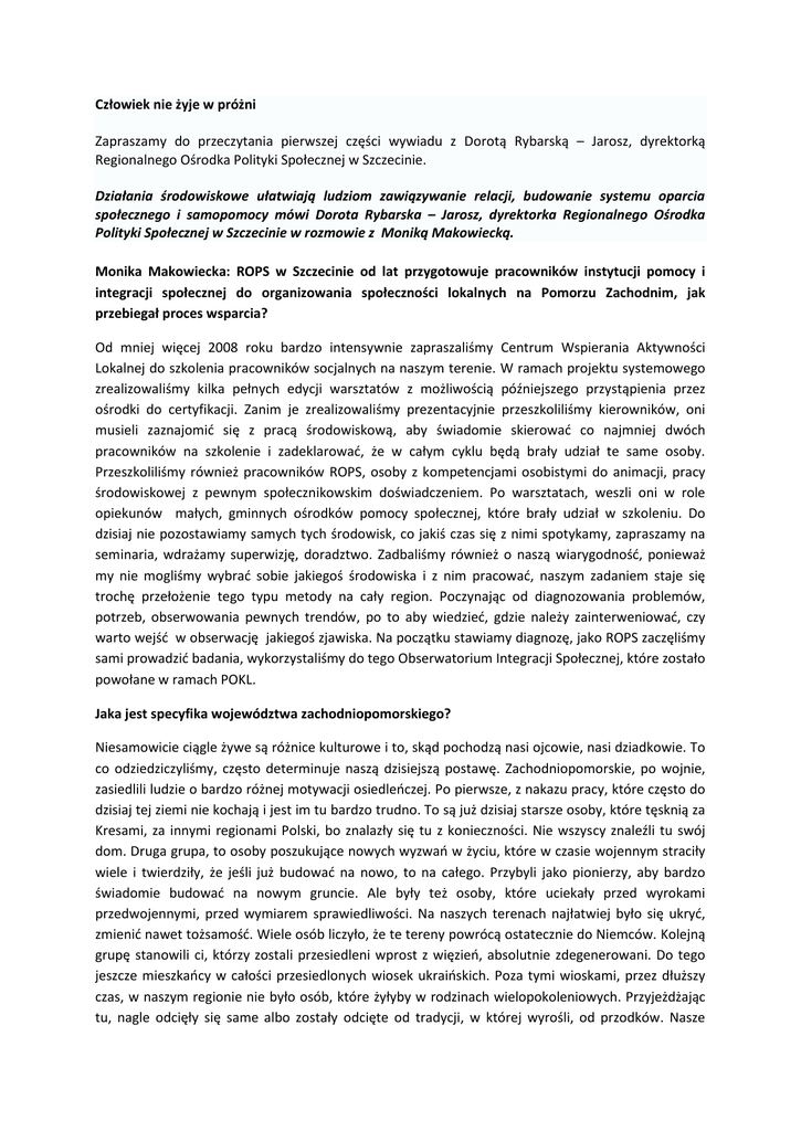 Człowiek nie żyje w próżni Zapraszamy do przeczytania pierwszej części wywiadu z Dorotą Rybarską – Jarosz, dyrektorką Regionalnego Ośrodka Polityki Społecznej w Szczecinie. Działania środowiskowe ułatwiają ludziom zawiązywanie relacji, budowanie systemu oparcia społecznego i samopomocy mówi Dorota Rybarska – Jarosz, dyrektorka Regionalnego Ośrodka Polityki Społecznej w Szczecinie w rozmowie z Moniką Makowiecką. Monika Makowiecka: ROPS w Szczecinie od lat przygotowuje pracowników instytucji pomocy i integracji społecznej do organizowania społeczności lokalnych na Pomorzu Zachodnim, jak przebiegał proces wsparcia? Od mniej więcej 2008 roku bardzo intensywnie zapraszaliśmy Centrum Wspierania Aktywności Lokalnej do szkolenia pracowników socjalnych na naszym terenie. W ramach projektu systemowego zrealizowaliśmy kilka pełnych edycji warsztatów z możliwością późniejszego przystąpienia przez ośrodki do certyfikacji. Zanim je zrealizowaliśmy prezentacyjnie przeszkoliliśmy kierowników, oni musieli zaznajomić się z pracą środowiskową, aby świadomie skierować co najmniej dwóch pracowników na szkolenie i zadeklarować, że w całym cyklu będą brały udział te same osoby. Przeszkoliliśmy również pracowników ROPS, osoby z kompetencjami osobistymi do animacji, pracy środowiskowej z pewnym społecznikowskim doświadczeniem. Po warsztatach, weszli oni w role opiekunów małych, gminnych ośrodków pomocy społecznej, które brały udział w szkoleniu. Do dzisiaj nie pozostawiamy samych tych środowisk, co jakiś czas się z nimi spotykamy, zapraszamy na seminaria, wdrażamy superwizję, doradztwo. Zadbaliśmy również o naszą wiarygodność, ponieważ my nie mogliśmy wybrać sobie jakiegoś środowiska i z nim pracować, naszym zadaniem staje się trochę przełożenie tego typu metody na cały region. Poczynając od diagnozowania problemów, potrzeb, obserwowania pewnych trendów, po to aby wiedzieć, gdzie należy zainterweniować, czy warto wejść w obserwację jakiegoś zjawiska. Na początku stawiamy diagnozę, jako ROPS zaczęliśmy sami prowadzić badania, wykorzystaliśmy do tego Obserwatorium Integracji Społecznej, które zostało powołane w ramach POKL. Jaka jest specyfika województwa zachodniopomorskiego? Niesamowicie ciągle żywe są różnice kulturowe i to, skąd pochodzą nasi ojcowie, nasi dziadkowie. To co odziedziczyliśmy, często determinuje naszą dzisiejszą postawę. Zachodniopomorskie, po wojnie, zasiedlili ludzie o bardzo różnej motywacji osiedleńczej. Po pierwsze, z nakazu pracy, które często do dzisiaj tej ziemi nie kochają i jest im tu bardzo trudno. To są już dzisiaj starsze osoby, które tęsknią za Kresami, za innymi regionami Polski, bo znalazły się tu z konieczności. Nie wszyscy znaleźli tu swój dom. Druga grupa, to osoby poszukujące nowych wyzwań w życiu, które w czasie wojennym straciły wiele i twierdziły, że jeśli już budować na nowo, to na całego. Przybyli jako pionierzy, aby bardzo świadomie budować na nowym gruncie. Ale były też osoby, które uciekały przed wyrokami przedwojennymi, przed wymiarem sprawiedliwości. Na naszych terenach najłatwiej było się ukryć, zmienić nawet tożsamość. Wiele osób liczyło, że te tereny powrócą ostatecznie do Niemców. Kolejną grupę stanowili ci, którzy zostali przesiedleni wprost z więzień, absolutnie zdegenerowani. Do tego jeszcze mieszkańcy w całości przesiedlonych wiosek ukraińskich. Poza tymi wioskami, przez dłuższy czas, w naszym regionie nie było osób, które żyłyby w rodzinach wielopokoleniowych. Przyjeżdżając tu, nagle odcięły się same albo zostały odcięte od tradycji, w której wyrośli, od przodków. Nasze środowisko długo było bardzo młode, żyło swoją własną kulturą. Nie było zaufania ludzi do ludzi, wręcz przeciwnie, ogromna nieufność, która z drugiej strony wzmacniała zaufanie do instytucji publicznych. Do dzisiaj mamy największe kolejki dobrowolnych zgłoszeń i zgłoszeń rodzin - osób starszych do domów pomocy społecznej, tego problemu nie ma na Podkarpaciu czy Lubelszczyźnie, bo tam jest zupełnie inny model rodziny. Rodzice zostają przy najmłodszym dziecku, w zamian ono dostaje mieszkanie, czy dom. I to jest proste, a u nas? U nas nie ma korzeni, rodzice nie chcą mieszkać z dziećmi, oni wolą pójść do instytucji. To rodzi ogromne implikacje dla pomocy społecznej, wymaga specyficznego planowania wsparcia. Kolejna sprawa, najwięcej dzieci przebywa w instytucjonalnej pieczy zastępczej, wprawdzie rodziny zastępcze wszędzie się zawiązuje, ale u nas w województwie wskaźnik instytucjonalnej pieczy jest najwyższy. Inny wskaźnik, najmniej osób niepełnosprawnych wchłania się na rynku pracy. Występuje roszczeniowa postawa, że państwo czy samorząd powinny „im” pomagać. I dalej, mamy najwięcej w Polsce rozwodów, na 1000 zawartych ślubów przypada 425 rozwodów. Ponad 38% dzieci rodzi się i wychowuje poza stałymi związkami, z czego na obszarach wiejskich jest ponad 43%, czyli co drugie dziecko. To jest zupełnie odmienny model rodziny niż w południowych regionach Polski. Spróbujmy sobie wyobrazić, że wspomniane dzieci za lat 30 powtórzą ten model, one wejdą w dorosłe życie i będą zarządzały społecznością. Jakie będzie zrozumienie dla spraw wspólnotowych, dla rodziny, dla starszych, dla osób niepełnosprawnych? Panująca sytuacja w regionie jest dla nas bardzo poważnym wyzwaniem. Przeprowadzona wnikliwa diagnoza regionu, umożliwiła zaplanowanie systemu wsparcia ROPS, jakie mechanizmy zostały uruchomione? Zaprosiliśmy region do zapoznania się z diagnozą i do dyskusji, co należy zrobić. Zaprosiliśmy przedstawicieli absolutnie różnych gmin, powiatów, przedstawicieli organizacji pozarządowych. Powołaliśmy do życia Zachodniopomorskie Forum Integracji Społecznej. Spotykamy się mniej więcej raz do roku w 