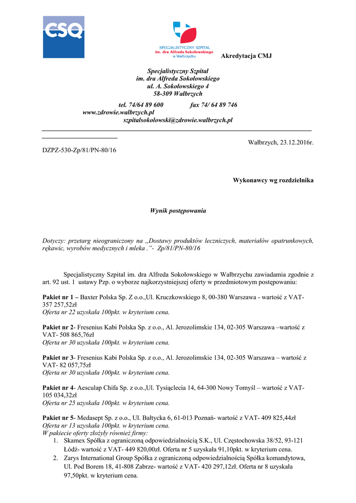 Akredytacja CMJ Specjalistyczny Szpital im. dra Alfreda Sokołowskiego ul. A. Sokołowskiego 4 58-309 Wałbrzych tel. 74/64 89 600 fax 74/ 64 89 746 www.zdrowie.walbrzych.pl [email protected] __________________________________________________________________________________ _______________________ Wałbrzych, 23.12.2016r. DZPZ-530-Zp/81/PN-80/16 Wykonawcy wg rozdzielnika Wynik postępowania Dotyczy: przetarg nieograniczony na ,,Dostawy produktów leczniczych, materiałów opatrunkowych, rękawic, wyrobów medycznych i mleka .”- Zp/81/PN-80/16 Specjalistyczny Szpital im. dra Alfreda Sokołowskiego w Wałbrzychu zawiadamia zgodnie z art. 92 ust. 1 ustawy Pzp. o wyborze najkorzystniejszej oferty w przedmiotowym postępowaniu: Pakiet nr 1 – Baxter Polska Sp. Z o.o.,Ul. Kruczkowskiego 8, 00-380 Warszawa - wartość z VAT357 257,52zł Oferta nr 22 uzyskała 100pkt. w kryterium cena. Pakiet nr 2- Fresenius Kabi Polska Sp. z o.o., Al. Jerozolimskie 134, 02-305 Warszawa –wartość z VAT- 508 865,76zł Oferta nr 30 uzyskała 100pkt. w kryterium cena. Pakiet nr 3- Fresenius Kabi Polska Sp. z o.o., Al. Jerozolimskie 134, 02-305 Warszawa – wartość z VAT- 82 057,75zł Oferta nr 30 uzyskała 100pkt. w kryterium cena. Pakiet nr 4- Aesculap Chifa Sp. z o.o.,Ul. Tysiąclecia 14, 64-300 Nowy Tomyśl – wartość z VAT105 034,32zł Oferta nr 25 uzyskała 100pkt. w kryterium cena. Pakiet nr 5- Medasept Sp. z o.o., Ul. Bałtycka 6, 61-013 Poznań- wartość z VAT- 409 825,44zł Oferta nr 13 uzyskała 100pkt. w kryterium cena. W pakiecie oferty złoŜyły równieŜ firmy: 1. Skamex Spółka z ograniczoną odpowiedzialnością S.K., Ul. Częstochowska 38/52, 93-121 Łódź- wartość z VAT- 449 820,00zł. Oferta nr 5 uzyskała 91,10pkt. w kryterium cena. 2. Zarys International Group Spółka z ograniczoną odpowiedzialnością Spółka komandytowa, Ul. Pod Borem 18, 41-808 Zabrze- wartość z VAT- 420 297,12zł. Oferta nr 8 uzyskała 97,50pkt. w kryterium cena. 3. Mercator Medical S.A., Ul. H.Modrzejewskiej 30, 31-327 Kraków- wartość z VAT410 773,68zł. Oferta nr 21 uzyskała 99,76pkt. w kryterium cena. 4. Abena Polska Sp. z o.o., Ul. Nowa 15, Łozienica, 72-100 Goleniów- wartość z VAT423 690,48zł. Oferta nr 23 uzyskała 96,72pkt. w kryterium cena. 5. Sorimex Sp. z o.o. Sp.k., Ul. Równinna 25, 87-100 Toruń- wartość z VAT- 414 018,00zł. Oferta nr 24 uzyskała 98,98pkt. w kryterium cena. 6. Toruńskie Zakłady Materiałów Opatrunkowych S.A., Ul. śółkiewskiego 20/26, 87-100 Toruń- wartość z VAT- 420 158,88zł. Oferta nr 26 uzyskała 97,54pkt. Pakiet nr 6- Mercator Medical S.A., Ul. H.Modrzejewskiej 30, 31-327 Kraków- wartość z VAT46 818,00zł Oferta nr 21 uzyskała 100pkt. w kryterium cena. W pakiecie oferty złoŜyły równieŜ firmy: 1. Skamex Spółka z ograniczoną odpowiedzialnością S.K., Ul. Częstochowska 38/52, 93-121 Łódź- wartość z VAT- 56 181,60zł. Oferta nr 5 uzyskała 83,33pkt. w kryterium cena. 2. Zarys International Group Spółka z ograniczoną odpowiedzialnością Spółka komandytowa, Ul. Pod Borem 18, 41-808 Zabrze- wartość z VAT- 48 690,72zł. Oferta nr 8 uzyskała 96,15pkt. w kryterium cena. 3. Centrum Zaopatrzenia Medycznego ,,CEZAL” S.A. Wrocław, Ul. Widna 4, 50-543 Wrocławwartość z VAT- 57 117,96zł. Oferta nr 19 uzyskała 81,96pkt. w kryterium cena. 4. Sorimex Sp. z o.o. Sp.k., Ul. Równinna 25, 87-100 Toruń- wartość z VAT- 47 754,36zł. Oferta nr 24 uzyskała 98,03pkt. w kryterium cena. 5. Toruńskie Zakłady Materiałów Opatrunkowych S.A., Ul. śółkiewskiego 20/26, 87-100 Toruń- wartość z VAT- 49 615,20zł. Oferta nr 26 uzyskała 94,36pkt. Pakiet nr 7- Zarys International Group Spółka z ograniczoną odpowiedzialnością Spółka komandytowa, Ul. Pod Borem 18, 41-808 Zabrze- wartość z VAT- 12 178,08zł. Oferta nr 8 uzyskała 100pkt. w kryterium cena. W pakiecie oferty złoŜyły równieŜ firmy: 1. Skamex Spółka z ograniczoną odpowiedzialnością S.K., Ul. Częstochowska 38/52, 93-121 Łódź- wartość z VAT- 14 821,92zł. Oferta nr 5 uzyskała 82,16pkt. w kryterium cena. 2. Mercator Medical S.A., Ul. H.Modrzejewskiej 30, 31-327 Kraków- wartość z VAT14 669,64zł. Oferta nr 21 uzyskała 83,01pkt. w kryterium cena. 3. Lohmann&Rauscher Polska Sp. z o.o., Ul. Moniuszki 14, 95-200 Pabianice- wartość z VAT19 796,40zł. Oferta nr 36 uzyskała 61,51pkt. w kryterium cena. Pakiet nr 8- Toruńskie Zakłady Materiałów Opatrunkowych S.A., Ul. śółkiewskiego 20/26, 87-100 Toruń- wartość z VAT- 45 036,95zł. Oferta nr 26 uzyskała 100pkt. w kryterium cena. Pakiet nr 9- Paul Hartmann Polska Sp. z o.o., Ul. Partyzancka 133/151, 95-200 Pabianice- wartość z VAT- 221 832,16zł Oferta nr 14 uzyskała 100pkt. w kryterium cena. Pakiet nr 10- Zarys International Group Spółka z ograniczoną odpowiedzialnością Spółka komandytowa, Ul. Pod Borem 18, 41-808 Zabrze- wartość z VAT- 5 273,64zł. Oferta nr 8 uzyskała 100pkt. w kryterium cena. W pakiecie ofertę złoŜyła równieŜ firma: 1. Paul Hartmann Polska Sp. z o.o., Ul. Partyzancka 133/151, 95-200 Pabianice- wartość z VAT6 698,16zł. Oferta nr 14 uzyskała 78,73pkt. w kryterium cena. 2. 3M Poland Sp. z o.o., Al. Katowicka 117, Kajetany k/Warszawy- wartość z VAT20 416,32zł. Oferta nr 33 uzyskała 25,83pkt. w kryterium cena. Pakiet nr 12- Lohmann&Rauscher Polska Sp. z o.o., Ul. Moniuszki 14, 95-200 Pabianice- wartość z VAT- 4 752,00zł. Oferta nr 36 uzyskała 100pkt. w kryterium cena. Pakiet nr 13- Zarys International Group Spółka z ograniczoną odpowiedzialnością Spółka komandytowa, Ul. Pod Borem 18, 41-808 Zabrze- wartość z VAT- 1 749,60zł. Oferta nr 8 uzyskała 100pkt. w kryterium cena. Pakiet nr 14- Neuca S.A., Ul. Szosa Bydgoska 58, 87-100 Toruń - wartość z VAT- 237 986,55zł. Oferta nr 40 uzyskała 100pkt. w kryterium cena. Pakiet nr 15- Konsorcjum: PGF Urtica Sp. z o.o., Ul. Krzemieniecka 120, 54-613 Wrocław, PGF S.A. ul. Zbąszyńska 3, 91-342 Łód