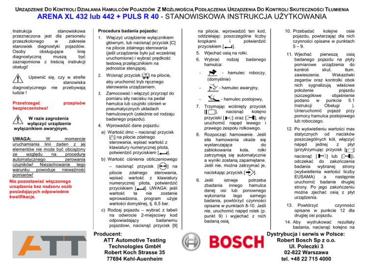 URZĄDZENIE DO KONTROLI DZIAŁANIA HAMULCÓW POJAZDÓW Z MOśLIWOŚCIĄ PODŁĄCZENIA URZĄDZENIA DO KONTROLI SKUTECZNOŚCI TŁUMIENIA ARENA XL 432 lub 442 + PULS R 40 - STANOWISKOWA INSTRUKCJA UśYTKOWANIA stanowiskowa przeznaczona jest dla personelu przeszkolonego w zakresie stanowisk diagnostyki pojazdów. Osoby obsługujące linię diagnostyczną muszą być zaznajomione z treścią instrukcji obsługi! Procedura badania pojazdu: 1. Włączyć urządzenie wyłącznikiem głównym, lub nacisnąć przycisk [C] na pilocie zdalnego sterowania (jeśli urządzenie było juŜ wcześniej uruchomione) i wybrać prędkość testową przełącznikiem na jednostce sterującej. Upewnić się, czy w strefie stanowiska diagnostycznego nie przebywają ludzie ! Wcisnąć przycisk [ ] na pilocie, aby uruchomić tryb ręcznego sterowania urządzeniem. 3. Zamocować i włączyć przyrząd do pomiaru siły nacisku na pedał hamulca lub czujniki ciśnień w pneumatycznych układach hamulcowych (zaleŜnie od rodzaju badanego pojazdu). 4. Wprowadzić dane pojazdu: a) Wartość dmc – nacisnąć przycisk [ ] na pilocie zdalnego sterowania, wpisać wartość z klawiatury numerycznej pilota, potwierdzić przyciskiem [ ]. b) Wartość ciśnienia obliczeniowego Instrukcja Przestrzegać bezpieczeństwa! przepisów W razie zagroŜenia wyłączyć urządzenie wyłącznikiem awaryjnym. UWAGA: W momencie uruchamiania linii Ŝaden z jej elementów nie moŜe być obciąŜony ze względu na procedurę automatycznego zerowania czujników! Niezachowanie tego warunku powoduje niewaŜność pomiarów! Nie pozostawiać włączonego urządzenia bez nadzoru osób posiadających odpowiednie kwalifikacje. 2. – nacisnąć przycisk [ ] na pilocie zdalnego sterowania, wpisać wartość z klawiatury numerycznej pilota, potwierdzić przyciskiem [ ]. UWAGA: jeśli wartość ta nie zostanie wprowadzona, program uŜyje wartości domyślnej, tj. 6,5 bar. c) Rodzaj pojazdu – wybrać z tabeli na odwrocie 2-miejscowy kod odpowiadający badanemu pojazdowi, nacisnąć przycisk [9] Producent: ATT Automotive Testing Technologies GmbH Robert Koch Strasse 35 77694 Kehl-Auenheim na pilocie, wprowadzić ten kod, oddzielając poszczególne liczby kropkami i potwierdzić przyciskiem [ ]. 5. Wjechać osią na rolki. 6. Wybrać rodzaj badanego hamulca: - - hamulec roboczy, (domyślnie) - hamulec awaryjny, - hamulec postojowy, 7. Trzymając wciśnięty przycisk ], nacisnąć kolejno [ przyciski [ ] oraz [ ], aby uruchomić napęd lewego i prawego zespołu rolkowego. 8. Rozpocząć hamowanie. Jeśli siła hamowania okaŜe się wystarczająca do zablokowania koła, rolki zatrzymają się automatycznie a wyniki zostaną zapamiętane. Jeśli nie, moŜna zatrzymać je, naciskając przycisk [ 10. Przebadać kolejne osie pojazdu, powtarzając dla nich czynności opisane w punktach 5 – 9. 11. Wjechać pierwszą osią badanego pojazdu na płyty pomiarowe urządzenia do kontroli skut. tłum. zawieszenia. Wskazówki zegarów oraz kontrolki obok nich sygnalizują właściwe połoŜenie pojazdu (szczegółowe objaśnienie podano w punkcie 5.1 Instrukcji Obsługi ). Unieruchomić pojazd przy pomocy hamulca postojowego lub roboczego. 12. Po wyświetleniu wartości mas statycznych od nacisków poszczególnych kół, włączyć napęd jednej z płyt (przytrzymując przycisk [ ] ] lub [ ]), nacisnąć [ odczekać do zakończenia badania wybranej strony (wyświetlenia wartości liczby EUSAMA) a następnie uruchomić badanie drugiej strony. Po jego zakończeniu moŜna zjechać osią z płyt urządzenia. ]. 9. Jeśli istnieje potrzeba zbadania innego hamulca danej osi lub ponownego wykonania tego samego badania, powtórzyć czynności opisane w punktach 8-10. Jeśli nie, uruchomić napęd rolek (p. punkt 9) i wyjechać z nich badaną osią. 13. Powtórzyć czynności opisane w punkcie 12 dla drugiej osi pojazdu. 14. Aby wydrukować rezultaty badania, nacisnąć kolejno na Dystrybucja i serwis w Polsce: Robert Bosch Sp z o.o. Ul. Poleczki 3 02-822 Warszawa tel. +48 22 715 4000 URZĄDZENIE DO KONTROLI DZIAŁANIA HAMULCÓW POJAZDÓW Z MOśLIWOŚCIĄ PODŁĄCZENIA URZĄDZENIA DO KONTROLI SKUTECZNOŚCI TŁUMIENIA ARENA XL 432 lub 442 + PULS R 40 - STANOWISKOWA INSTRUKCJA UśYTKOWANIA pilocie zdalnego przyciski: [ sterowania ] [1] [ ] lub ] [1] [3] [ ] (dla wydruku wyników kompletnego badania) lub ] [1] [4] [ ] (dla [ wydruku wyników odnośnie samego zawieszenia). Szczegółowe róŜnice pomiędzy dostępnymi protokołami opisano w aneksie do instrukcji obsługi urządzenia rolkowego. 15. Zakończyć badanie pojazdu, naciskając przycisk [ ]. 16. Jeśli wszystkie dane zostały poprawnie wprowadzone, wydruk zawierał będzie wynik oceny stanu technicznego pojazdu, dokonanej w oparciu o przepisy obowiązujące w Polsce. W przypadku wątpliwości lub problemów, prosimy o niezwłoczny kontakt z autoryzowanym serwisem producenta. SPOSÓB WYBORU DANYCH POJAZDU 1. Wybrać numer (kolumna Lp1) odpowiadający rodzajowi badanego pojazdu, wg poniŜszej tabeli: Lp1 Rodzaj pojazdu 2. Wybrać numer (kolumna Lp2) odpowiadający dacie pierwszej rejestracji badanego pojazdu, wg poniŜszej tabeli: Lp2 Data I-szej rejestracji pojazdu 1 do dnia 31.12.1993 2 od dnia 1 stycznia 1994 do dnia 30 czerwca 1999. 3 od dnia 1 lipca 1999. 1 Motocykl 2 Motocykl z wózkiem bocznym 3 Motorower 4 Pojazd trzykołowy o dmc do 1t. 5 Samochód osobowy 6 Autobus 7 Samochód cięŜarowy o dmc do 3,5t. 8 Samochód cięŜarowy o dmc powyŜej 3,5t. Przykład określenia kodu: 9 Przyczepa lub naczepa o dmc do 3,5t. 10 Przyczepa lub naczepa o dmc powyŜej 3,5t. Przykład 1: Samochód osobowy, zarejestrowany po raz pierwszy w dniu 18.05.1996, 11 Pojazd samochodowy inny niŜ wyŜej wymienione. 12 Ciągnik rolniczy, pojazd wolnobieŜny lub przyczepa przeznaczona do łączenia z tymi pojazdami UWAGA: szczegółowy opis procedury badania poszczególnych rodzajów pojazdów znajduje się w Instrukcji Obsługi. Producent: