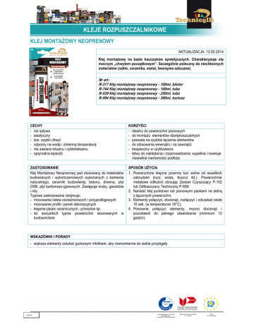KLEJ MONTAŻOWY NEOPRENOWY AKTUALIZACJA: 13.05.2014 Klej montażowy na bazie kauczuków syntetycznych. Charakteryzuje się mocnym „chwytem początkowym”. Szczególnie polecany do niechłonnych materiałów (szkło, ceramika, metal, tworzywa sztuczne). Nr art.: R-317 Klej montażowy neoprenowy - 100ml, blister R-744 Klej montażowy neoprenowy - 100ml, tuba R-539 Klej montażowy neoprenowy - 250ml, tuba R-594 Klej montażowy neoprenowy - 300ml, kartusz CECHY - nie spływa - elastyczny - tzw. szybki chwyt - odporny na wodę i zmienną temperaturę - nie zawiera toluenu i cykloheksanu - optymalna lepkość KORZYŚCI - idealny do powierzchni pionowych - do montażu elementów dźwiękoszczelnych - pozwala na szybkie łączenie elementów - do stosowania wewnątrz i na zewnątrz - bezpieczny w użytkowaniu - łatwy do nakładania i rozprowadzania; wypełnia i niweluje niewielkie nierówności podłoża ZASTOSOWANIE Klej Montażowy Neoprenowy jest stosowany do materiałów budowlanych i wykończeniowych wykonanych z kamienia naturalnego, ceramiki budowlanej, betonu, drewna, płyt OSB, płyt kartonowo-gipsowych. Zastępuje śruby, gwoździe i nity. Typowe zastosowanie obejmuje: - mocowanie listew ościeżnicowych i przypodłogowych - mocowanie profili i paneli dekoracyjnych - klejenie płytek ceramicznych, uchwytów itp. - do wszystkich typów powierzchni stosowanych w budownictwie SPOSÓB UŻYCIA 1. Powierzchnie klejone powinny być wolne od wszelkich zabrudzeń (kurz, woda, tłuszcz itd.). Powierzchnie metalowe odtłuścić stosując Zestaw Czyszczący P-102 lub Odtłuszczacz Techniczny P-959. 2. Nanieść klej punktowo lub pionowymi paskami na jedną z łączonych powierzchni. 3. Elementy połączyć, docisnąć, rozłączyć i odczekać około 10 sek. (w temperaturze 18°C). 4. Ponownie połączyć elementy, mocno docisnąć i pozostawić do pełnego utwardzenia (minimum 12 godzin). WSKAZÓWKI I PORADY - większe elementy ostukać gumowym młotkiem, aby równomiernie do siebie przylegały PD-PT KLEJ MONTAŻOWY NEOPRENOWY DANE TECHNICZNE nr art.: kod taryfy celnej: EAN: opakowanie: okres ważności: R -317/-744/-539/-594 3506 10 00 5902051001317 5902051001744 5902051001539 5902051000594 kolor: gęstość: czas otwartego schnięcia: pełne utwardzenie: odporność na temp.: jasnobrązowy 1,2 g/cm3 5 min. 12 godzin -30°C ÷ 60°C 100ml/100ml/250ml/300ml 36 miesięcy PRZECHOWYWANIE Przechowywać w temperaturze od 5°C do 25°C. Chronić przed wilgocią. PRODUKTY POKREWNE Klej Montażowy Bezbarwny, Klej Montażowy Dyspersyjny INFORMACJA DOTYCZĄCA BEZPIECZEŃSTWA I OCHRONY ZDROWIA Patrz: Karta charakterystyki preparatu chemicznego. UWAGA: Chronić przed dziećmi. Niniejsze informacje opierają się na aktualnym stanie wiedzy firmy NALMAT Trzebinia i są podane w celu opisania produktu. Nie mogą być interpretowane jako gwarancja jego właściwości. Na użytkowniku spoczywa obowiązek sprawdzenia przydatności wyrobu do określonych zastosowań oraz zapewnieniu bezpiecznego stanowiska pracy i przestrzegania wszystkich obowiązujących uregulowań prawnych. Dział handlowy: ul. Kościuszki 88, 32-540 Trzebinia tel. +48 32 612 10 10, fax. +48 32 612 10 66, Pon - Pt godz. 6:00 - 16:00 www.technicqll.pl [email protected] Produkcja i magazyn: ul. 22-go Lipca 64a, 32 -540 Trzebinia tel./fax. +48 32 711 53 27, tel./fax. +48 32 711 57 32, Pon - Pt godz. 6:00 - 14:00 PD-PT
