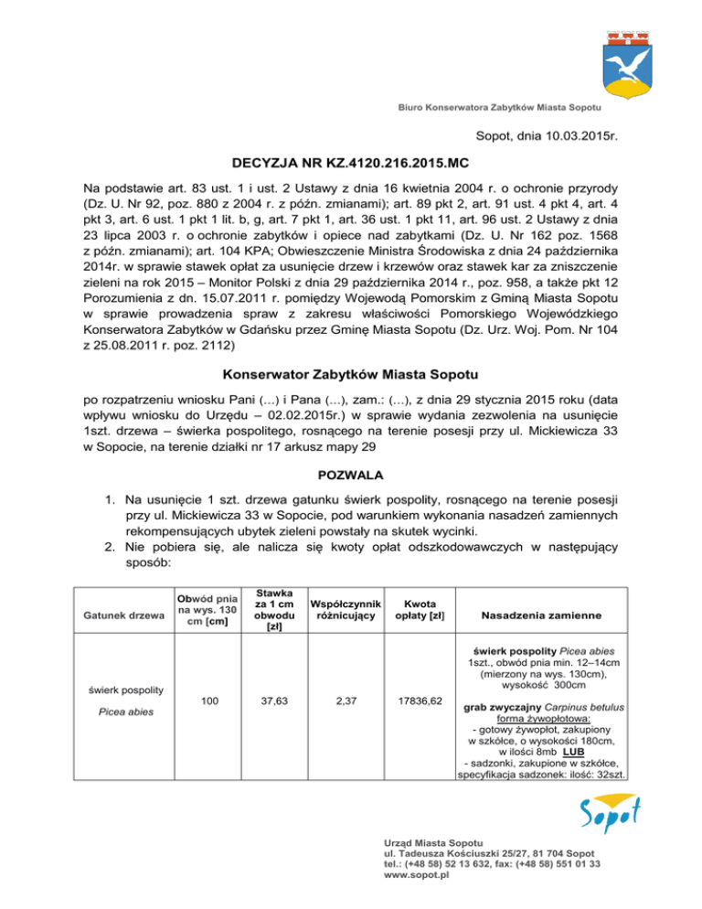 Biuro Konserwatora Zabytków Miasta Sopotu Sopot, dnia 10.03.2015r. DECYZJA NR KZ.4120.216.2015.MC Na podstawie art. 83 ust. 1 i ust. 2 Ustawy z dnia 16 kwietnia 2004 r. o ochronie przyrody (Dz. U. Nr 92, poz. 880 z 2004 r. z późn. zmianami); art. 89 pkt 2, art. 91 ust. 4 pkt 4, art. 4 pkt 3, art. 6 ust. 1 pkt 1 lit. b, g, art. 7 pkt 1, art. 36 ust. 1 pkt 11, art. 96 ust. 2 Ustawy z dnia 23 lipca 2003 r. o ochronie zabytków i opiece nad zabytkami (Dz. U. Nr 162 poz. 1568 z późn. zmianami); art. 104 KPA; Obwieszczenie Ministra Środowiska z dnia 24 października 2014r. w sprawie stawek opłat za usunięcie drzew i krzewów oraz stawek kar za zniszczenie zieleni na rok 2015 – Monitor Polski z dnia 29 października 2014 r., poz. 958, a także pkt 12 Porozumienia z dn. 15.07.2011 r. pomiędzy Wojewodą Pomorskim z Gminą Miasta Sopotu w sprawie prowadzenia spraw z zakresu właściwości Pomorskiego Wojewódzkiego Konserwatora Zabytków w Gdańsku przez Gminę Miasta Sopotu (Dz. Urz. Woj. Pom. Nr 104 z 25.08.2011 r. poz. 2112) Konserwator Zabytków Miasta Sopotu po rozpatrzeniu wniosku Pani (…) i Pana (…), zam.: (…), z dnia 29 stycznia 2015 roku (data wpływu wniosku do Urzędu – 02.02.2015r.) w sprawie wydania zezwolenia na usunięcie 1szt. drzewa – świerka pospolitego, rosnącego na terenie posesji przy ul. Mickiewicza 33 w Sopocie, na terenie działki nr 17 arkusz mapy 29 POZWALA 1. Na usunięcie 1 szt. drzewa gatunku świerk pospolity, rosnącego na terenie posesji przy ul. Mickiewicza 33 w Sopocie, pod warunkiem wykonania nasadzeń zamiennych rekompensujących ubytek zieleni powstały na skutek wycinki. 2. Nie pobiera się, ale nalicza się kwoty opłat odszkodowawczych w następujący sposób: Gatunek drzewa Obwód pnia na wys. 130 cm [cm] Stawka za 1 cm obwodu [zł] Współczynnik różnicujący Kwota opłaty [zł] świerk pospolity Picea abies 1szt., obwód pnia min. 12–14cm (mierzony na wys. 130cm), wysokość 300cm świerk pospolity 100 Picea abies Nasadzenia zamienne 37,63 2,37 17836,62 grab zwyczajny Carpinus betulus forma żywopłotowa: - gotowy żywopłot, zakupiony w szkółce, o wysokości 180cm, w ilości 8mb LUB - sadzonki, zakupione w szkółce, specyfikacja sadzonek: ilość: 32szt. Urząd Miasta Sopotu ul. Tadeusza Kościuszki 25/27, 81 704 Sopot tel.: (+48 58) 52 13 632, fax: (+48 58) 551 01 33 www.sopot.pl Biuro Konserwatora Zabytków Miasta Sopotu (4 szt./mb), obwód pnia min. 8-10 cm (mierzony na wys. 130cm), wysokość min. 250 cm Nasadzenia zamienne wyznaczono w oparciu o załącznik nr 3 do wniosku Pani i Pana (…), zam.: (…), z dnia 29 stycznia 2015 roku (data wpływu wniosku do Urzędu – 02.02.2015r.) (…) 3. Nalicza się opłaty odszkodowawcze za wycinkę drzewa o kwocie łącznej: 17 836,62 zł (słownie: siedemnaście tysięcy osiemset trzydzieści sześć złotych sześćdziesiąt dwa grosze). Zgodnie z art. 85 ust. 6 ustawy z dnia 16 kwietnia 2004r. o ochronie przyrody opłaty za usunięcie drzew i krzewów z terenu uzdrowisk, obszaru ochrony uzdrowiskowej, terenu nieruchomości wpisanej do rejestru zabytków oraz terenów zieleni są o 100% wyższe od opłat ustalonych na podstawie stawek, o których mowa w ust. 4 pkt. 1 i 2. 4. Kwotę opłaty odszkodowawczej odracza się na okres 3 lat od dnia dokonania nasadzeń zamiennych zieleni. Po upływie 3 lat wnioskodawca zobowiązany jest powiadomić tutejszy organ o terminie oględzin nasadzonych zamiennie drzew i krzewów. Jeżeli drzewa i krzewy zachowają swoją żywotność lub z przyczyn niezależnych od wnioskodawcy, żywotności nie zachowają – kwota opłaty odszkodowawczej zostanie umorzona. 5. Niespełnienie warunku wykonania nasadzeń zamiennych pociąga za sobą stwierdzenie wygaśnięcia decyzji (art. 162 § 1 pkt 2 KPA). Konsekwencją będzie wszczęcie postępowania o wymierzenie kary pieniężnej za usunięcie drzew i krzewów bez zezwolenia w rozumieniu art. 88 ust. 1 pkt 2 Ustawy z dnia 16 kwietnia 2004r. o ochronie przyrody. 6. Termin wykonania wycinki drzewa ustala się do dnia 30.12.2015r. 7. Termin wykonania nasadzeń zamiennych ustala się do dnia 30.04.2016r. 8. Miejsce wykonania nasadzeń zamiennych – miejsce na terenie omawianej posesji od strony ul. Mickiewicza i jednocześnie wzdłuż ogrodzenia przebiegającego na granicy z posesją nr 31, powstałe po realizacji planowanej rozbiórki istniejącego garażu, zgodnie z załącznikiem nr 3 do przedmiotowego wniosku (opracowanie graficzne). Wykonawcą prac powinna być firma specjalistyczna ds. zieleni. Termin ważności pozwolenia ustala się do 30.12.2015r., stosując w okresie od 1.03 do 15.10 zakazy określone w § 6.1. oraz § 8.1. Rozporządzenia Ministra Środowiska z dnia 06 października 2014r. w sprawie ochrony gatunkowej zwierząt (Dz. U. z 2014r. poz. 1348 z późn. zm.). Odpowiedzialny za prace jest inwestor. Urząd Miasta Sopotu ul. Tadeusza Kościuszki 25/27, 81 704 Sopot tel.: (+48 58) 52 13 632, fax: (+48 58) 551 01 33 www.sopot.pl Biuro Konserwatora Zabytków Miasta Sopotu Uzasadnienie Po rozpatrzeniu wniosku Pani (…) i Pana Dariusza (…), zam.: (…), z dnia 29 stycznia 2015 roku (data wpływu wniosku do Urzędu – 02.02.2015r.) w sprawie wydania zezwolenia na usunięcie 1szt. drzewa – świerka pospolitego, rosnącego na terenie posesji przy ul. Mickiewicza 33 w Sopocie, na terenie działki nr 17 arkusz mapy 29 oraz po dokonaniu oględzin w terenie, Konserwator Zabytków Miasta Sopotu uznał za zasadne wydanie zgody na usunięcie ww. świerka pod warunkiem dokonania nasadzeń zamiennych rekompensujących ubytek zieleni powstały na skutek wycinki. Przedmiotowe drzewo wskazano do usunięcia ze względu na planowane prace inwestycyjne – rozbiórka istniejącego garażu oraz budynku gospodarczego wraz z odbudową w miejscu pozwalającym na zintegrowanie z istniejącym budynkiem mieszkalnym. Zrealizowanie planowanej inwestycji przy jednoczesnym zachowaniu ww. świerka jest niemożliwe, 