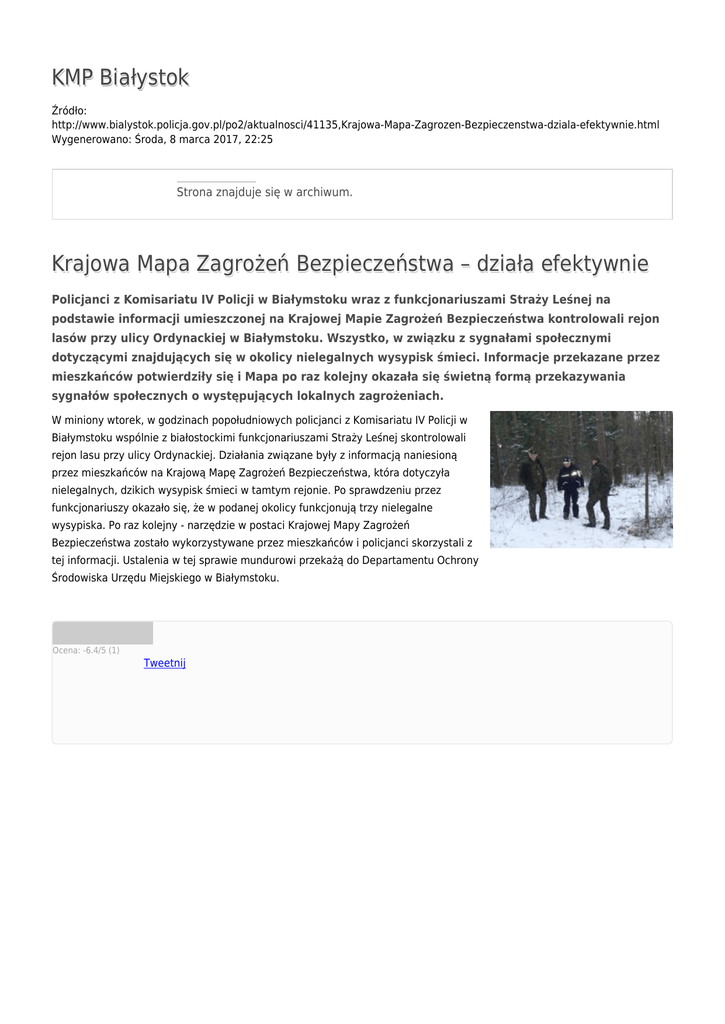 KMP Białystok Źródło: http://www.bialystok.policja.gov.pl/po2/aktualnosci/41135,Krajowa-Mapa-Zagrozen-Bezpieczenstwa-dziala-efektywnie.html Wygenerowano: Środa, 8 marca 2017, 22:25 Strona znajduje się w archiwum. Krajowa Mapa Zagrożeń Bezpieczeństwa – działa efektywnie Policjanci z Komisariatu IV Policji w Białymstoku wraz z funkcjonariuszami Straży Leśnej na podstawie informacji umieszczonej na Krajowej Mapie Zagrożeń Bezpieczeństwa kontrolowali rejon lasów przy ulicy Ordynackiej w Białymstoku. Wszystko, w związku z sygnałami społecznymi dotyczącymi znajdujących się w okolicy nielegalnych wysypisk śmieci. Informacje przekazane przez mieszkańców potwierdziły się i Mapa po raz kolejny okazała się świetną formą przekazywania sygnałów społecznych o występujących lokalnych zagrożeniach. W miniony wtorek, w godzinach popołudniowych policjanci z Komisariatu IV Policji w Białymstoku wspólnie z białostockimi funkcjonariuszami Straży Leśnej skontrolowali rejon lasu przy ulicy Ordynackiej. Działania związane były z informacją naniesioną przez mieszkańców na Krajową Mapę Zagrożeń Bezpieczeństwa, która dotyczyła nielegalnych, dzikich wysypisk śmieci w tamtym rejonie. Po sprawdzeniu przez funkcjonariuszy okazało się, że w podanej okolicy funkcjonują trzy nielegalne wysypiska. Po raz kolejny - narzędzie w postaci Krajowej Mapy Zagrożeń Bezpieczeństwa zostało wykorzystywane przez mieszkańców i policjanci skorzystali z tej informacji. Ustalenia w tej sprawie mundurowi przekażą do Departamentu Ochrony Środowiska Urzędu Miejskiego w Białymstoku. Ocena: -6.4/5 (1) Tweetnij