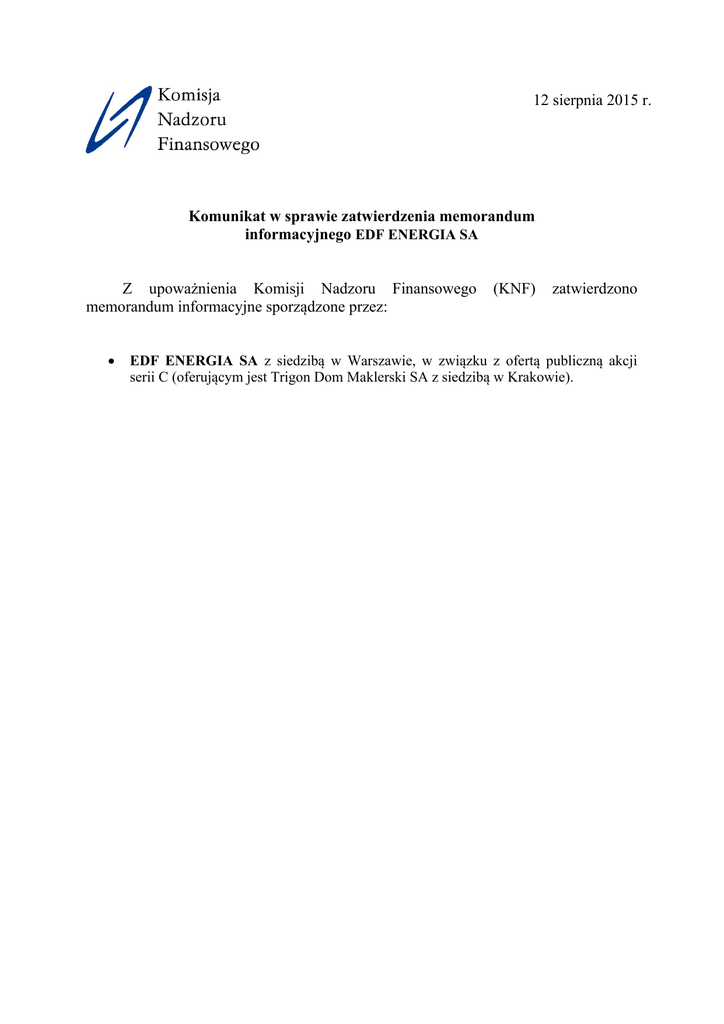 12 sierpnia 2015 r. Komunikat w sprawie zatwierdzenia memorandum informacyjnego EDF ENERGIA SA Z upoważnienia Komisji Nadzoru Finansowego memorandum informacyjne sporządzone przez: (KNF) zatwierdzono EDF ENERGIA SA z siedzibą w Warszawie, w związku z ofertą publiczną akcji serii C (oferującym jest Trigon Dom Maklerski SA z siedzibą w Krakowie). Memoranda informacyjne zatwierdzone przez KNF Lp. 1. Emitent EDF Energia S.A. z siedzibą w Warszawie Data zatwierdzenia memorandum informacyjnego 2016 r. Papiery wartościowe objęte memorandum informacyjnym Oferta publiczna Dopuszczenie do obrotu na rynku regulowanym Akcje serii C Nie dotyczy Sposób udostępnienia memorandum informacyjnego do publicznej wiadomości Termin udostępnienia memorandum informacyjnego do publicznej wiadomości Link Forma elektroniczna - b.d. Oferujący: Trigon Dom Maklerski SA z siedzibą w Krakowie