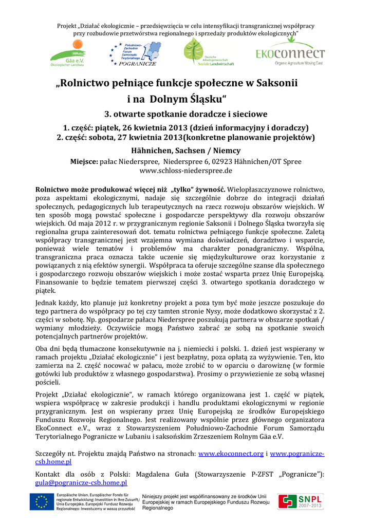 Projekt „Działać ekologicznie – przedsięwzięcia w celu intensyfikacji transgranicznej współpracy przy rozbudowie przetwórstwa regionalnego i sprzedaży produktów ekologicznych” „Rolnictwo pełniące funkcje społeczne w Saksonii i na Dolnym Śląsku“ 3. otwarte spotkanie doradcze i sieciowe 1. część: piątek, 26 kwietnia 2013 (dzień informacyjny i doradczy) 2. część: sobota, 27 kwietnia 2013(konkretne planowanie projektów) Hähnichen, Sachsen / Niemcy Miejsce: pałac Niederspree, Niederspree 6, 02923 Hähnichen/OT Spree www.schloss-niederspree.de Rolnictwo może produkować więcej niż „tylko“ żywność. Wielopłaszczyznowe rolnictwo, poza aspektami ekologicznymi, nadaje się szczególnie dobrze do integracji działań społecznych, pedagogicznych lub terapeutycznych na rzecz rozwoju obszarów wiejskich. W ten sposób mogą powstać społeczne i gospodarcze perspektywy dla rozwoju obszarów wiejskich. Od maja 2012 r. w przygranicznym regionie Saksonii i Dolnego Śląska tworzyła się regionalna grupa zainteresowań dot. tematu rolnictwa pełniącego funkcje społeczne. Zaletą współpracy transgranicznej jest wzajemna wymiana doświadczeń, doradztwo i wsparcie, ponieważ wiele tematów i problemów ma charakter ponadgraniczny. Wspólna, transgraniczna praca oznacza także uczenie się międzykulturowe oraz korzystanie z powiązanych z nią efektów synergii. Współpraca ta oferuje szczególne szanse dla społecznego i gospodarczego rozwoju obszarów wiejskich i może zostać wsparta przez Unię Europejską. Finansowanie to będzie tematem pierwszej części 3. otwartego spotkania doradczego w piątek. Jednak każdy, kto planuje już konkretny projekt a poza tym być może jeszcze poszukuje do tego partnera do współpracy po tej czy tamten stronie Nysy, może dodatkowo skorzystać z 2. części w sobotę. Np. gospodarze pałacu Niederspree poszukują partnera w obszarze spotkań / wymiany młodzieży. Oczywiście mogą Państwo zabrać ze sobą na spotkanie swoich potencjalnych partnerów projektów. Oba dni będą tłumaczone konsekutywnie na j. niemiecki i polski. 1. dzień jest wspierany w ramach projektu „Działać ekologicznie” i jest bezpłatny, poza opłatą za wyżywienie. Ten, kto zamierza na 2. część nocować w pałacu, może zrobić to w oparciu o darowiznę (w formie gotówki lub produktów z własnego gospodarstwa). Prosimy o przywiezienie ze sobą własnej pościeli. Projekt „Działać ekologicznie“, w ramach którego organizowana jest 1. część w piątek, wspiera współpracę w zakresie produkcji i handlu produktami ekologicznymi w regionie przygranicznym. Jest on wspierany przez Unię Europejską ze środków Europejskiego Funduszu Rozwoju Regionalnego. Jest realizowany wspólnie przez głównego organizatora EkoConnect e.V., wraz z Stowarzyszeniem Południowo-Zachodnie Forum Samorządu Terytorialnego Pogranicze w Lubaniu i saksońskim Zrzeszeniem Rolnym Gäa e.V. Szczegóły nt. Projektu znajdą Państwo na stronach: www.ekoconnect.org i www.pograniczecsb.home.pl Kontakt dla osób z Polski: Magdalena Guła (Stowarzyszenie P-ZFST „Pogranicze”): [email protected] Niniejszy projekt jest współfinansowany ze środków Unii Europejskiej w ramach Europejskiego Funduszu Rozwoju Regionalnego Projekt „Działać ekologicznie – przedsięwzięcia w celu intensyfikacji transgranicznej współpracy przy rozbudowie przetwórstwa regionalnego i sprzedaży produktów ekologicznych” „Rolnictwo pełniące funkcje społeczne w Saksonii i na Dolnym Śląsku“ 3. otwarte spotkanie doradcze i sieciowe PROGRAM 1. część: piątek, 26. kwietnia 2013 09.30-10.00 Przyjazd i kawa powitalna. 10.00-10.45 Powitanie, wprowadzenie, przedstawienie uczestników. Moderacja: Inka Sachse, EkoConnect e.V. 10.45- 11.45 Perpektywy w okresie finansowania UE / możliwości wsparcia od roku 2014 oraz bezpośrednie pytania – Specjalistyczny wykład M. Wittenberg i NN 11.45-12.15 Przerwa kawowa 12.15-13.15 Regionalne możliwości finansowania, fundacje oraz bezpośrednie pytania – SAB / Urząd Marszałkowski / Fundacja NN 13.15–14.00 Obiad 14.00-14.45 Oprowadzanie po gospodarstwie i prezentacja „Schloss Niederspree“. H. Lauterbach/Working Team e.V. 15.00-16.00 Warsztat w małych grupach dot. pytań i planów projektowych Moderacja: A. Schall 16.00-16.30 Przerwa kawowa 16.30–17.30 Odpowiedzi na pytania i perspektywy dalszych działań sieci Moderacja: A. Schall 17.30 Wyjazd uczestników, którzy nie nocują. 18.00 -19.00 Kolacja 20.00 Szczegółowa prezentacja uczestników z ich wizjami projektów (wieczór społeczny) Niniejszy projekt jest współfinansowany ze środków Unii Europejskiej w ramach Europejskiego Funduszu Rozwoju Regionalnego Projekt „Działać ekologicznie – przedsięwzięcia w celu intensyfikacji transgranicznej współpracy przy rozbudowie przetwórstwa regionalnego i sprzedaży produktów ekologicznych” 2. część: sobota, 27. kwietnia 2013 8.00 - 9.00 Śniadanie 9.00 - 10.30 Praca z partnerem projektowym nad konkretnymi projektami / zainicjowanymi kooperacjami lub, jeśli nie ma jeszcze partnera projektowego, wspólna praca nad przykładowym projektem: Życzenia i oczekiwania wobec wspólnego projektu? (treść, sprawy organizacyjne etc.) 10.30 – 11.00 Przerwa kawowa 11.00 - 13.00 Podsumowanie życzeń i posortowanie wg grup tematycznych. 13.00 – 14.00 Przerwa obiadowa 14.00 – 15.30 Opracowanie tematów istotnych do wspierania z grup tematycznych: Na co zwrócić uwagę, jakie możliwości dofinansowani ma nasz projekt? 15.30 – 16.00 Runda podsumowująca Zakończenie z przerwą kawową i wyjazd. Spotkanie jest bezpłatne, poza stosowną darowizną na wyżywienie i nocleg. Osoby nocujące prosimy o przywiezienie własnej pościeli. Wykłady i dyskusje będą tłumaczone konsekutywnie na język niemiecki i polski. Prosimy o wiążące zgłoszenia, wraz z informację, czy chcą Państwo wziąć udział w spo