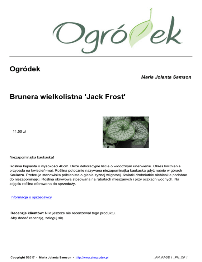 Ogródek Maria Jolanta Samson Brunera wielkolistna 'Jack Frost' 11.50 zł Niezapominajka kaukaska! Roślina kępiasta o wysokości 40cm. Duże dekoracyjne liście o widocznym unerwieniu. Okres kwitnienia przypada na kwiecień-maj. Roślina potocznie nazywana niezapominajką kaukaska gdyż rośnie w górach Kaukazu. Preferuje stanowiska półcieniste o glebie żyznej wilgotnej. Kwiatki drobniutkie niebieskie podobne do niezapominajki. Roślina okrywowa stosowana na rabatach mieszanych i przy oczkach wodnych. Na zdjęciu roślina oferowana do sprzedaży. Informacja o sprzedawcy Recenzje klientów: Nikt jeszcze nie recenzował tego produktu. Aby dodać recenzję, zaloguj się. Copyright Š2017 - Maria Jolanta Samson - http://www.el-ogrodek.pl _PN_PAGE 1 _PN_OF 1