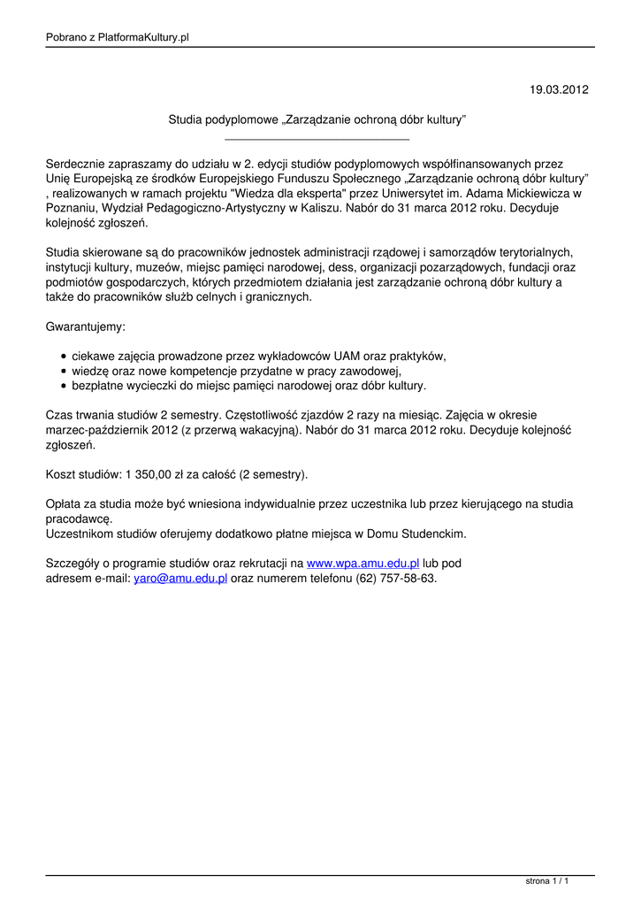 Pobrano z PlatformaKultury.pl 19.03.2012 Studia podyplomowe „Zarządzanie ochroną dóbr kultury” ____________________________ Serdecznie zapraszamy do udziału w 2. edycji studiów podyplomowych współfinansowanych przez Unię Europejską ze środków Europejskiego Funduszu Społecznego „Zarządzanie ochroną dóbr kultury” , realizowanych w ramach projektu "Wiedza dla eksperta" przez Uniwersytet im. Adama Mickiewicza w Poznaniu, Wydział Pedagogiczno-Artystyczny w Kaliszu. Nabór do 31 marca 2012 roku. Decyduje kolejność zgłoszeń. Studia skierowane są do pracowników jednostek administracji rządowej i samorządów terytorialnych, instytucji kultury, muzeów, miejsc pamięci narodowej, dess, organizacji pozarządowych, fundacji oraz podmiotów gospodarczych, których przedmiotem działania jest zarządzanie ochroną dóbr kultury a także do pracowników służb celnych i granicznych. Gwarantujemy: ciekawe zajęcia prowadzone przez wykładowców UAM oraz praktyków, wiedzę oraz nowe kompetencje przydatne w pracy zawodowej, bezpłatne wycieczki do miejsc pamięci narodowej oraz dóbr kultury. Czas trwania studiów 2 semestry. Częstotliwość zjazdów 2 razy na miesiąc. Zajęcia w okresie marzec-październik 2012 (z przerwą wakacyjną). Nabór do 31 marca 2012 roku. Decyduje kolejność zgłoszeń. Koszt studiów: 1 350,00 zł za całość (2 semestry). Opłata za studia może być wniesiona indywidualnie przez uczestnika lub przez kierującego na studia pracodawcę. Uczestnikom studiów oferujemy dodatkowo płatne miejsca w Domu Studenckim. Szczegóły o programie studiów oraz rekrutacji na www.wpa.amu.edu.pl lub pod adresem e-mail: [email protected] oraz numerem telefonu (62) 757-58-63. strona 1 / 1