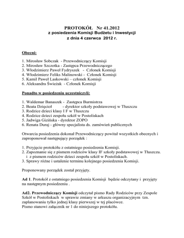 PROTOKÓŁ Nr 41.2012 z posiedzenia Komisji Budżetu i Inwestycji z dnia 4 czerwca 2012 r. Obecni: 1. Mirosław Sobczak - Przewodniczący Komisji 2. Mirosław Szczotka - Zastępca Przewodniczącego 3. Włodzimierz Paweł Fydryszek - Członek Komisji 4. Włodzimierz Feliks Malinowski - Członek Komisji 5. Kamil Paweł Laskowski – członek Komisji 6. Aleksandra Świeżak - Członek Komisji Ponadto w posiedzeniu uczestniczyli: 1. Waldemar Banaszek - Zastępca Burmistrza 2. Beata Dzięcioł - dyrektor szkoły podstawowej w Tłuszczu 3. Rodzice dzieci klasy I F w Tłuszczu 4. Rodzice dzieci zespołu szkół w Postoliskach 5. Jadwiga Gizińska - dyrektor ZOPO 6. Renata Duraj - główny specjalista ds. zamówień publicznych Otwarcia posiedzenia dokonał Przewodniczący powitał wszystkich obecnych i zaproponował następujący porządek : 1. Przyjęcie protokółu z ostatniego posiedzenia Komisji. 2. Zapoznanie się z pismem rodziców klasy IF szkoły podstawowej w Tłuszczu. i z pismem rodziców dzieci zespołu szkół w Postoliskach. 3. Sprawy różne i ustalenie terminu kolejnego posiedzenia Komisji. Proponowany porządek został przyjęty. Ad 1. Protokół z ostatniego posiedzenia Komisji będzie odczytany i przyjęty na następnym posiedzeniu . Ad2. Przewodniczący Komisji odczytał pismo Rady Rodziców przy Zespole Szkół w Postoliskach w sprawie zmiany w arkuszu organizacyjnym tzn. zaplanowaniu tylko jednej klasy pierwszej w tej placówce. Pismo stanowi załącznik nr 1 do niniejszego protokółu. 2 Rodzic - jesteśmy zaniepokojeni faktem utworzenia tak licznej klasy pierwszej składającej się z 6-ścio i 7-mio latków i mamy obawy odnośnie jakości procesu edukacji. Chcemy żeby nam Państwo pozwolili, aby ta druga klasa powstała. Przewodniczący Komisji - przełożony został termin posiedzenia Komisji ze względu na pismo rodziców w sprawie klasy IF w Tłuszczu ( załącznik nr 2 do niniejszego protokółu) i Komisja nie spodziewała się tak licznego grona rodziców dzieci z zespołu szkół w Postoliskach oraz tego, że jest tak duże zainteresowanie tym problemem. Chciałem powiedzieć, że w całej tej sprawie należy rozdzielić kontekst polityczny i emocjonalny od aspektu ekonomicznego. Komisja nie zajmuje się sprawami związanymi ze sposobem, koniecznością powołania klas . Komisja omówi tylko to, czym się zajmuje, tzn. jeżeli jest zgodność wielkości klas z przepisami i nie stoi nic na przeszkodzie, żeby ta wielkość tej klasy była, to moim zdaniem w przypadku tej klasy nie ma przeciwwskazań. Jeśli chodzi o stronę dydaktyczną, to może mieć wpływ, aczkolwiek informacje jakie posiada i publikuje MEN, wzrost do tej wielkości klasy ma znaczenie, ale nie ma zasadniczego znaczenia na proces kształcenia. Bardziej tutaj sposób i wyposażenie placówki ma wpływ na ten efekt końcowy jakim jest przyswojenie tego materiału, jak jest przekazywany dzieciom. Rodzic - polemizowałabym . Przewodniczący Komisji - wie Pani , możemy dyskutować, ale Gmina jako organ prowadzący przy tej zasobności środków jakie posiada, jakie są koszty i jakie są pilne zobowiązania, które należy zrealizować, żeby wszystkie placówki mogły funkcjonować, przedstawi Państwu za chwilę Burmistrz Banaszek. Przepisy w przedziale klas I-III dopuszczają do 26 dzieci, a w pozostałych grupach Ministerstwo nie precyzuje tego, daje dowolność samorządom. Wiemy, że ta klasa do przesady nie może być duża, bo ten efekt końcowy może nie być wysoki. Wiemy, że ta reforma w naszej Gminie powinna być wprowadzana po konsultacjach z rodzicami, ale wiemy też, że wszystkiego nie da się wprowadzić i informować z dużym wyprzedzeniem. Odpowiedzialnym za oświatę i funkcjonowanie w naszej Gminie jest Burmistrz Banaszek i stara się pilnować, abyśmy nie stanęli przed dylematem konieczności zamknięcia jakiejś placówki, bo nie wystarczy środków na utrzymanie. Na razie nie stoimy przed takim zagrożeniem, dokładamy duże środki do subwencji, Pan Burmistrz za chwilę to przedstawi. Z przykrością muszę powiedzieć, że będziemy ograniczać koszty związane z oświatą na tyle, na ile pozwolą przepisy, przy jednoczesnym podnoszeniu standardu wyposażenia i edukacji. 3 Zastępca Burmistrza – jest ogólny kryzys w kraju, który dotyka również szkolnictwo, zamykane są szkoły. Komisja Budżetowa i Rewizyjna kilkakrotnie zwracały się do Pani Skarbnik i do Burmistrza, aby przyjrzeć się temu, aby było jak najwięcej oszczędności, ale nie kosztem dzieci, które są najważniejsze. My nie zamykamy żadnej szkoły, w ubiegłym roku otworzyliśmy dwa dodatkowe przedszkola w Miąsem i w Mokrej Wsi, bardzo dużo dofinansowujemy szkoły . W ubiegłym roku w przedszkolu rozebraliśmy rozwalające się schody i tarasy, aby dzieci miały więcej miejsca i było bezpieczniej. W szkole podstawowej w Tłuszczu realizujemy zalecenia Sanepidu od 2008 roku, których nie wykonanie groziło zamknięciem szkoły. Wykonanie jednego pionu łazienek kosztowało 160 000 zł, drugi pion czeka na realizację. Schody też kosztowały około 100 000 zł. Rozebrana została pracownia techniczna, która była niepotrzebna i nie odpowiadała warunkom do prowadzenia lekcji, dzięki temu uzyskaliśmy plac zabaw z projektu, który kosztował około 25-30 000 zł. W Jasienicy wydatkowaliśmy 1 milion złotych na gimnazjum, którego budowa trwa już ok. 8 lat , budynek jeszcze nie został oddany, a już musimy remontować to, co było na początku robione. W Miąsem było zrobione przedszkole i kuchnia. W Stryjkach było zrobione boisko wielofunkcyjne. W Kozłach była awaria pieca i musieliśmy dołożyć 20 000 zł. W Postoliskach była częściowa wymiana instalacji elektrycznej, którą musimy jeszcze kontynuować. Zwiększony został od lutego fundusz rentowy, który musimy płacić, miała być zwiększona subwencja, Minister jednak nie przeznaczył na to środków, tylko wrzucił do rez
