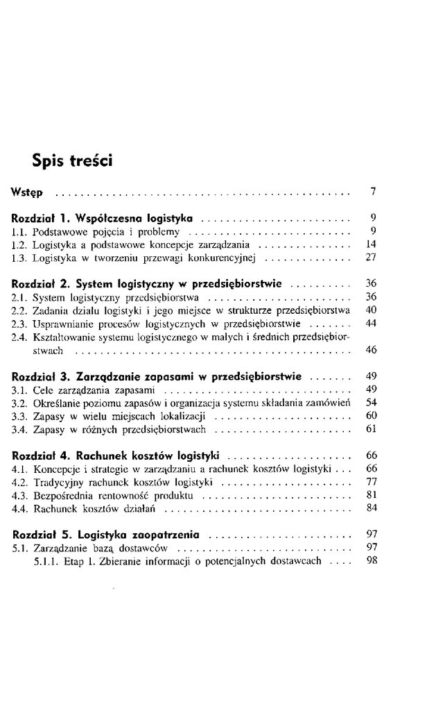 Spis treści Wstęp 7 Rozdział 1. W s p ó ł c z e s n a logistyka 9 1.1. Podstawowe pojęcia i problemy 1.2. Logistyka a podstawowe koncepcje zarządzania 1.3. Logistyka w tworzeniu przewagi konkurencyjnej 9 14 27 Rozdział 2. System logistyczny w przedsiębiorstwie 36 2.1. 2.2. 2.3. 2.4. 36 40 44 System logistyczny przedsiębiorstwa Zadania działu logistyki i jego miejsce w strukturze przedsiębiorstwa Usprawnianie procesów logistycznych w przedsiębiorstwie Kształtowanie systemu logistycznego w małych i średnich przedsiębior stwach 46 Rozdział 3. Z a r z ą d z a n i e zapasami w przedsiębiorstwie 49 3.1. 3.2. 3.3. 3.4. 49 54 60 61 Cele zarządzania zapasami Określanie poziomu zapasów i organizacja systemu składania zamówień Zapasy w wielu miejscach lokalizacji Zapasy w różnych przedsiębiorstwach Rozdział 4. Rachunek kosztów logistyki 66 4.1. 4.2. 4.3. 4.4. 66 77 81 84 Koncepcje i strategie w zarządzaniu a rachunek kosztów logistyki . . . Tradycyjny rachunek kosztów logistyki Bezpośrednia rentowność produktu Rachunek kosztów działań Rozdział 5. Logistyka zaopatrzenia 97 5.1. Zarządzanie bazą dostawców 5.1.1. Etap 1. Zbieranie informacji o potencjalnych dostawcach 97 98 .... (j Spis ireści 5.1.2. Etap 2. Wybór dostawców i ustalenie warunków współpracy . . . 5.1.3. Etap 3. Ocena dostawców i doskonalenie współpracy 5.1.4. Etap 4. Zakończenie współpracy 5.2. Organizacja działu zaopatrzenia 100 106 109 110 Rozdział 6. Logistyka produkcji 6.1. Obszary logistyki produkcji 6.2. Informatyczne wspomaganie zarządzania logistycznego 114 114 123 Rozdział 7. Logistyka dystrybucji 7.1. Istota i znaczenie logistycznej obsługi klienta 7.2. Elementy logistycznej obsługi klienta 7.3. Standardy logistycznej obsługi klienta 7.4. Pomiar i kontrola jakości obsługi klienta 128 128 133 139 146 Rozdział 8. Sieci dostaw 8.1. Sieci gospodarcze a sieci dostaw 8.2. Model zarządzania sieciami dostaw 8.3. Tworzenie sieci dostaw 8.3.1. Dobór uczestników i tworzenie relacji w ramach sieci 8.3.2. Informatyzacja i wizualizacja 8.4. Zarządzanie sieciami dostaw w praktyce 8.4.1. Przepływ informacji w sieci dostaw 8.4.2. Przepływ informacji między procesami w przedsiębiorstwie . . . 8.4.3. Integracja i przepływ informacji w łańcuchu klient-przedsiębiorstwo-dostawca 8.4.4. Struktura kosztów w sieci 8.4.5. Pomiar efektywności zarządzania siecią 8.5. Analiza przypadków — Apator S A 8.5.1. Wirtualna logistyka — zakup komponentów elektroniki 8.5.2. Wirtualna logistyka — integracja z dostawcami 8.6. Ankieta 149 149 160 170 172 177 182 183 185 186 189 193 195 195 200 205 Rozdział 9. Rynek usług logistycznych 9.1. Usługi logistyczne 9.2. Przedsiębiorstwa T S L 9.2.1. Schenker — strategia zorientowana na klienta 9.2.2. D H L — lider rynku operatorów logistycznych 9.2.3. T N T — drugi musi pracować ciężej na swój sukces 213 213 221 224 226 227 Bibliografia 235
