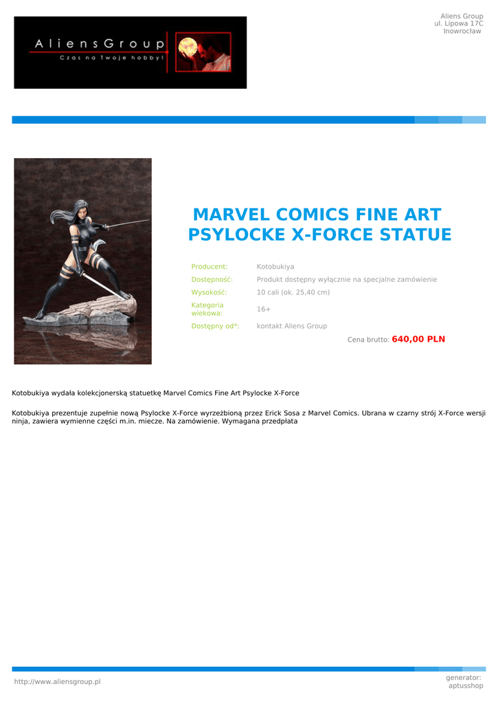 Aliens Group ul. Lipowa 17C Inowrocław MARVEL COMICS FINE ART PSYLOCKE X-FORCE STATUE Producent: Kotobukiya Dostępność: Produkt dostępny wyłącznie na specjalne zamówienie Wysokość: 10 cali (ok. 25,40 cm) Kategoria wiekowa: 16+ Dostępny od*: kontakt Aliens Group Cena brutto: 640,00 PLN Kotobukiya wydała kolekcjonerską statuetkę Marvel Comics Fine Art Psylocke X-Force Kotobukiya prezentuje zupełnie nową Psylocke X-Force wyrzeżbioną przez Erick Sosa z Marvel Comics. Ubrana w czarny strój X-Force wersji ninja, zawiera wymienne części m.in. miecze. Na zamówienie. Wymagana przedpłata http://www.aliensgroup.pl generator: aptusshop