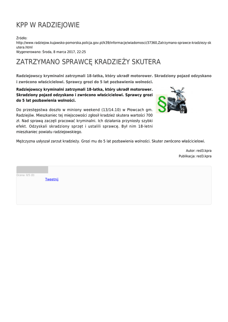 KPP W RADZIEJOWIE Źródło: http://www.radziejow.kujawsko-pomorska.policja.gov.pl/k39/informacje/wiadomosci/37360,Zatrzymano-sprawce-kradziezy-sk utera.html Wygenerowano: Środa, 8 marca 2017, 22:25 ZATRZYMANO SPRAWCĘ KRADZIEŻY SKUTERA Radziejowscy kryminalni zatrzymali 18-latka, który ukradł motorower. Skradziony pojazd odzyskano i zwrócono właścicielowi. Sprawcy grozi do 5 lat pozbawienia wolności. Radziejowscy kryminalni zatrzymali 18-latka, który ukradł motorower. Skradziony pojazd odzyskano i zwrócono właścicielowi. Sprawcy grozi do 5 lat pozbawienia wolności. Do przestępstwa doszło w miniony weekend (13/14.10) w Płowcach gm. Radziejów. Mieszkaniec tej miejscowości zgłosił kradzież skutera wartości 700 zł. Nad sprawą zaczęli pracować kryminalni. Ich działania przyniosły szybki efekt. Odzyskali skradziony sprzęt i ustalili sprawcę. Był nim 18-letni mieszkaniec powiatu radziejowskiego. Mężczyzna usłyszał zarzut kradzieży. Grozi mu do 5 lat pozbawienia wolności. Skuter zwrócono właścicielowi. Autor: red3.kpra Publikacja: red3.kpra Ocena: 0/5 (0) Tweetnij